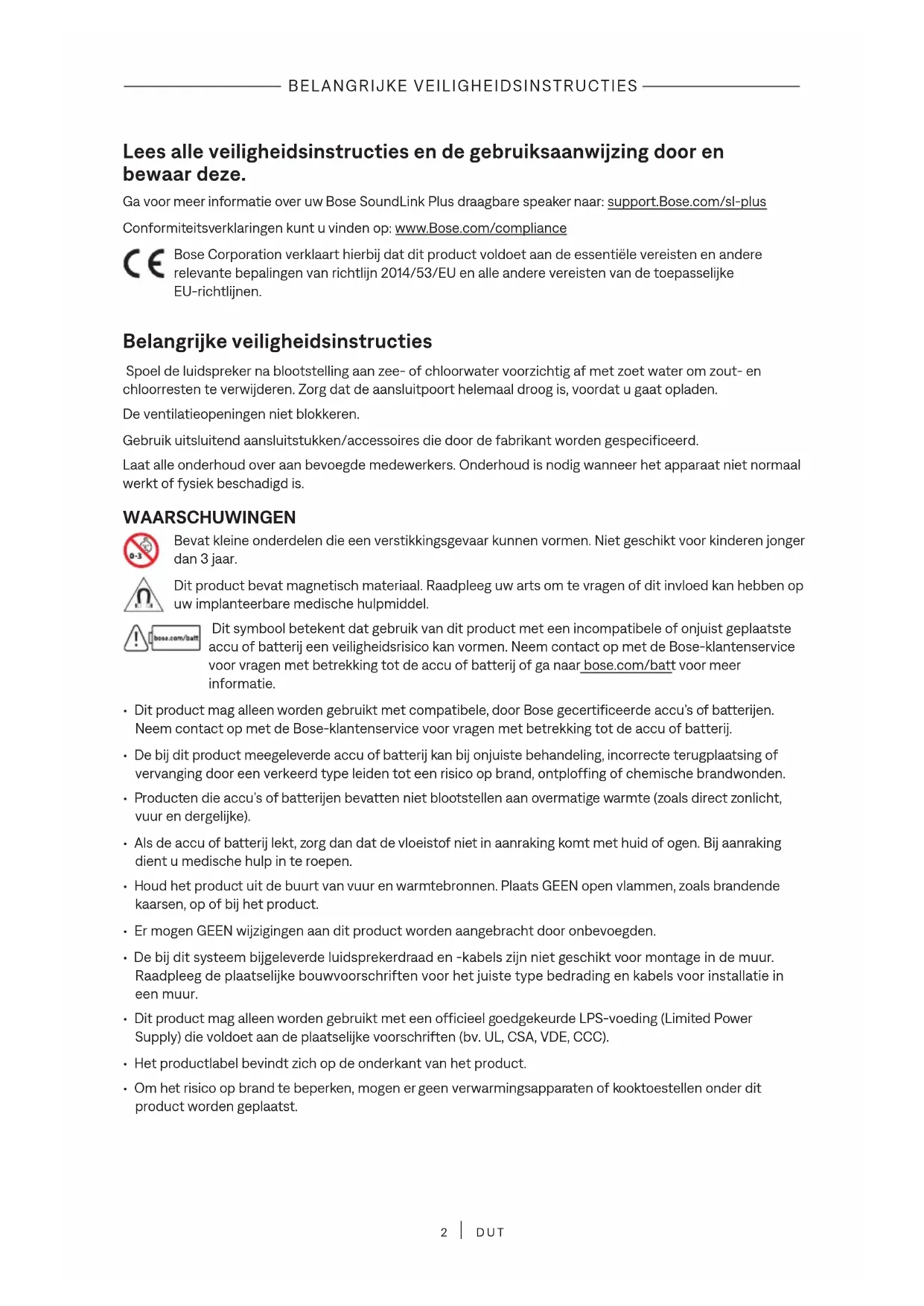 DUT Lees alle veiligheidsinstructies en de gebruiksaanwijzing door en bewaar deze. Ga voor meer informatie over uw Bose SoundLink Plus draagbare speaker naar: support.Bose.com/sl-plussupport.Bose.com/sl-plus Conformiteitsverklaringen kunt u vinden op: www.Bose.com/compliancewww.Bose.com/compliance Bose Corporation verklaart hierbij dat dit product voldoet aan de essentiële vereisten en andere relevante bepalingen van richtlijn 2014/53/EU en alle andere vereisten van de toepasselijke EU-richtlijnen. Belangrijke veiligheidsinstructies Spoel de luidspreker na blootstelling aan zee- of chloorwater voorzichtig af met zoet water om zout- en chloorresten te verwijderen. Zorg dat de aansluitpoort helemaal droog is, voordat u gaat opladen. De ventilatieopeningen niet blokkeren. Gebruik uitsluitend aansluitstukken/accessoires die door de fabrikant worden gespecificeerd. Laat alle onderhoud over aan bevoegde medewerkers. Onderhoud is nodig wanneer het apparaat niet normaal werkt of fysiek beschadigd is. WAARSCHUWINGEN Bevat kleine onderdelen die een verstikkingsgevaar kunnen vormen. Niet geschikt voor kinderen jonger dan 3 jaar. Dit product bevat magnetisch materiaal. Raadpleeg uw arts om te vragen of dit invloed kan hebben op uw implanteerbare medische hulpmiddel. Dit symbool betekent dat gebruik van dit product met een incompatibele of onjuist geplaatste accu of batterij een veiligheidsrisico kan vormen. Neem contact op met de Bose-klantenservice voor vragen met betrekking tot de accu of batterij of ga naar bose.com/batt voor meer informatie.