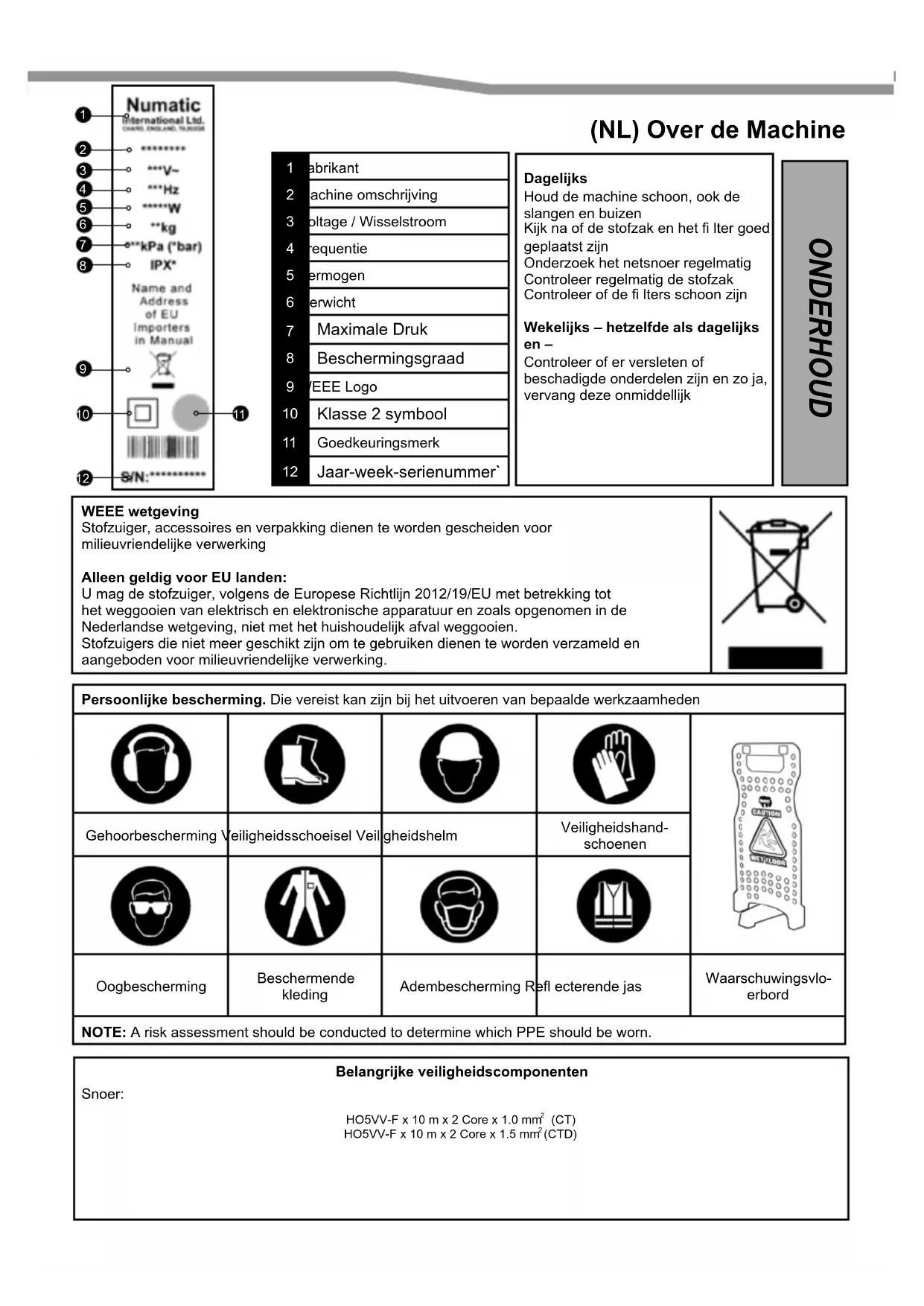 [Xi] R36/37/38 Classé produit irritant Phrases de risque : R36 / 38 : irritant pour les yeux et la peau Phrases de sécurité : S2 : Tenir hors de portée des enfants S24: Éviter le contact avec la peau et les yeux S37: Porter des gants appropriésPersoonlijke bescherming. Die vereist kan zijn bij het uitvoeren van bepaalde werkzaamheden Gehoorbescherming Veiligheidsschoeisel Veiligheidshelm Veiligheidshand- schoenen Oogbescherming Beschermende kleding Adembescherming Re ecterende jas Waarschuwingsvlo- erbord NOTE: A risk assessment should be conducted to determine which PPE should be worn. Belangrijke veiligheidscomponenten Snoer: WEEE wetgeving Stofzuiger, accessoires en verpakking dienen te worden gescheiden voor milieuvriendelijke verwerking Alleen geldig voor EU landen: U mag de stofzuiger, volgens de Europese Richtlijn 2012/19/EU met betrekking tot het weggooien van elektrisch en elektronische apparatuur en zoals opgenomen in de Nederlandse wetgeving, niet met het huishoudelijk afval weggooien. Stofzuigers die niet meer geschikt zijn om te gebruiken dienen te worden verzameld en aangeboden voor milieuvriendelijke verwerking. Dagelijks Houd de machine schoon, ook de slangen en buizen Kijk na of de stofzak en het lter goed geplaatst zijn Onderzoek het netsnoer regelmatig Controleer regelmatig de stofzak Controleer of de lters schoon zijn Wekelijks – hetzelfde als dagelijks en – Controleer of er versleten of beschadigde onderdelen zijn en zo ja, vervang deze onmiddellijk ONDERHOUD (NL) Over de Machine 1 Fabrikant 2 Machine omschrijving 3 Voltage / Wisselstroom 4 Frequentie 5 Vermogen 6 Gerwicht