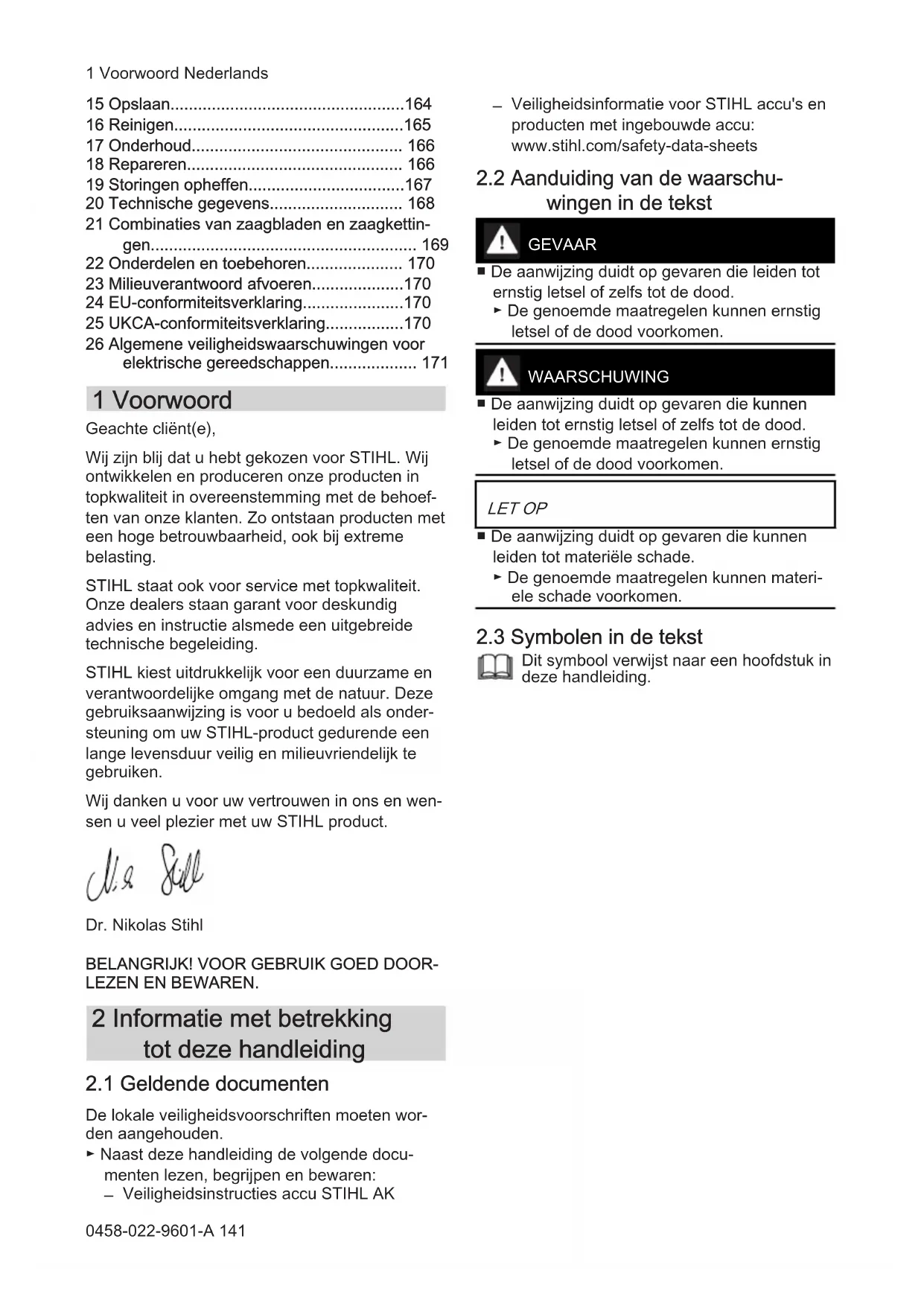 - 26 Algemene veiligheidswaarschuwingen voor elektrische gereedschappen 1 Voorwoord Geachte cliënt(e), Wij zijn blij dat u hebt gekozen voor STIHL. Wij ontwikkelen en produceren onze producten in topkwaliteit in overeenstemming met de behoef‐ ten van onze klanten. Zo ontstaan producten met een hoge betrouwbaarheid, ook bij extreme belasting. STIHL staat ook voor service met topkwaliteit. Onze dealers staan garant voor deskundig advies en instructie alsmede een uitgebreide technische begeleiding. STIHL kiest uitdrukkelijk voor een duurzame en verantwoordelijke omgang met de natuur. Deze gebruiksaanwijzing is voor u bedoeld als onder‐ steuning om uw STIHL-product gedurende een lange levensduur veilig en milieuvriendelijk te gebruiken. Wij danken u voor uw vertrouwen in ons en wen‐ sen u veel plezier met uw STIHL product. Dr. Nikolas Stihl p. 171