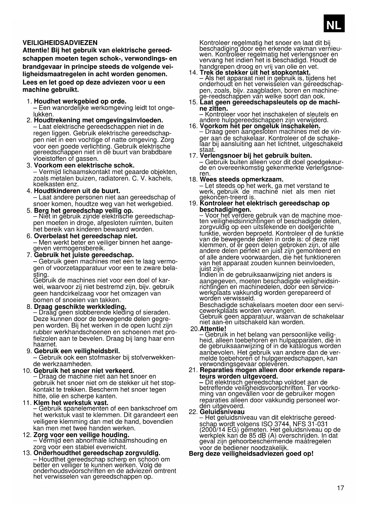 – Het geluidsniveau van dit elektrische gereed- schap wordt volgens ISO 3744, NFS 31-031 (2000/14 EG) gemeten. Het geluidsniveau op de werkplek kan de 85 dB (A) overschrijden. In dat geval zijn gehoorbeschermende maatregelen voor de bediener noodzakelijk. Berg deze veiligheidsadviezen goed op!NL