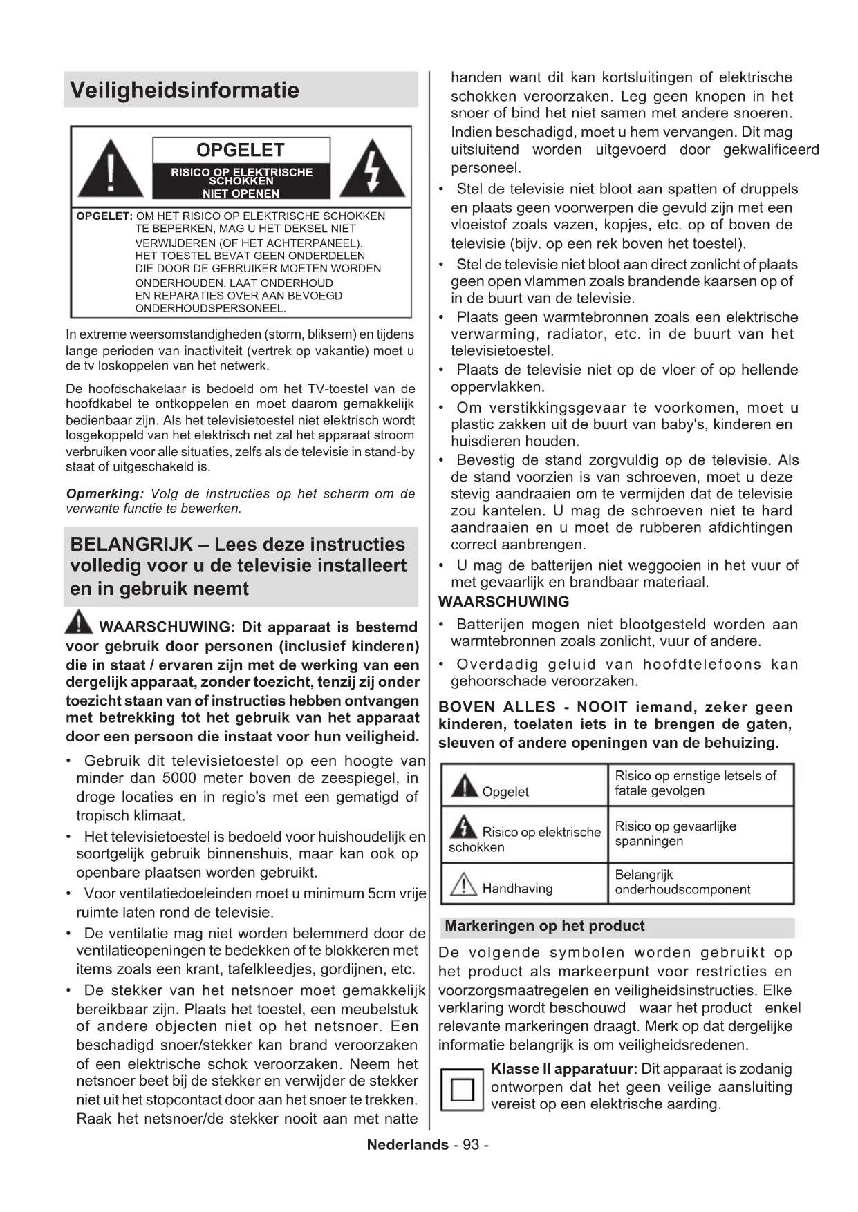 personeel. Stel de televisie niet bloot aan spatten of druppels en plaats geen voorwerpen die gevuld zijn met een vloeistof zoals vazen, kopjes, etc. op of boven de televisie (bijv. op een rek boven het toestel). Stel de televisie niet bloot aan direct zonlicht of plaats geen open vlammen zoals brandende kaarsen op of in de buurt van de televisie. Plaats geen warmtebronnen zoals een elektrische verwarming, radiator, etc. in de buurt van het televisietoestel. Plaats de televisie niet op de vloer of op hellende oppervlakken. Om verstikkingsgevaar te voorkomen, moet u plastic zakken uit de buurt van baby's, kinderen en huisdieren houden. Bevestig de stand zorgvuldig op de televisie. Als de stand voorzien is van schroeven, moet u deze stevig aandraaien om te vermijden dat de televisie zou kantelen. U mag de schroeven niet te hard aandraaien en u moet de rubberen afdichtingen correct aanbrengen. U mag de batterijen niet weggooien in het vuur of met gevaarlijk en brandbaar materiaal. WAARSCHUWING Batterijen mogen niet blootgesteld worden aan warmtebronnen zoals zonlicht, vuur of andere. Overdadig geluid van hoofdtelefoons kan gehoorschade veroorzaken. BOVEN ALLES - NOOIT iemand, zeker geen kinderen, toelaten iets in te brengen de gaten, sleuven of andere openingen van de behuizing. Opgelet Risico op ernstige letsels of fatale gevolgen Risico op elektrische schokkenRisico op gevaarlijke spanningen Handhaving Belangrijk onderhoudscomponent Markeringen op het product De volgende symbolen worden gebruikt op het product als markeerpunt voor restricties en voorzorgsmaatregelen en veiligheidsinstructies. Elke