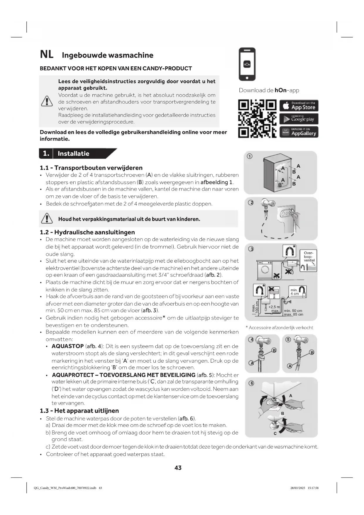 Draai de knop naar een andere positie dan BEDIENING OP AFSTAND (Wi-Fi) zonder langs de “OFF” (UIT)-stand te passeren. Als er een cyclus in gang is, wordt hiermee verder gegaan. Vanuit de app is het mogelk om de status van het product te bekken, maar niet om het te bedienen. Indicatielampje toetsvergrendeling (5): Dit indicatielampje geeft aan dat de toetsvergrendeling is ingeschakeld. Indicatielampjes wastemperatuur (6) De indicatielampjes geven de wastemperatuur van het geselecteerde programma zien. Deze kan gewzigd worden (waar toegestaan) door de betreffende toets in te drukken. Wanneer u een koude was wilt draaien, moeten alle indicators uitstaan. Download de -app Alleen 2,4GHz-band Volg de koppelingsinstruces hOn-app Thuis-wifi: - Naam - Wachtwoord QG_Candy_WM_ProWash400_70070922.indb 46QG_Candy_WM_ProWash400_70070922.indb 46 28/03/2025 15:18:0128/03/2025 15:18:0147 Indicatielampjes centrifugeersnelheid (7) De indicatielampjes geven de centrifugeersnelheid van het geselecteerde programma aan. U kunt deze met de betreffende knop verlagen of overslaan. Indicatielampjes opties (8) De indicatielampjes geven de opties weer die geselecteerd kunnen worden met de betreffende toets. Indicatielampjes Vlekkenniveau (9)