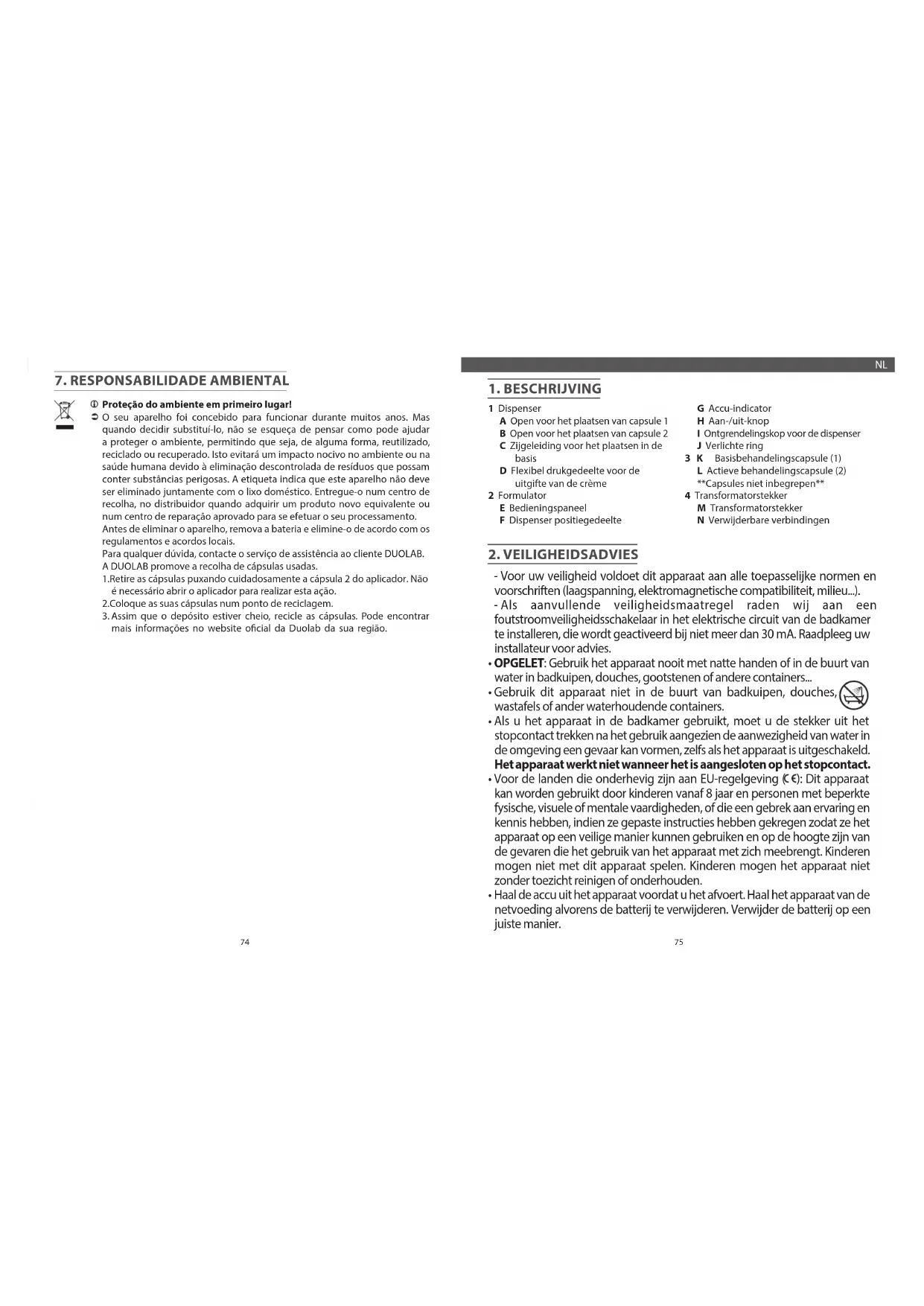 Laten we helpen bij het beschermen van het milieu Uw apparaat is ontworpen om vele jaren mee te gaan. Maar als u besluit het te vervangen, denk er dan aan dat u kunt helpen bij de bescherming van het milieu door het te hergebruiken, recyclen of op een andere manier opnieuw in te zetten. Dit voorkomt enige schadelijke invloed op het milieu of de menselijke gezondheid als gevolg van een ongecontroleerde verwijdering van afval dat gevaarlijke stoen kan bevatten. Dit label geeft aan dat dit product niet via het huishoudelijk afval mag worden afgevoerd. Lever het in bij een inzamelpunt, de verkoper als u een vergelijkbaar nieuw product koopt of een erkend servicecentrum voor de juiste verwerking hiervan. Voordat u het apparaat afvoert, moet u de accu verwijderen en volgens de voorschriften en lokale wetten afvoeren. Mocht u vragen hebben, kunt u contact opnemen met de klantenservice van DUOLAB. DUOLAB ondersteunt het verzamelen van gebruikte capsules. . 1 Verwijder uw capsules door capsule 2 voorzichtig uit de dispenser te trekken. Hiervoor hoeft u de dispenser niet te openen. . 2 Bewaar uw capsules in de recyclebak. . 3 Als de bak vol is, kunt u de capsules recyclen. Meer informatie vindt u op de ociële Duolab-website voor uw regio. UW CRÈME MORST EN LOOPT UIT IN HET APPARAAT:
