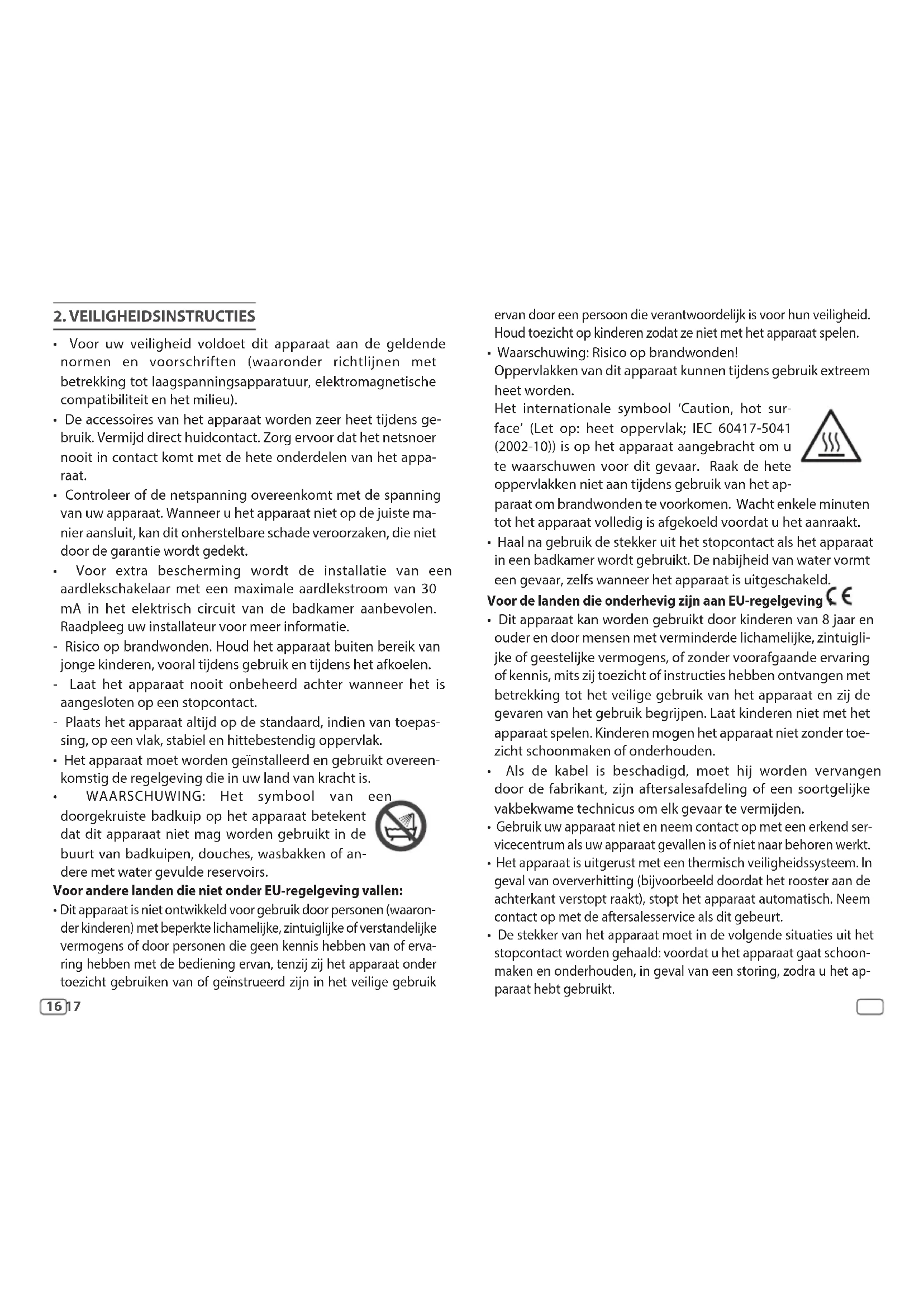 - Voor extra bescherming wordt de installatie van een aardlekschakelaar met een maximale aardlekstroom van 30 mA in het elektrisch circuit van de badkamer aanbevolen. Raadpleeg uw installateur voor meer informatie. - Risico op brandwonden. Houd het apparaat buiten bereik van jonge kinderen, vooral tijdens gebruik en tijdens het afkoelen. - Laat het apparaat nooit onbeheerd achter wanneer het is aangesloten op een stopcontact. - Plaats het apparaat altijd op de standaard, indien van toepas- sing, op een vlak, stabiel en hittebestendig oppervlak.