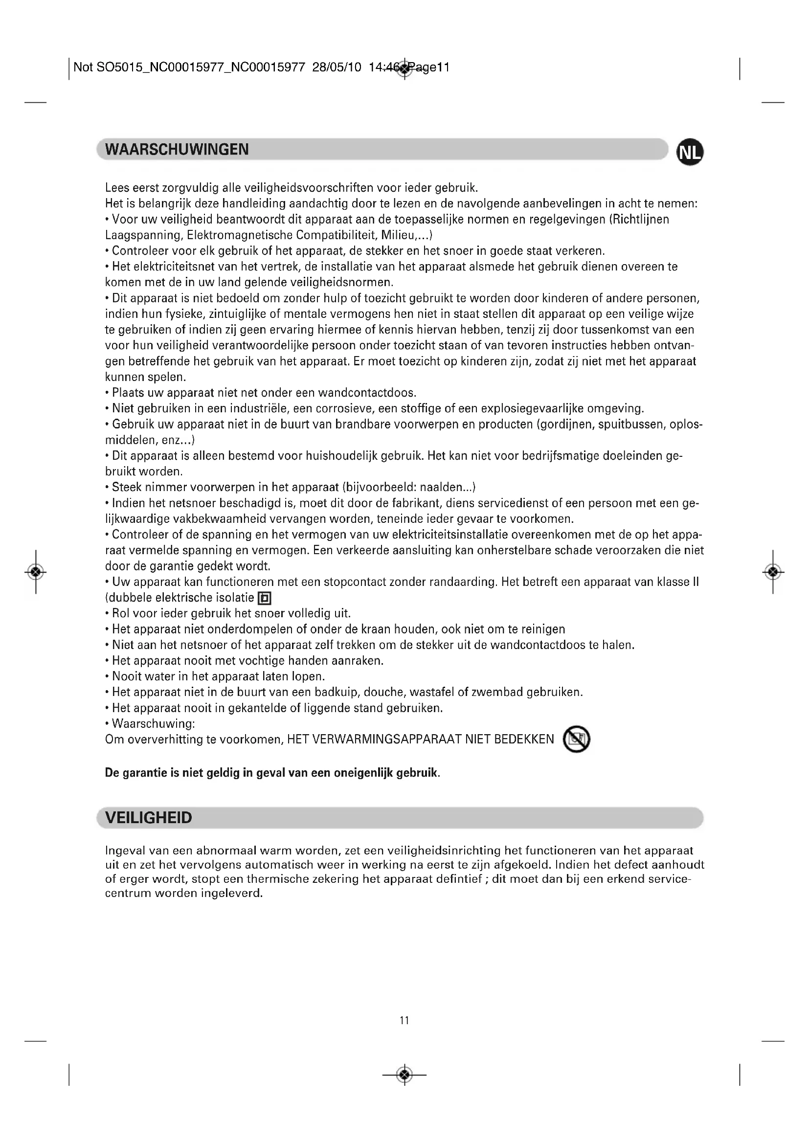 Not SO5015_NC00015977_NC00015977 28/05/10 14:46 Page1011 WAARSCHUWINGEN Lees eerst zorgvuldig alle veiligheidsvoorschriften voor ieder gebruik. Het is belangrijk deze handleiding aandachtig door te lezen en de navolgende aanbevelingen in acht te nemen: