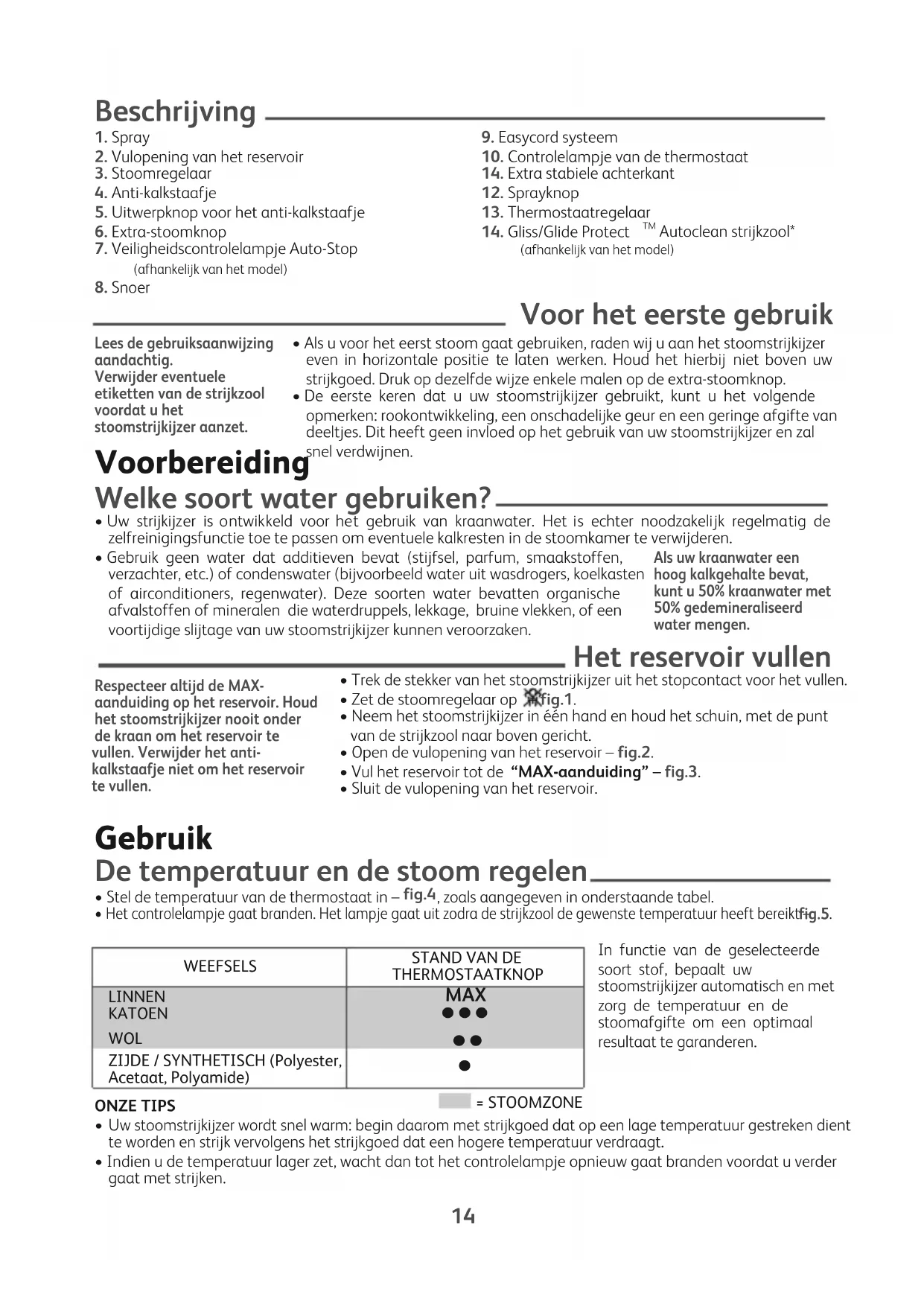 - Indien u de temperatuur lager zet, wacht dan tot het controlelampje opnieuw gaat branden voordat u verder gaat met strijken. Lees de gebruiksaanwijzing aandachtig. Verwijder eventuele etiketten van de strijkzool voordat u het stoomstrijkijzer aanzet. Respecteer altijd de MAX- aanduiding op het reservoir. Houd het stoomstrijkijzer nooit onder de kraan om het reservoir te vullen. Verwijder het anti- kalkstaafje niet om het reservoir te vullen. Als uw kraanwater een hoog kalkgehalte bevat, kunt u 50% kraanwater met 50% gedemineraliseerd water mengen. = STOOMZONE WEEFSELS