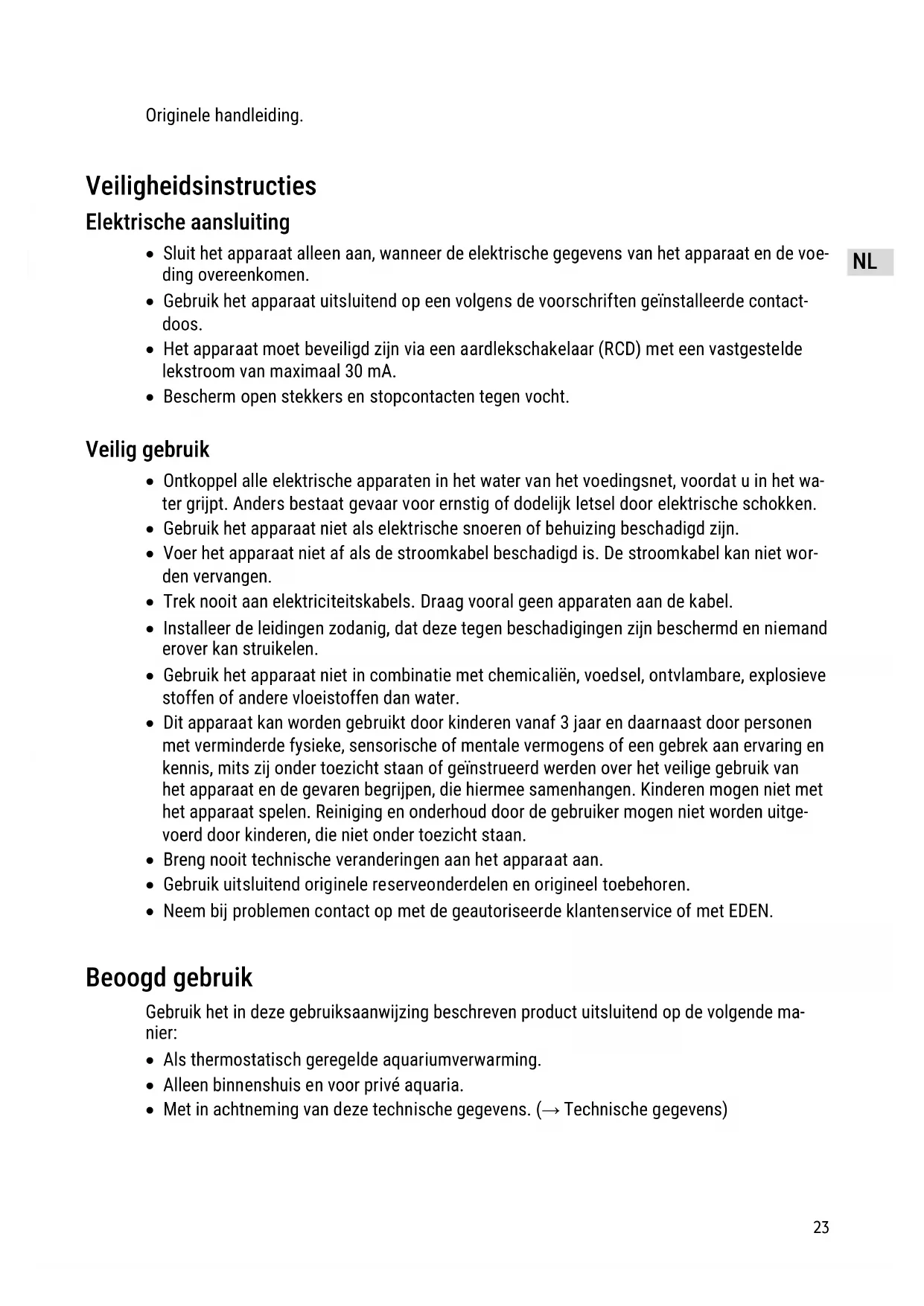 - Neem bij problemen contact op met de geautoriseerde klantenservice of met EDEN. Beoogd gebruik Gebruik het in deze gebruiksaanwijzing beschreven product uitsluitend op de volgende ma- nier: