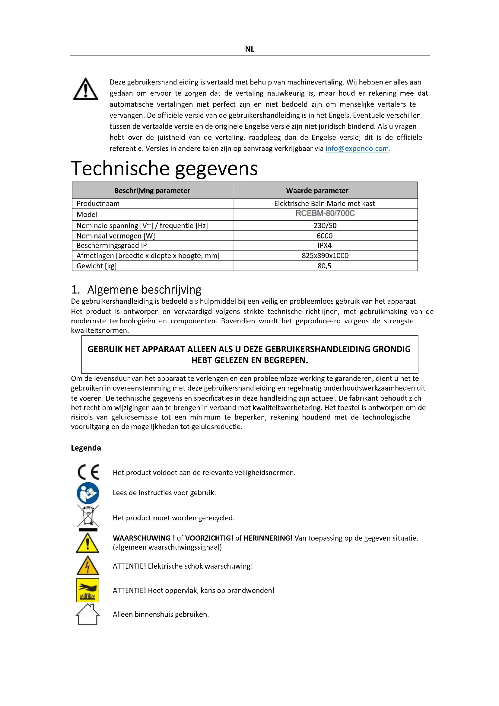 Deze gebruikershandleiding is vertaald met behulp van machinevertaling. Wij hebben er alles aan gedaan om ervoor te zorgen dat de vertaling nauwkeurig is, maar houd er rekening mee dat automatische vertalingen niet perfect zijn en niet bedoeld zijn om menselijke vertalers te vervangen. De officiële versie van de gebruikershandleiding is in het Engels. Eventuele verschillen tussen de vertaalde versie en de originele Engelse versie zijn niet juridisch bindend. Als u vragen hebt over de juistheid van de vertaling, raadpleeg dan de Engelse versie; dit is de officiële referentie. Versies in andere talen zijn op aanvraag verkrijgbaar via info@expondo.com. Technische gegevens Beschrijving parameter Waarde parameter Productnaam Elektrische Bain Marie met kast Model