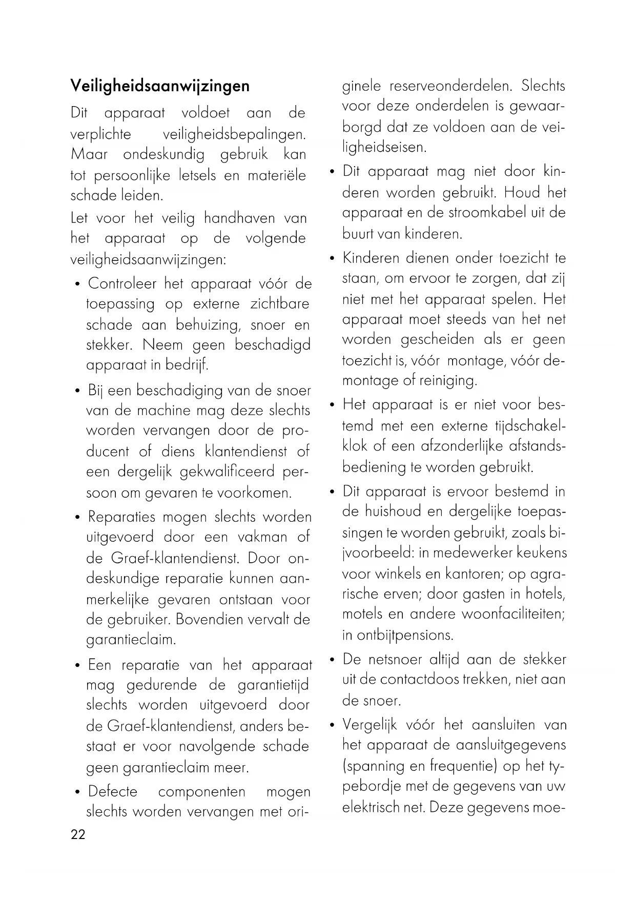 - Reparaties mogen slechts worden uitgevoerd door een vakman of de Graef-klantendienst. Door on- deskundige reparatie kunnen aan- merkelijke gevaren ontstaan voor de gebruiker. Bovendien vervalt de garantieclaim.