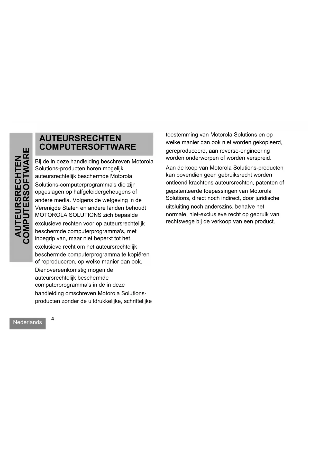 AUTEURSRECHTEN COMPUTERSOFTWARE AUTEURSRECHTEN COMPUTERSOFTWARE Bij de in deze handleiding beschreven Motorola Solutions-producten horen mogelijk auteursrechtelijk beschermde Motorola Solutions-computerprogramma's die zijn opgeslagen op halfgeleidergeheugens of andere media. Volgens de wetgeving in de Verenigde Staten en andere landen behoudt MOTOROLA SOLUTIONS zich bepaalde exclusieve rechten voor op auteursrechtelijk beschermde computerprogramma's, met inbegrip van, maar niet beperkt tot het exclusieve recht om het auteursrechtelijk beschermde computerprogramma te kopiëren of reproduceren, op welke manier dan ook. Dienovereenkomstig mogen de auteursrechtelijk beschermde computerprogramma's in de in deze handleiding omschreven Motorola Solutions- producten zonder de uitdrukkelijke, schriftelijke toestemming van Motorola Solutions en op welke manier dan ook niet worden gekopieerd, gereproduceerd, aan reverse-engineering worden onderworpen of worden verspreid. Aan de koop van Motorola Solutions-producten kan bovendien geen gebruiksrecht worden ontleend krachtens auteursrechten, patenten of gepatenteerde toepassingen van Motorola Solutions, direct noch indirect, door juridische uitsluiting noch anderszins, behalve het normale, niet-exclusieve recht op gebruik van rechtswege bij de verkoop van een product. 63M03_A_BRCAN_nl.book Page 4 Sunday, November 18, 2018 9:29 PMNederlands