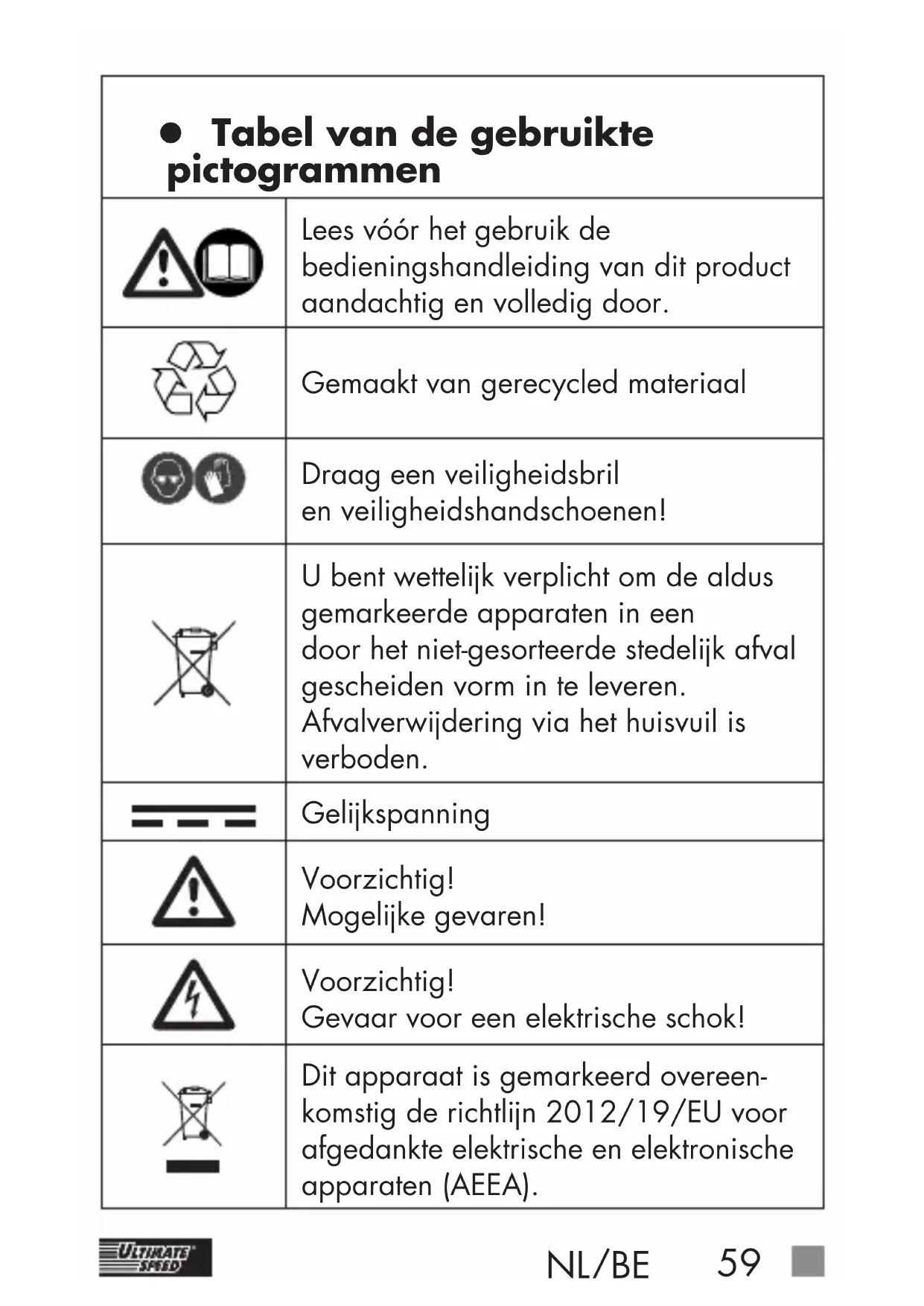 z Tabel van de gebruikte pictogrammen Lees vóór het gebruik de bedieningshandleiding van dit product aandachtig en volledig door. Gemaakt van gerecycled materiaal Draag een veiligheidsbril en veiligheidshandschoenen! U bent wettelijk verplicht om de aldus gemarkeerde apparaten in een door het niet-gesorteerde stedelijk afval gescheiden vorm in te leveren. Afvalverwijdering via het huisvuil is verboden. Gelijkspanning Voorzichtig! Mogelijke gevaren! Voorzichtig! Gevaar voor een elektrische schok! Dit apparaat is gemarkeerd overeen- komstig de richtlijn 2012/19/EU voor afgedankte elektrische en elektronische apparaten (AEEA).60 NL/BE Voer de verpakking en het apparaat op een milieuvriendelijke wijze af! Accu- en generatortester UAWSB 2 D2 z Inleiding Hartelijk gefeliciteerd! U hebt gekozen voor één van onze hoogwaardige producten. De bedienings- handleiding is een bestanddeel van dit product. Deze omvat belangrijke aanwijzingen over de veiligheid, het gebruik en de afvalverwijdering. Maak uzelf voor het gebruik vertrouwd met alle gebruiks- en veiligheidsin- structies. Gebruik het product alleen zoals beschreven en voor de aangegeven toepassingsgebieden. Overhandig ook alle documenten bij overdracht van het product aan derden. Het apparaat mag uitsluitend door geïnstrueerde personen in gebruik worden genomen. BUITEN HET BEREIK VAN KINDEREN HOUDEN! z Gebruik volgens de voorschriften Het apparaat dient voor de controle van de laadtoestand van een 6V- resp. 12V-accu. Tevens kan de laadfunctie van de generator worden getest. Schade door niet-in- achtneming en verkeerd gebruik wordt niet door de garantie gedekt en valt niet onder de aansprakelijkheid van de fabrikant. Het apparaat is niet bestemd voorNL/BE