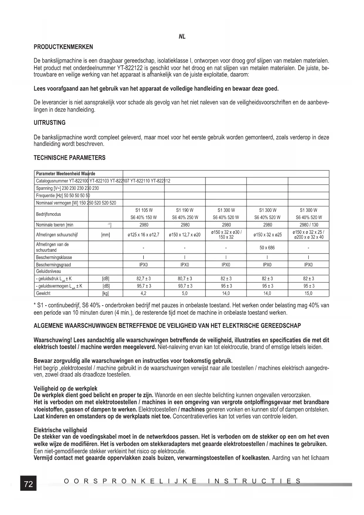 OORSPRONKELIJKE INSTRUCTIES PRODUCTKENMERKEN De bankslijpmachine is een draagbaar gereedschap, isolatieklasse I, ontworpen voor droog grof slijpen van metalen materialen. Het product met onderdeelnummer YT-822122 is geschikt voor het droog en nat slijpen van metalen materialen. De juiste, be- trouwbare en veilige werking van het apparaat is afhankelijk van de juiste exploitatie, daarom: Lees voorafgaand aan het gebruik van het apparaat de volledige handleiding en bewaar deze goed. De leverancier is niet aansprakelijk voor schade als gevolg van het niet naleven van de veiligheidsvoorschriften en de aanbeve- lingen in deze handleiding. UITRUSTING De bankslijpmachine wordt compleet geleverd, maar moet voor het eerste gebruik worden gemonteerd, zoals verderop in deze handleiding wordt beschreven. TECHNISCHE PARAMETERS Parameter Meeteenheid Waarde Catalogusnummer YT-822100 YT-822103 YT-822107 YT-822110 YT-822112 Spanning [V~] 230 230 230 230 230 Frequentie [Hz] 50 50 50 50 50 Nominaal vermogen [W] 150 250 520 520 520 Bedrijfsmodus S1 105 W S6 40% 150 W S1 190 W S6 40% 250 W S1 300 W S6 40% 520 W S1 300 W S6 40% 520 W S1 300 W S6 40% 520 W Nominale toeren [min