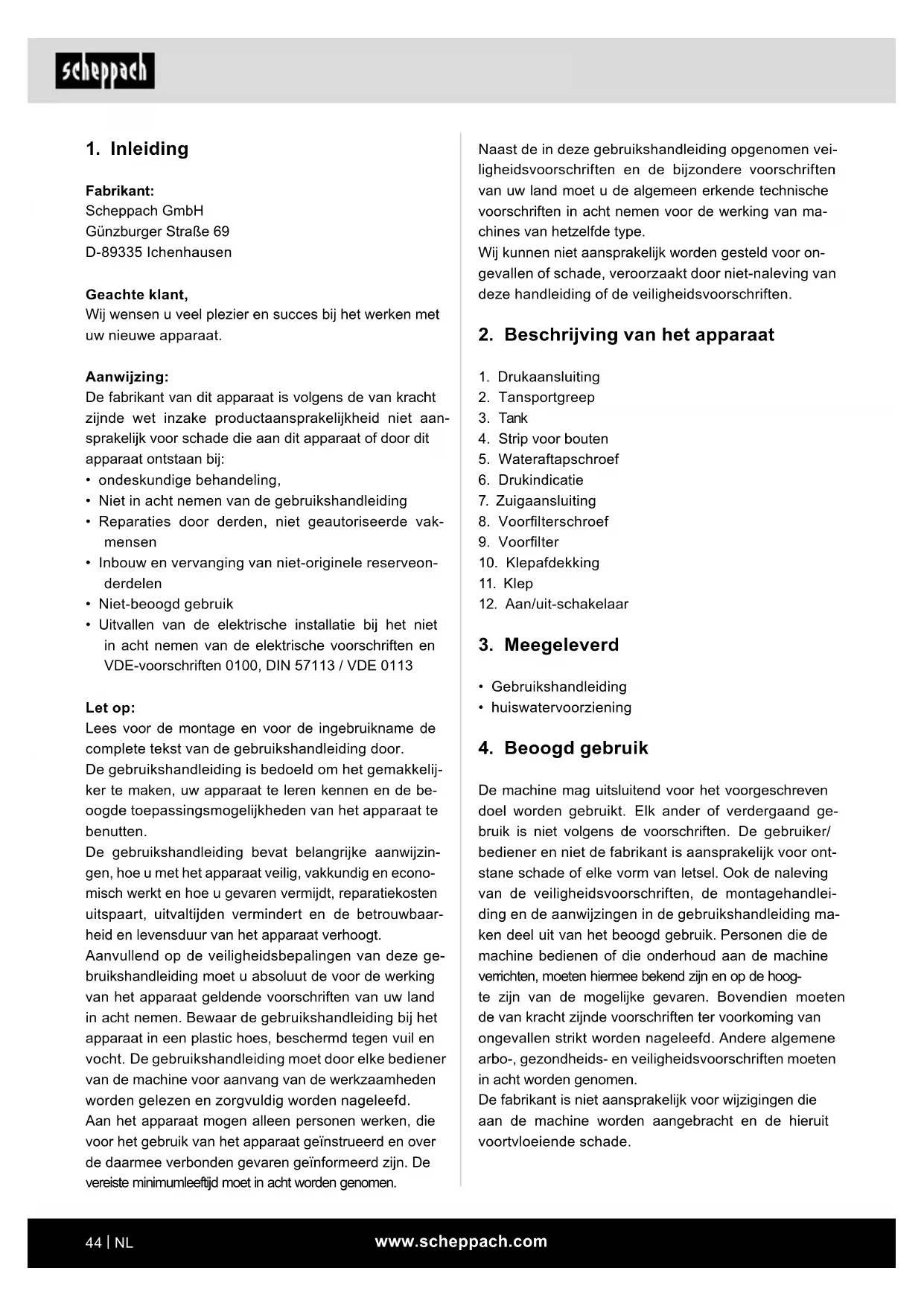 Fabrikant: Scheppach GmbH Günzburger Straße 69 D-89335 Ichenhausen Geachte klant, Wij wensen u veel plezier en succes bij het werken met uw nieuwe apparaat. Aanwijzing: De fabrikant van dit apparaat is volgens de van kracht zijnde wet inzake productaansprakelijkheid niet aan- sprakelijk voor schade die aan dit apparaat of door dit apparaat ontstaan bij: