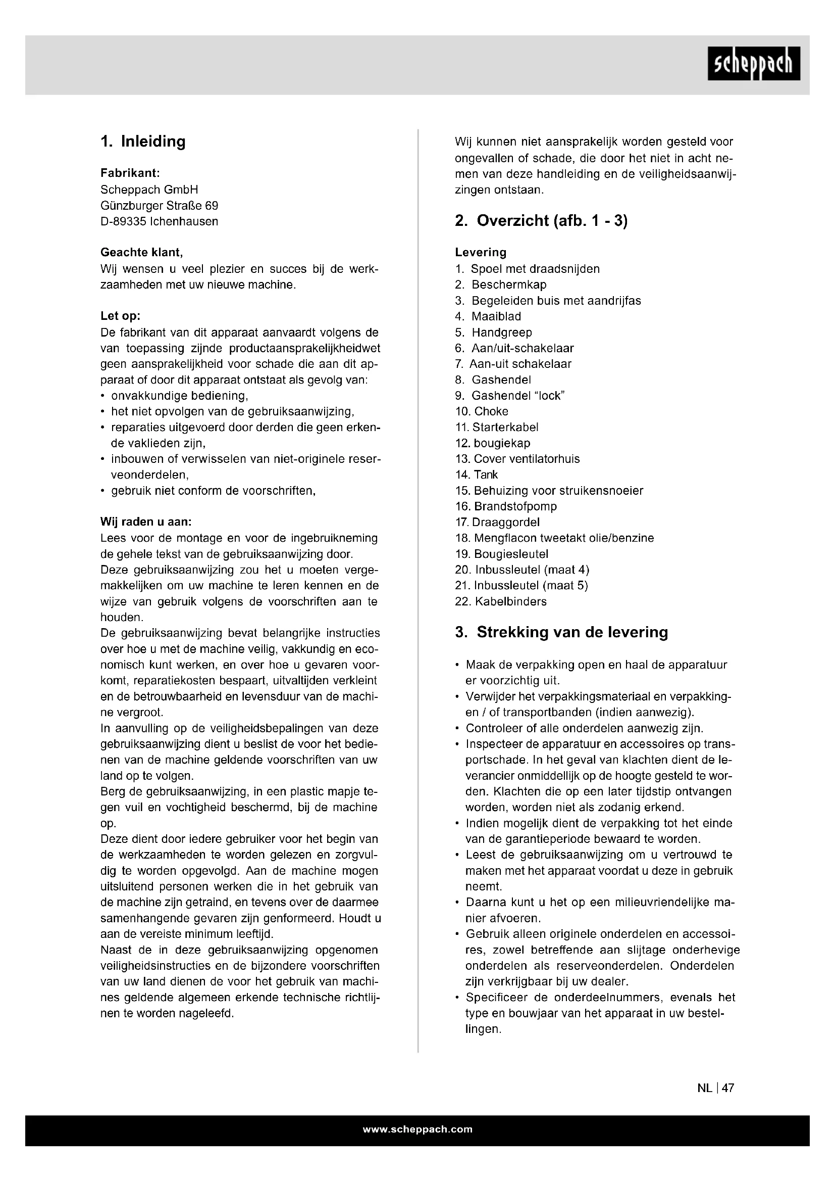 Fabrikant: Scheppach GmbH Günzburger Straße 69 D-89335 Ichenhausen Geachte klant, Wij wensen u veel plezier en succes bij de werk- zaamheden met uw nieuwe machine. Let op: De fabrikant van dit apparaat aanvaardt volgens de van toepassing zijnde productaansprakelijkheidwet geen aansprakelijkheid voor schade die aan dit ap- paraat of door dit apparaat ontstaat als gevolg van: