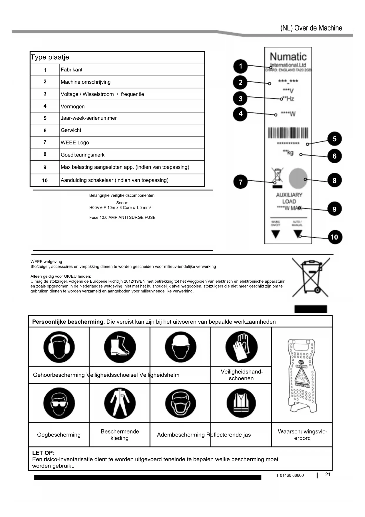 WEEE wetgevingStofzuiger, accessoires en verpakking dienen te worden gescheiden voor milieuvriendelijke verwerking Alleen geldig voor UK/EU landen: U mag de stofzuiger, volgens de Europese Richtlijn 2012/19/EN met betrekking tot het weggooien van elektrisch en elektronische apparatuur en zoals opgenomen in de Nederlandse wetgeving, niet met het huishoudelijk afval weggooien, stofzuigers die niet meer geschikt zijn om te gebruiken dienen te worden verzameld en aangeboden voor milieuvriendelijke verwerking.Belangrijke veiligheidscomponenten Snoer:H05VV-F 10m x 3 Core x 1.5 mm² Fuse 10.0 AMP ANTI SURGE FUSE Persoonlijke bescherming. Die vereist kan zijn bij het uitvoeren van bepaalde werkzaamheden Gehoorbescherming Veiligheidsschoeisel Veiligheidshelm Veiligheidshand- schoenen Oogbescherming Beschermende kleding Adembescherming Reecterende jas Waarschuwingsvlo- erbord LET OP: Een risico-inventarisatie dient te worden uitgevoerd teneinde te bepalen welke bescherming moet worden gebruikt.22 www.numatic.com WAARSCHUWING! Zorg ervoor dat u voor gebruik van dit apparaat eerst de gebruiksaanwijzing leest. Gebruikers dienen goed geïnstrueerd te zijn voordat ze dit soort apparaat bedienen. Zoals bij alle elektrische apparatuur dient tijdens gebruik steeds de nodige zorgvuldigheid in acht te worden genomen en bovendien dient regelmatig periodiek en preventief onderhoud te worden uitgevoerd om de veiligheid van het apparaat te kunnen garanderen. Als noodzakelijk onderhoud niet naar behoren wordt uitgevoerd, hetgeen ook het vervangen van onderdelen door inferieure onderdelen omvat, kan het apparaat onveilig worden. De fabrikant kan hiervoor echter niet aansprakelijk worden gesteld. Dit apparaat is uitsluitend voor DROOG GEBRUIK bestemd. VOORDAT reiniging of onderhoud plaatsvindt en bij het vervangen van onderdelen of het aanpassen aan een andere functie, dient de stekker van het apparaat uit het stopcontact te worden getrokken zodat dit niet op het stroomnet is aangesloten. Dit apparaat is bedoeld om te worden gemonteerd, gereinigd en onderhouden door een volwassene. Deze machine mag niet worden gebruikt voor het opzuigen van biologisch gevaarlijk materiaal, gevaarlijk of explosief stof. Neem contact op met uw plaatselijke distributeur als u een apparaat wenst dat dit wel kan. Deze machine mag niet worden gebruikt door kinderen of personen met verminderde lichamelijke, zintuiglijke of geestelijke vermogens, of met een gebrek aan ervaring of kennis. Laat het netsnoer niet in contact komen met roterende borstels (indien gemonteerd). De elektrische aansluiting op de stofzuiger (indien gemonteerd) uitsluitend gebruiken voor de in de handleiding aangegeven doeleinden. ATTENTIE De stofzuiger mag niet buiten worden opgeslagen, of worden gebruikt in een natte omgeving of voor het opzuigen van nat materiaal. De stofzuiger dient op een droge plek te worden bewaard en binnen te worden gebruikt. Zorg ervoor dat het geïnstalleerde ltersysteem van het apparaat geschikt is voor het op te zuigen materiaal. OPMERKING Dit product voldoet aan de eisen van clausule 20 van IEC/EN 60335-2-69 Stabiliteit en mechanische risico’s. Het primaire gebruik van deze machine is bedrijfsmatig, bijvoorbeeld in hotels, scholen, ziekenhuizen, fabrieken, winkels en kantoren. Trek, indien de stofzuiger niet meer werkt, eerst de stekker uit het stopcontact alvorens te onderzoeken wat de oorzaak is. Als de stofzuiger verstopt raakt, schakel deze dan uit, trek de stekker uit het stopcontact en controleer het mondstuk, de buizen en de slang. Plaats, indien het mondstuk, de buizen en de slang vrij zijn, de stofzak terug en maak het lter schoon. De stofzuiger dient na gebruik op beschadiging te worden gecontroleerd. Het spannings indicator lampje gaat branden als de stofzuiger is aangesloten op een geschikte stroombron.