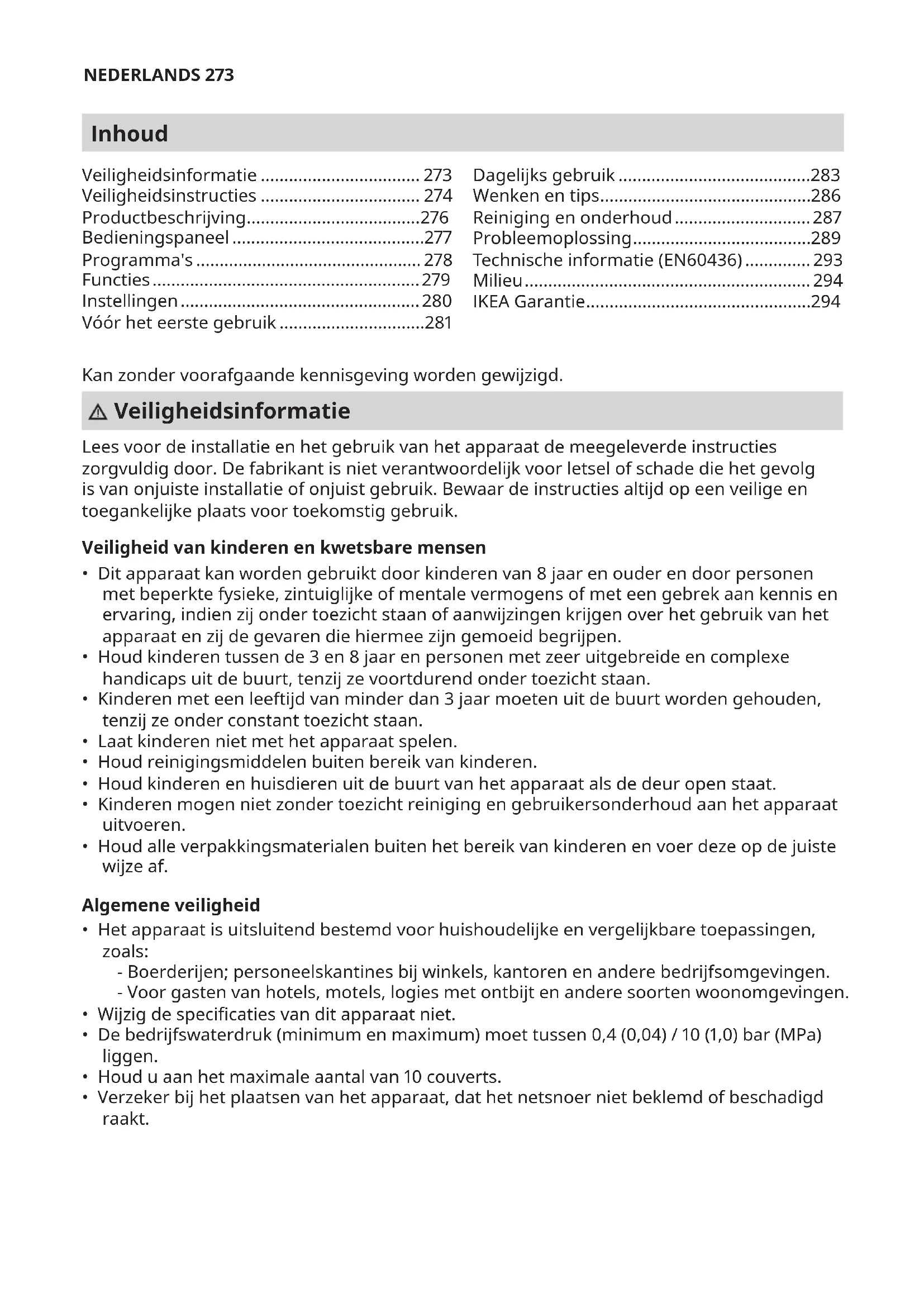 - Verzeker bij het plaatsen van het apparaat, dat het netsnoer niet beklemd of beschadigd raakt. Veiligheidsinformatie .................................. 273 Veiligheidsinstructies .................................. 274 Productbeschrijving ..................................... 276 Bedieningspaneel .........................................277 Programma's ................................................ 278 Functies ......................................................... 279 Instellingen ................................................... 280 Vóór het eerste gebruik ...............................281 Dagelijks gebruik .........................................283 Wenken en tips .............................................286 Reiniging en onderhoud ............................. 287 Probleemoplossing ......................................289 Technische informatie (EN60436) .............. 293 Milieu .............................................................294 IKEA Garantie ................................................294NEDERLANDS 274
