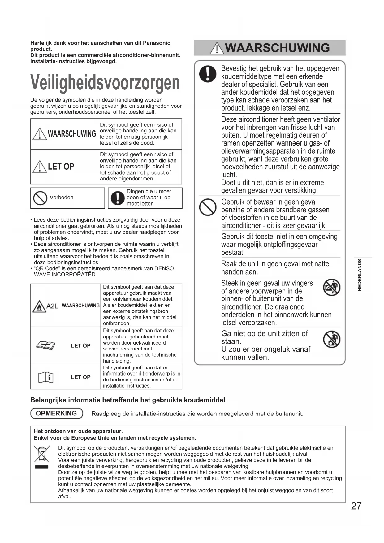 In caso di mancanza di corrente durante il funzionamento dell’unità L’unità riprende automaticamente il funzionamento. Saranno usate le impostazioni di funzionamento precedenti la mancanza di corrente. AVVISO In questo condizionatore d’aria è incorporato un prodotto biocida. I radicali liberi generati dal dispositivo incorporato nel condizionatore d’aria hanno la capacità di inibilre gli inquinanti, quali alcuni tipi di batteri, virus e mue.Sostanze attive: radicali liberi generati in situ dall’aria dell’ambiente o dall’acqua Utilizzo: la funzione di questo dispositivo si attiva/disattiva mediante il pulsante con l’icona “nanoe X” o mediante le impostazioni del telecomando se non vi è alcun pulsante con l’icona “nanoe X”. Fare riferimento a “Come utilizzare” per ulteriori informazioni. Per maggiori informazioni sul funzionamento, scansionare il codice QR sulla prima pagina e leggere le istruzioni per l’uso dettagliate. Meccanismo di funzionamento 00_360661_all.indb 2600_360661_all.indb 26 2024/10/07 17:19:332024/10/07 17:19:3327 NEDERLANDSHartelijk dank voor het aanschaen van dit Panasonic product.Dit product is een commerciële airconditioner-binnenunit.Installatie-instructies bijgevoegd. WAARSCHUWING Veiligheidsvoorzorgen De volgende symbolen die in deze handleiding worden gebruikt wijzen u op mogelijk gevaarlijke omstandigheden voor gebruikers, onderhoudspersoneel of het toestel zelf: WAARSCHUWING Dit symbool geeft een risico of onveilige handeling aan die kan leiden tot ernstig persoonlijk letsel of zelfs de dood. LET OP Dit symbool geeft een risico of onveilige handeling aan die kan leiden tot persoonlijk letsel of tot schade aan het product of andere eigendommen.VerbodenDingen die u moet doen of waar u op moet lettenBelangrijke informatie betreende het gebruikte koudemiddelOPMERKING Raadpleeg de installatie-instructies die worden meegeleverd met de buitenunit.Het ontdoen van oude apparatuur. Enkel voor de Europese Unie en landen met recycle systemen. Dit symbool op de producten, verpakkingen en/of begeleidende documenten betekent dat gebruikte elektrische en elektronische producten niet samen mogen worden weggegooid met de rest van het huishoudelijk afval.Voor een juiste verwerking, hergebruik en recycling van oude producten, gelieve deze in te leveren bij de desbetreende inleverpunten in overeenstemming met uw nationale wetgeving.Door ze op de juiste wijze weg te gooien, helpt u mee met het besparen van kostbare hulpbronnen en voorkomt u potentiële negatieve eecten op de volksgezondheid en het milieu. Voor meer informatie over inzameling en recycling kunt u contact opnemen met uw plaatselijke gemeente. Afhankelijk van uw nationale wetgeving kunnen er boetes worden opgelegd bij het onjuist weggooien van dit soort afval.• Lees deze bedieningsinstructies zorgvuldig door voor u deze airconditioner gaat gebruiken. Als u nog steeds moeilijkheden of problemen ondervindt, moet u uw dealer raadplegen voor hulp of advies.• Deze airconditioner is ontworpen de ruimte waarin u verblijft zo aangenaam mogelijk te maken. Gebruik het toestel uitsluitend waarvoor het bedoeld is zoals omschreven in deze bedieningsinstructies.• “QR Code” is een geregistreerd handelsmerk van DENSO WAVE INCORPORATED.WAARSCHUWINGDit symbool geeft aan dat deze apparatuur gebruik maakt van een ontvlambaar koudemiddel. Als er koudemiddel lekt en er een externe ontstekingsbron aanwezig is, dan kan het middel ontbranden.LET OPDit symbool geeft aan dat deze apparatuur gehanteerd moet worden door gekwalificeerd servicepersoneel met inachtneming van de technische handleiding.LET OPDit symbool geeft aan dat er informatie over dit onderwerp is in de bedieningsinstructies en/of de installatie-instructies. Bevestig het gebruik van het opgegeven koudemiddeltype met een erkende dealer of specialist. Gebruik van een ander koudemiddel dat het opgegeven type kan schade veroorzaken aan het product, lekkage en letsel enz. Deze airconditioner heeft geen ventilator voor het inbrengen van frisse lucht van buiten. U moet regelmatig deuren of ramen openzetten wanneer u gas- of olieverwarmingsapparaten in de ruimte gebruikt, want deze verbruiken grote hoeveelheden zuurstuf uit de aanwezige lucht. Doet u dit niet, dan is er in extreme gevallen gevaar voor verstikking. Gebruik of bewaar in geen geval benzine of andere brandbare gassen of vloeistoen in de buurt van de airconditioner - dit is zeer gevaarlijk. Gebruik dit toestel niet in een omgeving waar mogelijk ontplongsgevaar bestaat. Raak de unit in geen geval met natte handen aan. Steek in geen geval uw vingers of andere voorwerpen in de binnen- of buitenunit van de airconditioner. De draaiende onderdelen in het binnenwerk kunnen letsel veroorzaken. Ga niet op de unit zitten of staan. U zou er per ongeluk vanaf kunnen vallen. 00_360661_all.indb 2700_360661_all.indb 27 2024/10/07 17:19:342024/10/07 17:19:3428 Als het koudemiddel in contact komt met vuur, zal dit giftige gassen produceren. Voor de veiligheid moet u de airconditioner uitschakelen en de stroomvoorziening afsluiten voor u het toestel schoonmaakt of onderhoud pleegt. Haal de stekker uit het stopcontact of schakel de stroomonderbreker uit die de airconditioner in geval van nood moet afsluiten van de hoofdstroomvoorziening in geval van nood. Gooi weg in overeenstemming met de landelijke en/of plaatselijke regelgeving. Dit product mag in geen geval worden gewijzigd of gedemonteerd. Een gewijzigde of gedemonteerde unit kan leiden tot brand, elektrische schokken, of letsel. Gebruikers mogen niet zelf het binnenwerk van de binnen- en buitenunits schoonmaken. Vraag een erkende dealer of bevoegde specialist om de units schoon te maken. Probeer deze apparatuur niet zelf te repareren wanneer deze storingen vertoont. Neem voor reparatie en verwijdering contact op met uw dealer of reparateur. Zorg ervoor dat elk toestel een apart, eigen stopcontact heeft en een hoofdschakelaar om hem af te sluiten