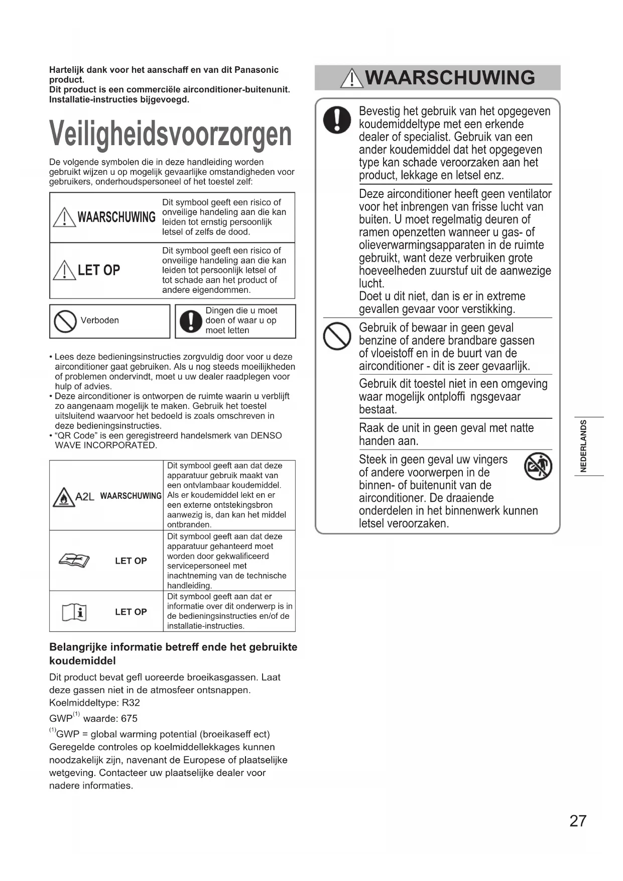 Risoluzione dei problemi Vedere le Istruzioni per l’uso allegate all’unità interna. 00360620all.indb2600360620all.indb26 2024/06/249:31:362024/06/249:31:3627 NEDERLANDSHartelijk dank voor het aanschaff en van dit Panasonic product.Dit product is een commerciële airconditioner-buitenunit.Installatie-instructies bijgevoegd. Bevestig het gebruik van het opgegeven koudemiddeltype met een erkende dealer of specialist. Gebruik van een ander koudemiddel dat het opgegeven type kan schade veroorzaken aan het product, lekkage en letsel enz. Deze airconditioner heeft geen ventilator voor het inbrengen van frisse lucht van buiten. U moet regelmatig deuren of ramen openzetten wanneer u gas- of olieverwarmingsapparaten in de ruimte gebruikt, want deze verbruiken grote hoeveelheden zuurstuf uit de aanwezige lucht. Doet u dit niet, dan is er in extreme gevallen gevaar voor verstikking. Gebruik of bewaar in geen geval benzine of andere brandbare gassen of vloeistoff en in de buurt van de airconditioner - dit is zeer gevaarlijk. Gebruik dit toestel niet in een omgeving waar mogelijk ontploffi ngsgevaar bestaat. Raak de unit in geen geval met natte handen aan. Steek in geen geval uw vingers of andere voorwerpen in de binnen- of buitenunit van de airconditioner. De draaiende onderdelen in het binnenwerk kunnen letsel veroorzaken. WAARSCHUWING Veiligheidsvoorzorgen De volgende symbolen die in deze handleiding worden gebruikt wijzen u op mogelijk gevaarlijke omstandigheden voor gebruikers, onderhoudspersoneel of het toestel zelf: WAARSCHUWING Dit symbool geeft een risico of onveilige handeling aan die kan leiden tot ernstig persoonlijk letsel of zelfs de dood. LET OP Dit symbool geeft een risico of onveilige handeling aan die kan leiden tot persoonlijk letsel of tot schade aan het product of andere eigendommen.VerbodenDingen die u moet doen of waar u op moet letten• Lees deze bedieningsinstructies zorgvuldig door voor u deze airconditioner gaat gebruiken. Als u nog steeds moeilijkheden of problemen ondervindt, moet u uw dealer raadplegen voor hulp of advies.• Deze airconditioner is ontworpen de ruimte waarin u verblijft zo aangenaam mogelijk te maken. Gebruik het toestel uitsluitend waarvoor het bedoeld is zoals omschreven in deze bedieningsinstructies.• “QR Code” is een geregistreerd handelsmerk van DENSO WAVE INCORPORATED.WAARSCHUWINGDit symbool geeft aan dat deze apparatuur gebruik maakt van een ontvlambaar koudemiddel. Als er koudemiddel lekt en er een externe ontstekingsbron aanwezig is, dan kan het middel ontbranden.LET OPDit symbool geeft aan dat deze apparatuur gehanteerd moet worden door gekwalificeerd servicepersoneel met inachtneming van de technische handleiding.LET OPDit symbool geeft aan dat er informatie over dit onderwerp is in de bedieningsinstructies en/of de installatie-instructies.Belangrijke informatie betreff ende het gebruiktekoudemiddelDit product bevat gefl uoreerde broeikasgassen. Laat deze gassen niet in de atmosfeer ontsnappen.Koelmiddeltype: R32 GWP (1) waarde: 675 (1) GWP = global warming potential (broeikaseff ect)Geregelde controles op koelmiddellekkages kunnen noodzakelijk zijn, navenant de Europese of plaatselijke wetgeving. Contacteer uw plaatselijke dealer voor nadere informaties. 00360620all.indb2700360620all.indb27 2024/06/249:31:372024/06/249:31:3728 Als het koudemiddel in contact komt met vuur, zal dit giftige gassen produceren. Voor de veiligheid moet u de airconditioner uitschakelen en de stroomvoorziening afsluiten voor u het toestel schoonmaakt of onderhoud pleegt. Haal de stekker uit het stopcontact of schakel de stroomonderbreker uit die de airconditioner in geval van nood moet afsluiten van de hoofdstroomvoorziening in geval van nood. Gooi weg in overeenstemming met de landelijke en/of plaatselijke regelgeving. Dit product mag in geen geval worden gewijzigd of gedemonteerd. Een gewijzigde of gedemonteerde unit kan leiden tot brand, elektrische schokken, of letsel. Gebruikers mogen niet zelf het binnenwerk van de binnen- en buitenunits schoonmaken. Vraag een erkende dealer of bevoegde specialist om de units schoon te maken. Probeer deze apparatuur niet zelf te repareren wanneer deze storingen vertoont. Neem voor reparatie en verwijdering contact op met uw dealer of reparateur. Zorg ervoor dat elk toestel een apart, eigen stopcontact heeft en een hoofdschakelaar om hem af te sluiten van de netstroom, en een aardlekschakelaar, of een verliesstroomschakelaar ter bescherming tegen te hoge stromen aangebracht in de eigen stroomvoorziening. Zorg voor een apart stopcontact voor elk individueel unit; volledig loskoppelen betekent dat alle polen van de aansluiting losgekoppeld zijn van het vaste net, in overeenstemming met de regelgeving betreff ende de bedrading. Om eventuele risico’s van het kapot raken van isolatie te voorkomen, moet de unit geaard worden. WAARSCHUWING Gebruik geen snoeren waaraan veranderingen zijn aangebracht, aan elkaar gekoppelde snoeren, verlengsnoeren of snoeren die niet voldoen aan de specifi caties om oververhitting en brand te voorkomen. Het toestel moet worden bewaard in een ruimte waarin zich geen doorlopend werkende ontstekingsbronnen bevinden (bijvoorbeeld: open vuur, een werkend gasapparaat, of een werkend elektrisch verwarmingstoestel). Let op, want koudemiddel kan geurloos zijn. Een ongeventileerde plek waar het toestel is geïnstalleerd moet zo zijn geconstrueerd dat het koudemiddel in geval van een lekkage niet kan blijven staan zodat er brandgevaar en ontploffi ngsgevaar ontstaat. Het toestel moet worden bewaard op een plek waar de afmetingen van de ruimte overeenkomen met de afmetingen van de ruimte waarin het toestel volgens de specifi caties gebruikt moet worden. Nadat de unit is geïnstalleerd, moet u altijd de installateur vragen naar het vloeroppervlak van de ruimte waar de unit is geïnstalleerd en de hoeveelheid ingebracht koudemiddel. Als de unit of de kamerverdeling wordt veranderd, moet u altijd de dealer 