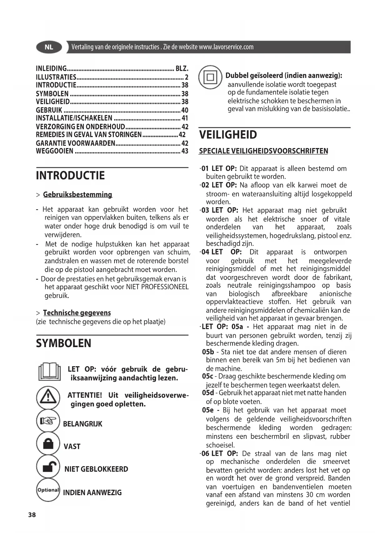 INTRODUCTIE > Gebruiksbestemming - Het apparaat kan gebruikt worden voor het reinigen van oppervlakken buiten, telkens als er water onder hoge druk benodigd is om vuil te verwijderen. - Met de nodige hulpstukken kan het apparaat gebruikt worden voor opbrengen van schuim, zandstralen en wassen met de roterende borstel die op de pistool aangebracht moet worden. - Door de prestaties en het gebruiksgemak ervan is het apparaat geschikt voor NIET PROFESSIONEEL gebruik. > Technische gegevens (zie technische gegevens die op het plaatje) SYMBOLEN LET OP: vóór gebruik de gebru- iksaanwijzing aandachtig lezen. ATTENTIE! Uit veiligheidsoverwe- gingen goed opletten. BELANGRIJK VAST NIET GEBLOKKEERD INDIEN AANWEZIG Dubbel geïsoleerd (indien aanwezig): aanvullende isolatie wordt toegepast op de fundamentele isolatie tegen elektrische schokken te beschermen in geval van mislukking van de basisisolatie.. VEILIGHEID SPECIALE VEILIGHEIDSVOORSCHRIFTEN
