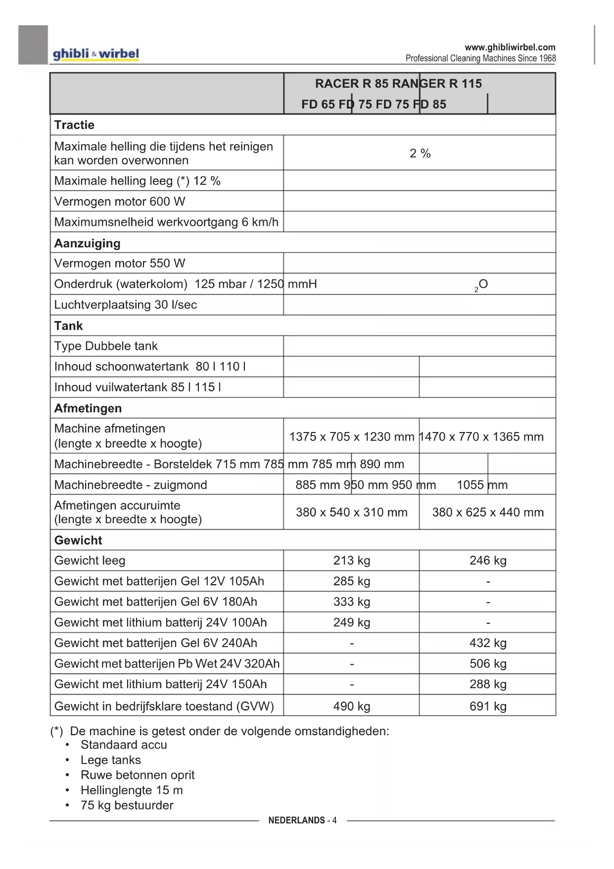 Luchtverplaatsing 30 l/sec Tank Type Dubbele tank Inhoud schoonwatertank 80 l 110 l Inhoud vuilwatertank 85 l 115 l Afmetingen Machine afmetingen (lengte x breedte x hoogte) 1375 x 705 x 1230 mm 1470 x 770 x 1365 mm Machinebreedte - Borsteldek 715 mm 785 mm 785 mm 890 mm Machinebreedte - zuigmond 885 mm 950 mm 950 mm 1055 mm Afmetingen accuruimte (lengte x breedte x hoogte) 380 x 540 x 310 mm 380 x 625 x 440 mm Gewicht Gewicht leeg 213 kg 246 kg Gewicht met batterijen Gel 12V 105Ah 285 kg - Gewicht met batterijen Gel 6V 180Ah 333 kg - Gewicht met lithium batterij 24V 100Ah 249 kg - Gewicht met batterijen Gel 6V 240Ah - 432 kg Gewicht met batterijen Pb Wet 24V 320Ah - 506 kg Gewicht met lithium batterij 24V 150Ah - 288 kg Gewicht in bedrijfsklare toestand (GVW) 490 kg 691 kg (*) De machine is getest onder de volgende omstandigheden: