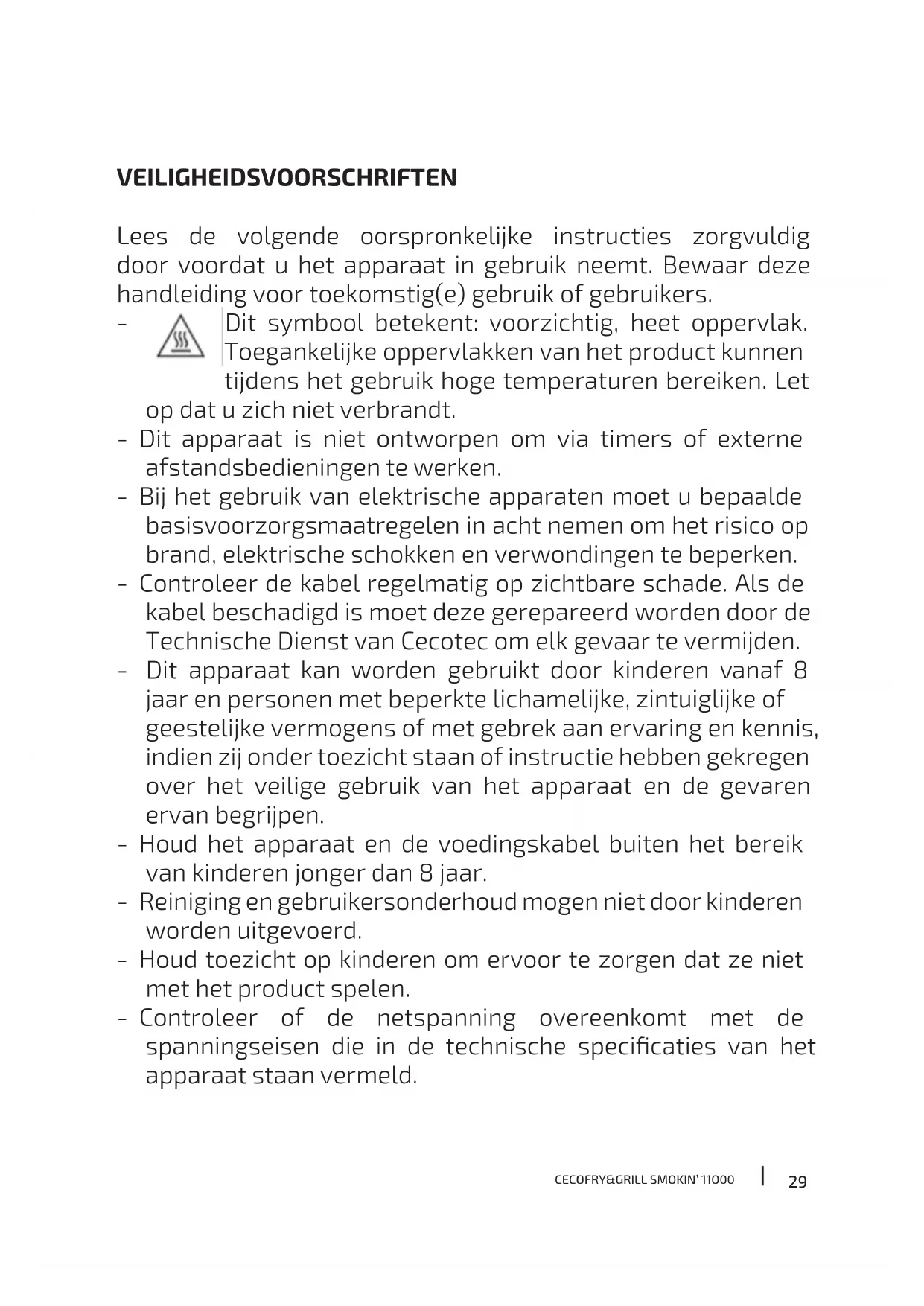 VEILIGHEIDSVOORSCHRIFTEN Lees de volgende oorspronkelijke instructies zorgvuldig door voordat u het apparaat in gebruik neemt. Bewaar deze handleiding voor toekomstig(e) gebruik of gebruikers. - Dit symbool betekent: voorzichtig, heet oppervlak. Toegankelijke oppervlakken van het product kunnen tijdens het gebruik hoge temperaturen bereiken. Let op dat u zich niet verbrandt. - Dit apparaat is niet ontworpen om via timers of externe afstandsbedieningen te werken. - Bij het gebruik van elektrische apparaten moet u bepaalde basisvoorzorgsmaatregelen in acht nemen om het risico op brand, elektrische schokken en verwondingen te beperken. - Controleer de kabel regelmatig op zichtbare schade. Als de kabel beschadigd is moet deze gerepareerd worden door de Technische Dienst van Cecotec om elk gevaar te vermijden. - Dit apparaat kan worden gebruikt door kinderen vanaf 8 jaar en personen met beperkte lichamelijke, zintuiglijke of geestelijke vermogens of met gebrek aan ervaring en kennis, indien zij onder toezicht staan of instructie hebben gekregen over het veilige gebruik van het apparaat en de gevaren ervan begrijpen. - Houd het apparaat en de voedingskabel buiten het bereik van kinderen jonger dan 8 jaar. - Reiniging en gebruikersonderhoud mogen niet door kinderen worden uitgevoerd. - Houd toezicht op kinderen om ervoor te zorgen dat ze niet met het product spelen. - Controleer of de netspanning overeenkomt met de spanningseisen die in de technische specicaties van het apparaat staan vermeld.CECOFRY&GRILL SMOKIN’ 11O00