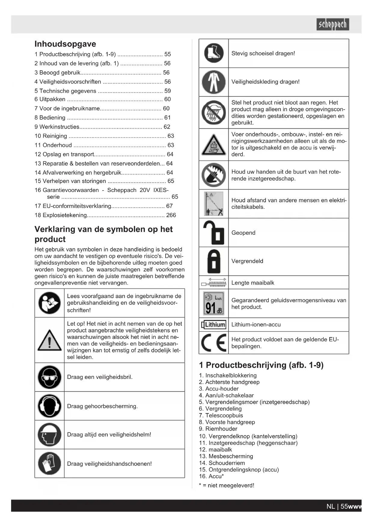 fecten van een nieuw door u aangeschaft product die te wijten zijn aan een materiaal- of productiefout. Als er zich tijdens de garantieperiode materiaal- of fabri- cagefouten voordoen, zal de fabrikant als garantiever- lener in het kader van deze garantie een van de vol- gende services naar keuze verlenen: – Gratis reparatie van het product – Gratis vervanging van het product door een pro- duct van gelijke waarde (evt. ook vervanging door een nieuw model als het originele product niet meer verkrijgbaar is). NL | 65www.scheppach.comVervangen producten of onderdelen worden ons ei- gendom. Let erop dat onze producten volgens het be- oogd gebruik niet voor bedrijfsmatige, ambachtelijke of beroepsmatige toepassingen zijn ontworpen. Een garantieclaim is daarom niet geldig als het product binnen de garantieperiode voor bedrijfsmatige, am- bachtelijke of industriële doeleinden is gebruikt of aan een gelijkwaardige belasting is blootgesteld.