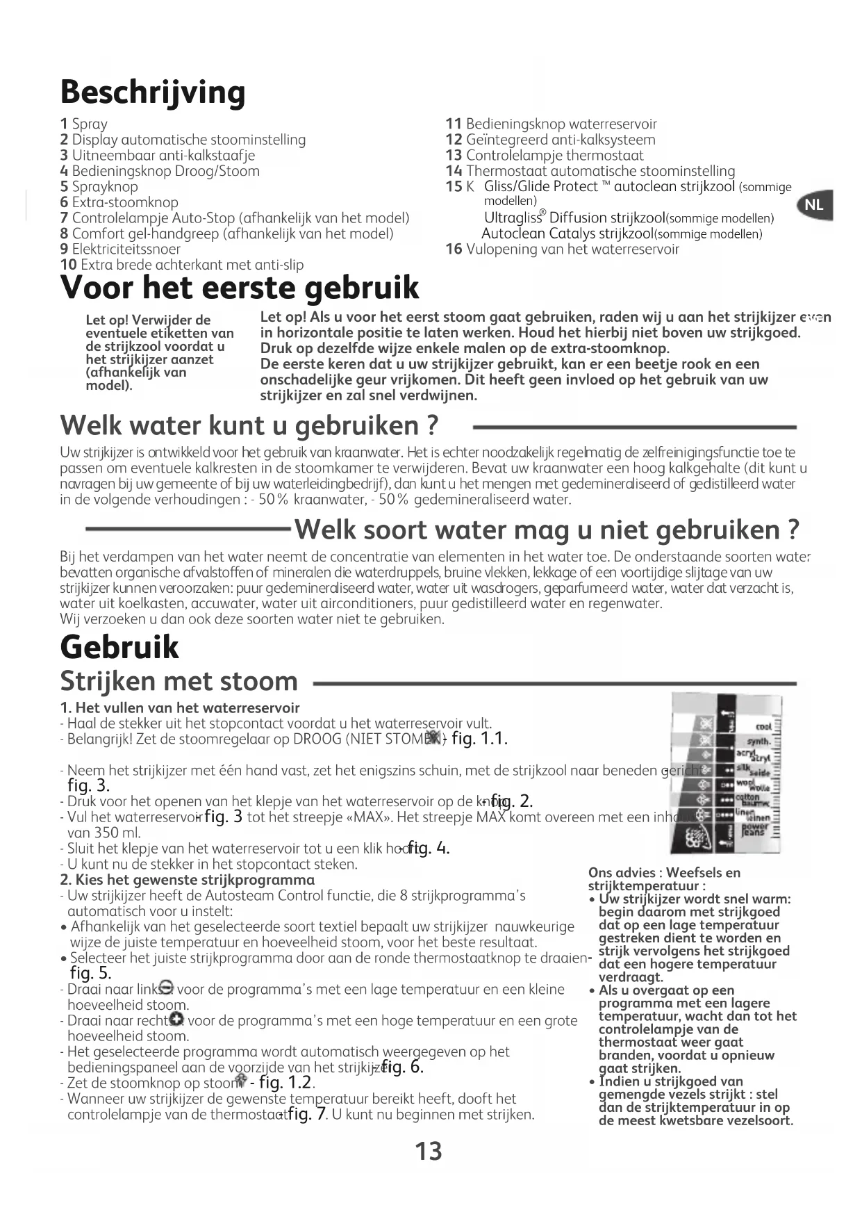 fig. 1.2 u kunt nu het staafje uit het strijkijzer halen - fig. 15. Raak het puntje van het anti-kalkstaafje niet aan - Laat het anti-kalkstaafje gedurende 4 uur in een glas met schoonmaakazijn of puur citroensap weken - fig. 16. - Spoel het staafje af onder de kraan.- Plaats het staafje terug in het strijkijzer en druk het goed aan. Zonder het anti-kalkstaafje functioneert het strijkijzer niet 1. Toepassen van de zelfreinigingsfunctie. Pas, om voortijdige slijtage van uw strijkijzer te voorkomen, dezelfreinigings- functie minstens eenmaal per maand toe. Zet de stoomknop op DROOG .- Plaats het strijkijzer op zijn hiel, met een vol waterreservoir en stel de thermostaat af op de stand MAX - fig. 10. - Haal de stekker uit het stopcontact wanneer het controlelampje uitgaat en houd het strijkijzer boven de gootsteen.- Verwijder het anti-kalkstaafje.- Plaats de stoom selectieknop in de stoompositie (fig.1.2) - Schud het strijkijzer voorzichtig heen en weer boven de gootsteen totdat een deel van het water uit het waterreservoir (met de vuildeeltjes) via de strijkzool is afgevoerd.- Na deze handeling het anti-kalkstaafje weer op zijn plaats zetten.Wanneer de Auto-Stop-beveiliging werkt, is hetnormaal dat hetcontrolelampje van dethermostaat nietbrandt. Opgelet! Tijdens het schoonmaken dient destoom selectieknop in de stoompositie testaan (fig.1.2) en de thermos-taat op MAX(fig.10) 1800135516 FV95XX E2_110x154 26/01/15 14:45 Page1415 - Steek vervolgens nogmaals gedurende 2 minuten de stekker in het stopcontact om destrijkzool te laten drogen.- Haal de stekker uit het stopcontact en droog de strijkzool (als deze voldoende is afgekoeld)af met een zachte doek.2. Schoonmaken van de strijkzoolUw stoomstrijkijzer is voorzien van een zelfreinigende strijkzool (afhankelijk van het model):• Let op! Het gebruik van schuurmiddel beschadigt de zelfreinigende toplaag van uw strijkzool. • Deze exclusieve toplaag verwijdert automatisch de onzuiverheden die tijdens normaalgebruik geproduceerd worden.• Wanneer u tijdens het strijken een niet geschikt programma gebruikt, kunnen er plooienachterblijven die u later handmatig moet gladstrijken. In dit geval is het raadzaam eenzachte en vochtige doek op de nog lauwe strijkzool te leggen om de toplaag niet tebeschadigen– fig.22.Uw stoomstrijkijzer is voorzien van een Ultragliss strijkzool (sommige modellen):• Gebruik nooit agressieve of schurende producten.• Wanneer de strijkzool nog lauw is, dient u het met een vochtige doek schoon te maken Het opbergen van uw strijkijzer - Haal de stekker uit het stopcontact en wacht tot de strijkzool is afgekoeld.- Leeg direct het waterwaterreservoir en controleer of de stoomregelaar op DROOG - fig. 1.1 staat. Er kan een beetjewater in het waterreservoir achterblijven.- Rol het snoer rond de achterkant van het strijkijzer niet de strak.- Zet het strijkijzer op zijn achterkant. Milieu Wees vriendelijk voor het milieu !i Uw apparaat bevat materialen die geschikt zijn voor hergebruik.‹ Lever het in bij het milieustation in uw gemeente of bij onze technische dienst. Problemen met uw strijkijzer ? Ons advies: De zelfreinigingsfunc-tie voorkomt voortijdige kalkvormingin uw strijkijzer.Let op!De stoomknop moet altijd opSTOOM (fig.1.2) staan om hetanti-kalkstaafje van het strijkijzer tekunnen verwijderen of terugplaatsen. Let op!Het gebruik van een schuursponsjebeschadigt de zelfreinigende coatingvan de strijkzool (fig.17)Problemen Mogelijke oorzaken Oplossingen• Er komt water uit degaatjes in de strijkzool.• U gebruikt de extra-stoomknop te vaak.• U hebt het strijkijzer plat opgeborgen zonder hette legen en de stoomregelaar op DROOG (NIETSTOMEN) te zetten.• Wacht een paar seconden voordat u weer opde knop drukt.• Zie de paragraaf "Het opbergen van uwstrijkijzer".• Er komt bruine vloeistofuit de strijkzool dievlekken veroorzaakt ophet strijkgoed.• U gebruikt chemische kalkoplossende middelen.• U gebruikt één van de afgeraden soorten water.• Voeg geen kalkoplossende middelen toe.• Raadpleeg het hoofdstuk “Welk watermag u niet gebruiken”.• De strijkzool is vuil ofbruin en kan vlekkenveroorzaken op hetstrijkgoed.• U heeft met een verkeerd programma gestreken(te hoge temperatuur).• Uw wasgoed is niet voldoende gespoeld of ugebruikt stijfsel. Kies het juiste programma. Zie hoofdstuk «Reinig de strijkzool ». • Sproei het stijfsel op de binnenzijde van hette strijken wasgoed.• Er komt geen of weinigstoom uit het strijkijzer.• Het waterwaterreservoir is leeg.• Het anti-kalkstaafje is vuil.• Er zit kalkaanslag in uw strijkijzer.• U hebt uw strijkijzer te lang zonder stoomgebruikt.• Vul het waterwaterreservoir met kraanwater.• Maak het anti-kalkstaafje schoon.• Maak het anti-kalkstaafje schoon en pas dezelfreinigingsfunctie toe.• Pas de zelfreinigingsfunctie toe.• De strijkzool vertoontkrassen of isbeschadigd.• U hebt uw strijkijzer op een metalenstrijkijzerplateau gezet.• U heeft de strijkzool gereinigd met eenschuursponsje of een metalen sponsje.• Zet het strijkijzer altijd op de achterkant. • Zie hoofdstuk « Reinig de strijkzool ».• Er komt water uit hetklepje van hetwaterreservoir.• U heeft het klepje van het waterreservoir nietgoed gesloten.• Controleer of het klepje van het waterreservoir goed geslotenis (totdat u eenklik hoort).• Er komt stoom uit hetstrijkijzer bij het vullenvan het waterreservoir.• De cursor van de stoomknop staat niet op destand DROOG (NIET STOMEN) . (fig1.1)• Controleer of de stoomknop op de standDROOG (NIET STOMEN) staat . (fig1.1)•De spray en/of deextra-stoomknop werktniet. • Het waterreservoir is leeg. • Vul het waterreservoir.• Er komt water uit devoorzijde van hetstrijkijzer• U heeft tijdens het vullen van het waterreservoirhet niveau MAX overschreden.• Verwijder het overtollige water via hetwaterreservoir. Indien u de oorzaak van het probleem niet zelf heeft kunnen vinden, kunt u altijd contact opnemen met de consum