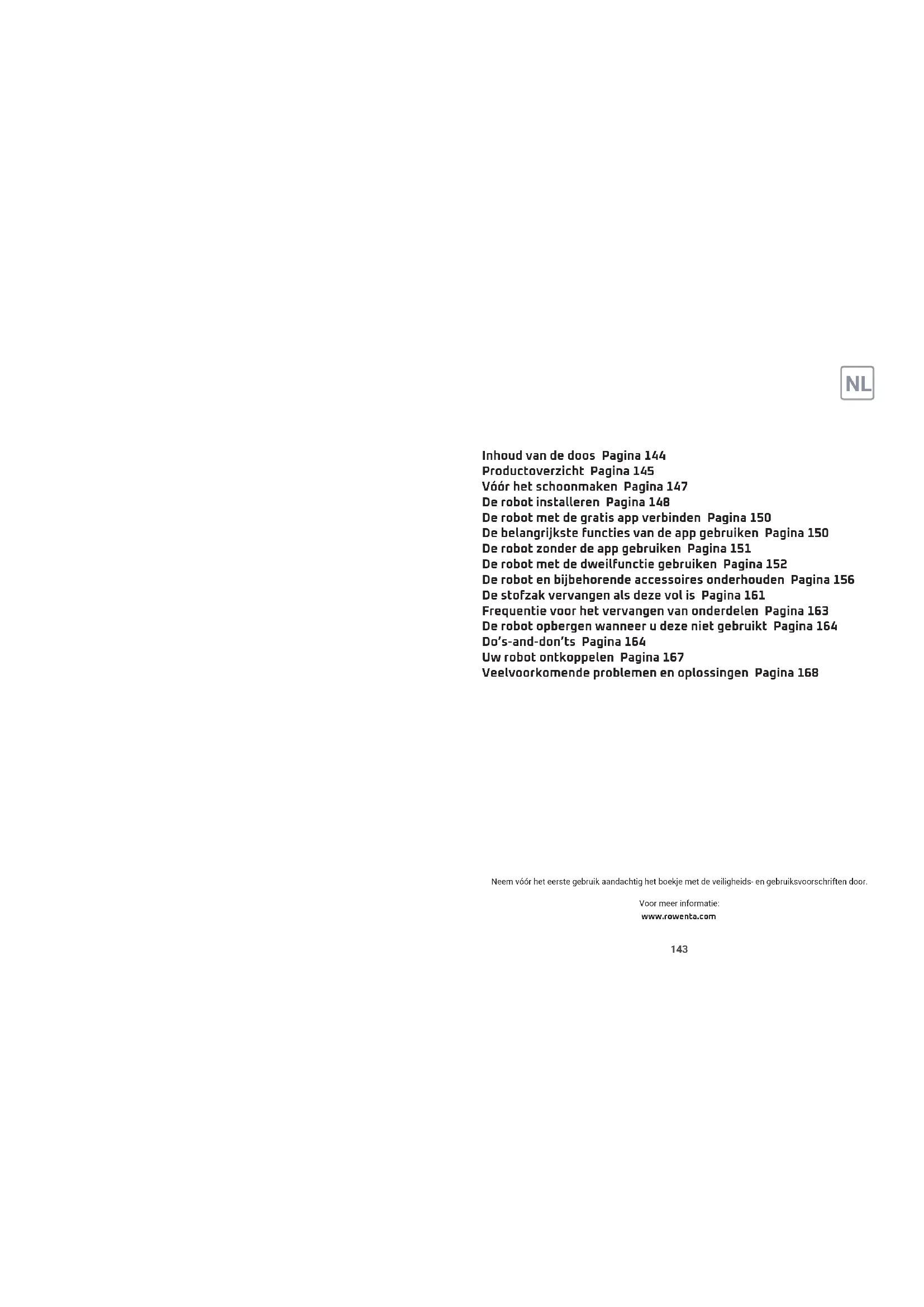 Voor meer informatie: www.rowenta.com Neemvóórheteerstegebruikaandachtighetboekjemetdeveiligheids-engebruiksvoorschriftendoor. Inhoud van de doos Pagina 144 Productoverzicht Pagina 145 Vóór het schoonmaken Pagina 147 De robot installeren Pagina 148 De robot met de gratis app verbinden Pagina 150 De belangrijkste functies van de app gebruiken Pagina 150 De robot zonder de app gebruiken Pagina 151 De robot met de dweilfunctie gebruiken Pagina 152 De robot en bijbehorende accessoires onderhouden Pagina 156 De stofzak vervangen als deze vol is Pagina 161 Frequentie voor het vervangen van onderdelen Pagina 163 De robot opbergen wanneer u deze niet gebruikt Pagina 164 Do’s-and-don’ts Pagina 164 Uw robot ontkoppelen Pagina 167 Veelvoorkomende problemen en oplossingen Pagina 168144 145 Inhoud van de doos