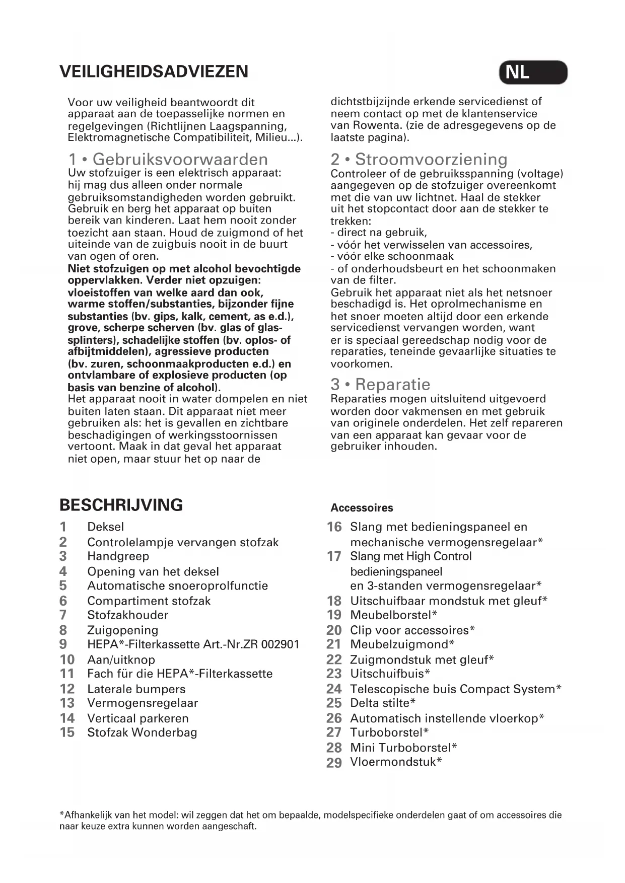 *Afhankelijk van het model: wil zeggen dat het om bepaalde, modelspecieke onderdelen gaat of om accessoires die naar keuze extra kunnen worden aangeschaft. Voor uw veiligheid beantwoordt dit apparaat aan de toepasselijke normen en regelgevingen (Richtlijnen Laagspanning, Elektromagnetische Compatibiliteit, Milieu...). 1 • Gebruiksvoorwaarden Uw stofzuiger is een elektrisch apparaat: hij mag dus alleen onder normale gebruiksomstandigheden worden gebruikt. Gebruik en berg het apparaat op buiten bereik van kinderen. Laat hem nooit zonder toezicht aan staan. Houd de zuigmond of het uiteinde van de zuigbuis nooit in de buurt van ogen of oren. Niet stofzuigen op met alcohol bevochtigde oppervlakken. Verder niet opzuigen: vloeistoffen van welke aard dan ook, warme stoffen/substanties, bijzonder fijne substanties (bv. gips, kalk, cement, as e.d.), grove, scherpe scherven (bv. glas of glas- splinters), schadelijke stoffen (bv. oplos- of afbijtmiddelen), agressieve producten (bv. zuren, schoonmaakproducten e.d.) en ontvlambare of explosieve producten (op basis van benzine of alcohol). Het apparaat nooit in water dompelen en niet buiten laten staan. Dit apparaat niet meer gebruiken als: het is gevallen en zichtbare beschadigingen of werkingsstoornissen vertoont. Maak in dat geval het apparaat niet open, maar stuur het op naar de dichtstbijzijnde erkende servicedienst of neem contact op met de klantenservice van Rowenta. (zie de adresgegevens op de laatste pagina). 2 • Stroomvoorziening Controleer of de gebruiksspanning (voltage) aangegeven op de stofzuiger overeenkomt met die van uw lichtnet. Haal de stekker uit het stopcontact door aan de stekker te trekken: - direct na gebruik, - vóór het verwisselen van accessoires, - vóór elke schoonmaak - of onderhoudsbeurt en het schoonmaken van de filter. Gebruik het apparaat niet als het netsnoer beschadigd is. Het oprolmechanisme en het snoer moeten altijd door een erkende servicedienst vervangen worden, want er is speciaal gereedschap nodig voor de reparaties, teneinde gevaarlijke situaties te voorkomen. 3 • Reparatie Reparaties mogen uitsluitend uitgevoerd worden door vakmensen en met gebruik van originele onderdelen. Het zelf repareren van een apparaat kan gevaar voor de gebruiker inhouden. VEILIGHEIDSADVIEZEN BESCHRIJVING Deksel Controlelampje vervangen stofzak Handgreep Opening van het deksel Automatische snoeroprolfunctie Compartiment stofzak Stofzakhouder Zuigopening HEPA*-Filterkassette Art.-Nr.ZR 002901 Aan/uitknop Fach für die HEPA*-Filterkassette Laterale bumpers Vermogensregelaar Verticaal parkeren Stofzak Wonderbag Slang met bedieningspaneel en mechanische vermogensregelaar* Slang met High Control bedieningspaneel en 3-standen vermogensregelaar* Uitschuifbaar mondstuk met gleuf* Meubelborstel* Clip voor accessoires* Meubelzuigmond* Zuigmondstuk met gleuf* Uitschuifbuis* Telescopische buis Compact System* Delta stilte* Automatisch instellende vloerkop* Turboborstel* Mini Turboborstel* Vloermondstuk*