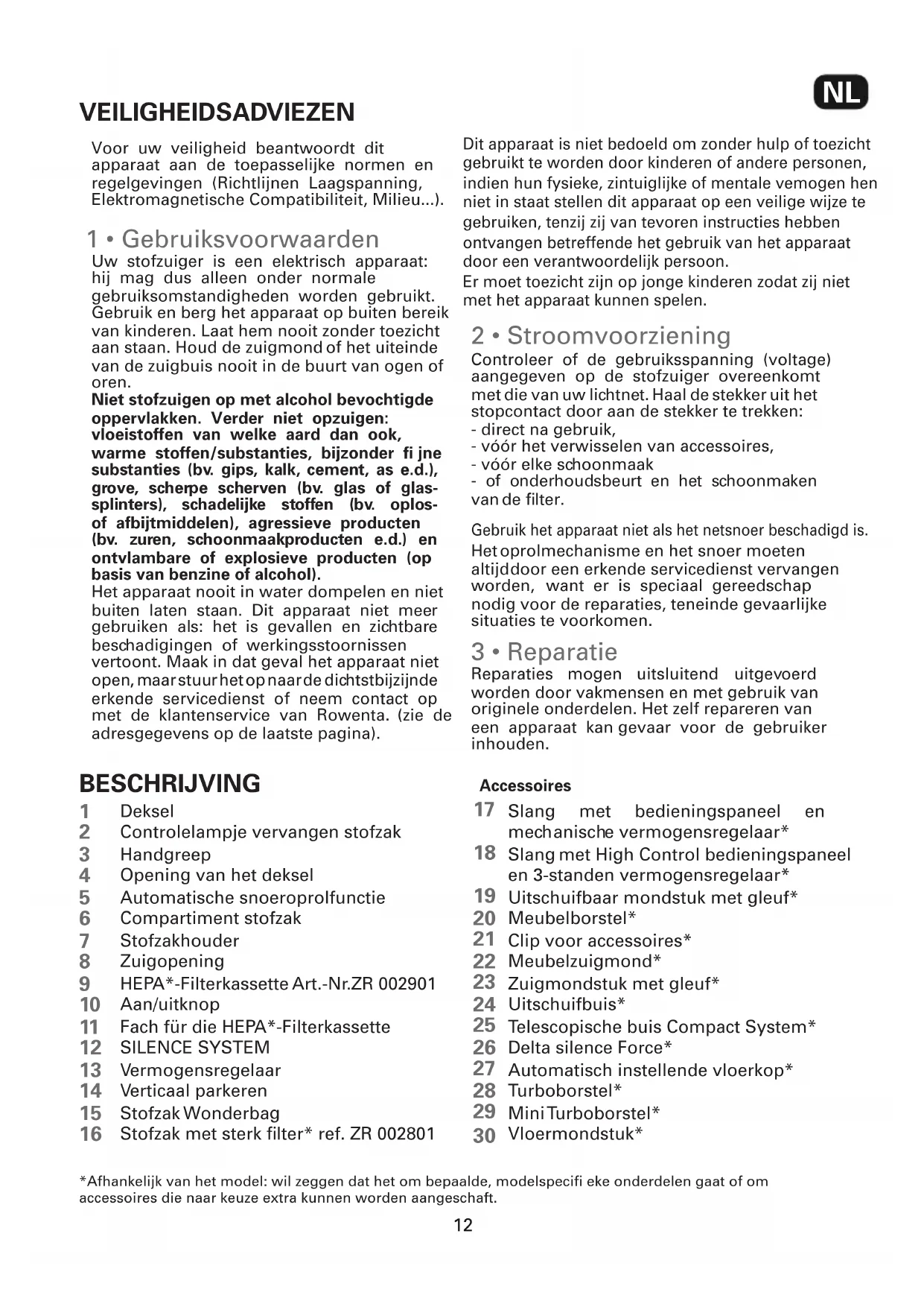 Voor uw veiligheid beantwoordt dit apparaat aan de toepasselijke normen en regelgevingen (Richtlijnen Laagspanning, Elektromagnetische Compatibiliteit, Milieu...).Uw stofzuiger is een elektrisch apparaat: hij mag dus alleen onder normale gebruiksomstandigheden worden gebruikt. Gebruik en berg het apparaat op buiten bereik van kinderen. Laat hem nooit zonder toezicht aan staan. Houd de zuigmond of het uiteinde van de zuigbuis nooit in de buurt van ogen of oren.Niet stofzuigen op met alcohol bevochtigde oppervlakken. Verder niet opzuigen: vloeistoffen van welke aard dan ook, warme stoffen/substanties, bijzonder fi jne substanties (bv. gips, kalk, cement, as e.d.), grove, scherpe scherven (bv. glas of glas- splinters), schadelijke stoffen (bv. oplos- of afbijtmiddelen), agressieve producten (bv. zuren, schoonmaakproducten e.d.) en ontvlambare of explosieve producten (op basis van benzine of alcohol).Het apparaat nooit in water dompelen en niet buiten laten staan. Dit apparaat niet meer gebruiken als: het is gevallen en zichtbare beschadigingen of werkingsstoornissen vertoont. Maak in dat geval het apparaat niet open, maar stuur het op naar de dichtstbijzijnde erkende servicedienst of neem contact op met de klantenservice van Rowenta. (zie de adresgegevens op de laatste pagina). Controleer of de gebruiksspanning (voltage) aangegeven op de stofzuiger overeenkomt met die van uw lichtnet. Haal de stekker uit het stopcontact door aan de stekker te trekken:- direct na gebruik,- vóór het verwisselen van accessoires,- vóór elke schoonmaak - of onderhoudsbeurt en het schoonmaken van de fi lter. Het oprolmechanisme en het snoer moeten altijd door een erkende servicedienst vervangen worden, want er is speciaal gereedschap nodig voor de reparaties, teneinde gevaarlijke situaties te voorkomen. Reparaties mogen uitsluitend uitgevoerd worden door vakmensen en met gebruik van originele onderdelen. Het zelf repareren van een apparaat kan gevaar voor de gebruiker inhouden. VEILIGHEIDSADVIEZEN 1 • Gebruiksvoorwaarden BESCHRIJVING Deksel Controlelampje vervangen stofzak Handgreep Opening van het deksel Automatische snoeroprolfunctie Compartiment stofzak Stofzakhouder Zuigopening HEPA*-Filterkassette Art.-Nr.ZR 002901 Aan/uitknop Fach für die HEPA*-Filterkassette SILENCE SYSTEM Vermogensregelaar Verticaal parkeren Stofzak Wonderbag Stofzak met sterk fi lter* ref. ZR 002801 Slang met bedieningspaneel en mech anisch e vermogensregelaar* Slang met High Control bedieningspaneel en 3-standen vermogensregelaar* Uitschuifbaar mondstuk met gleuf* Meubelborstel* Clip voor accessoires* Meubelzuigmond* Zuigmondstuk met gleuf* Uitschuifbuis* Telescopische buis Compact System* Delta silence Force* Automatisch instellende vloerkop* Turboborstel* Mini Turboborstel* Vloermondstuk*