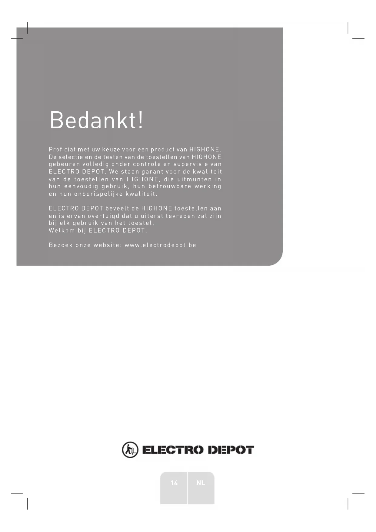 Veuillez conserver l’emballage et l’utiliser pour y ranger l’appareil lorsqu’il est prévu de ne pas l’utiliser pendant une période prolongée.13 FRBedankt! Proficiat met uw keuze voor een product van HIGHONE. De selectie en de testen van de toestellen van HIGHONE gebeuren volledig onder controle en supervisie van ELECTRO DEPOT. We staan garant voor de kwaliteit van de toestellen van HIGHONE, die uitmunten in hun eenvoudig gebruik, hun betrouwbare werking en hun onberispelijke kwaliteit. ELECTRO DEPOT beveelt de HIGHONE toestellen aan en is ervan overtuigd dat u uiterst tevreden zal zijn bij elk gebruik van het toestel. Welkom bij ELECTRO DEPOT. Bezoek onze website: www.electrodepot.be