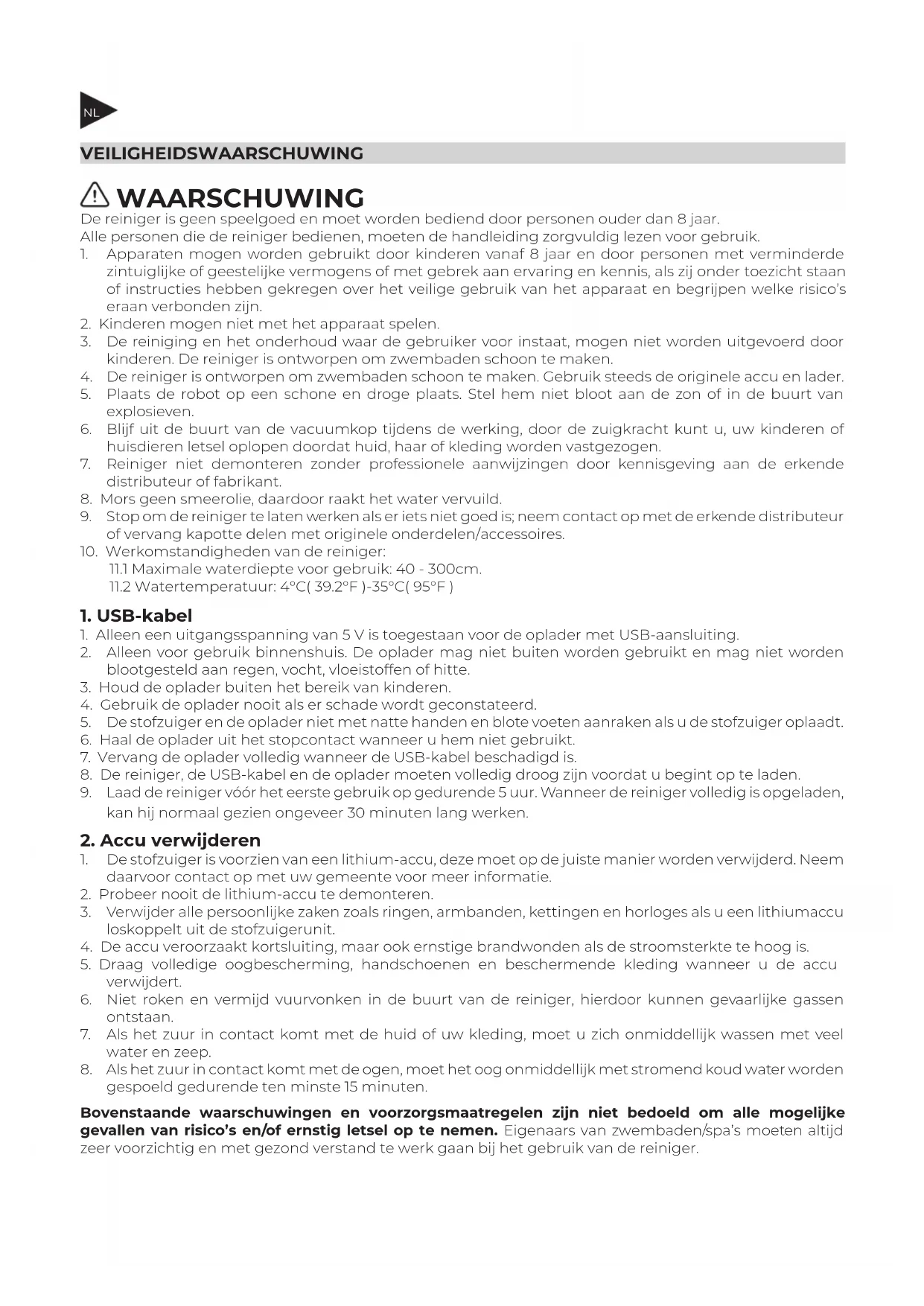 gespoeld gedurende ten minste 15 minuten. Bovenstaande waarschuwingen en voorzorgsmaatregelen zijn niet bedoeld om alle mogelijke gevallen van risico’s en/of ernstig letsel op te nemen. Eigenaars van zwembaden/spa’s moeten altijd zeer voorzichtig en met gezond verstand te werk gaan bij het gebruik van de reiniger.NL De oplaadpoort Deksel oplaadpoortinschakelen