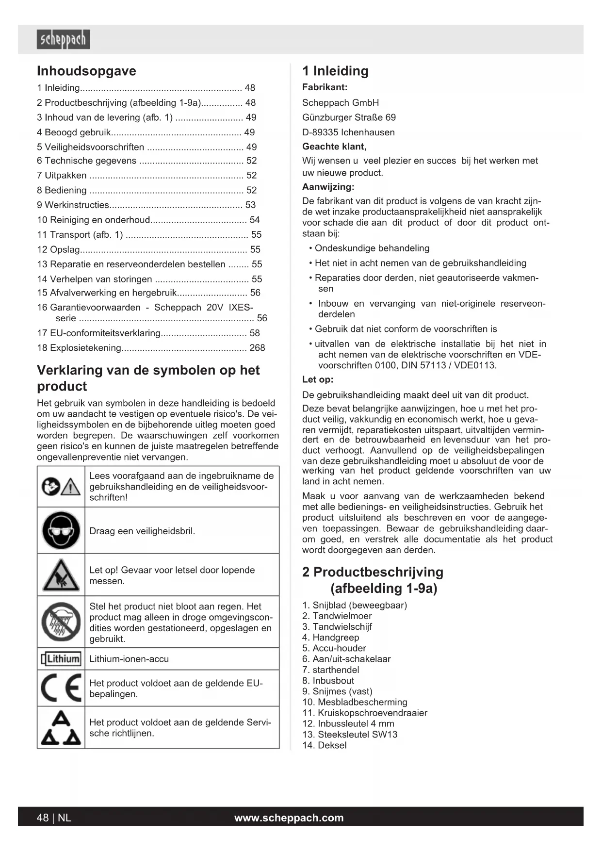 - 18 Explosietekening Verklaring van de symbolen op het product Het gebruik van symbolen in deze handleiding is bedoeld om uw aandacht te vestigen op eventuele risico's. De vei- ligheidssymbolen en de bijbehorende uitleg moeten goed worden begrepen. De waarschuwingen zelf voorkomen geen risico's en kunnen de juiste maatregelen betreffende ongevallenpreventie niet vervangen. Lees voorafgaand aan de ingebruikname de gebruikshandleiding en de veiligheidsvoor- schriften! Draag een veiligheidsbril. Let op! Gevaar voor letsel door lopende messen. Stel het product niet bloot aan regen. Het product mag alleen in droge omgevingscon- dities worden gestationeerd, opgeslagen en gebruikt. Lithium-ionen-accu Het product voldoet aan de geldende EU- bepalingen. Het product voldoet aan de geldende Servi- sche richtlijnen. 1 Inleiding Fabrikant: Scheppach GmbH Günzburger Straße 69 D-89335 Ichenhausen Geachte klant, Wij wensen u veel plezier en succes bij het werken met uw nieuwe product. Aanwijzing: De fabrikant van dit product is volgens de van kracht zijn- de wet inzake productaansprakelijkheid niet aansprakelijk voor schade die aan dit product of door dit product ont- staan bij: p. 268