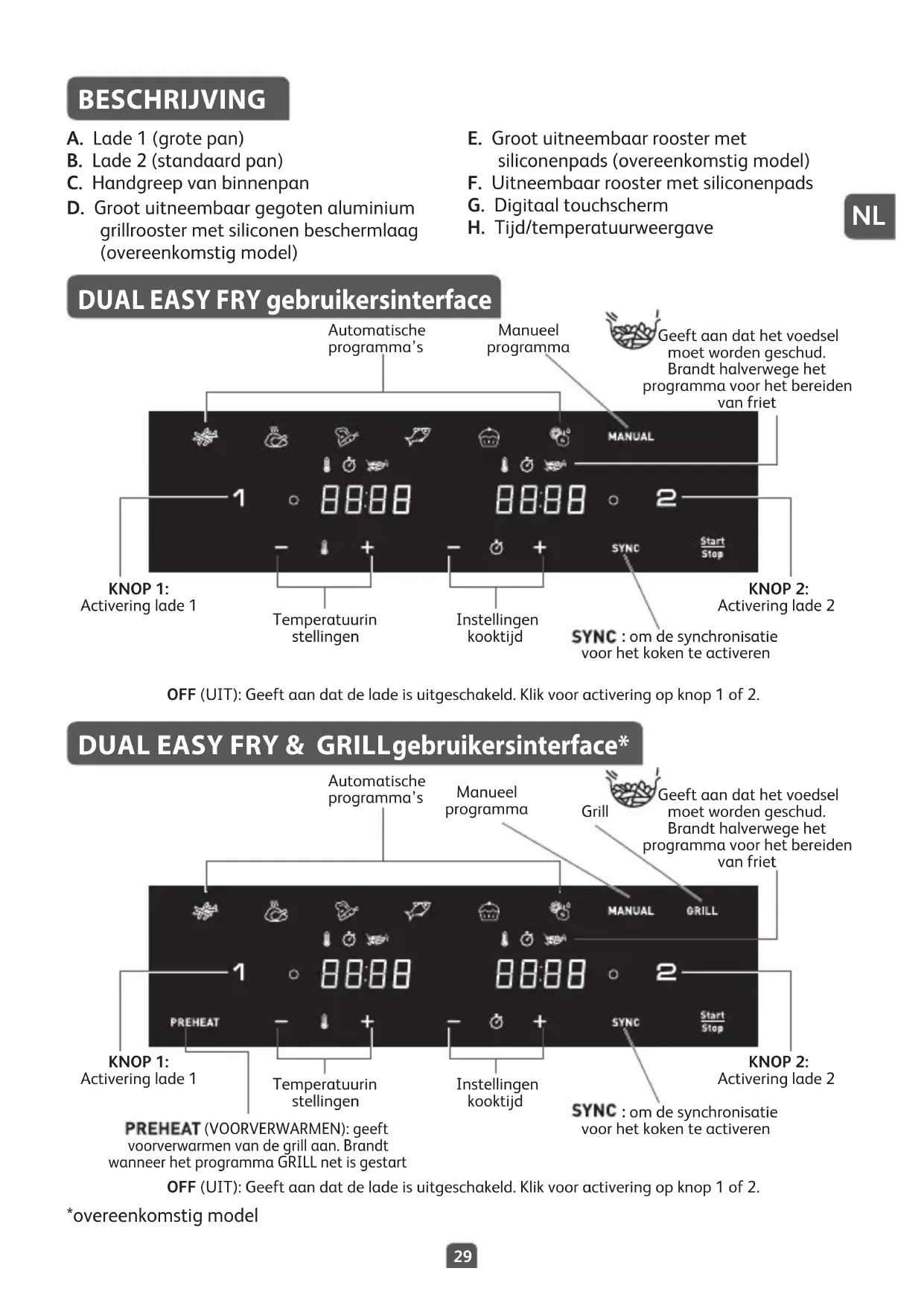 BESCHRIJVING A. Lade 1 (grote pan) B. Lade 2 (standaard pan) C. Handgreep van binnenpan D. Groot uitneembaar gegoten aluminium grillrooster met siliconen beschermlaag (overeenkomstig model) E. Groot uitneembaar rooster met siliconenpads (overeenkomstig model) F. Uitneembaar rooster met siliconenpads G. Digitaal touchscherm H. Tijd/temperatuurweergave DUAL EASY FRY gebruikersinterface