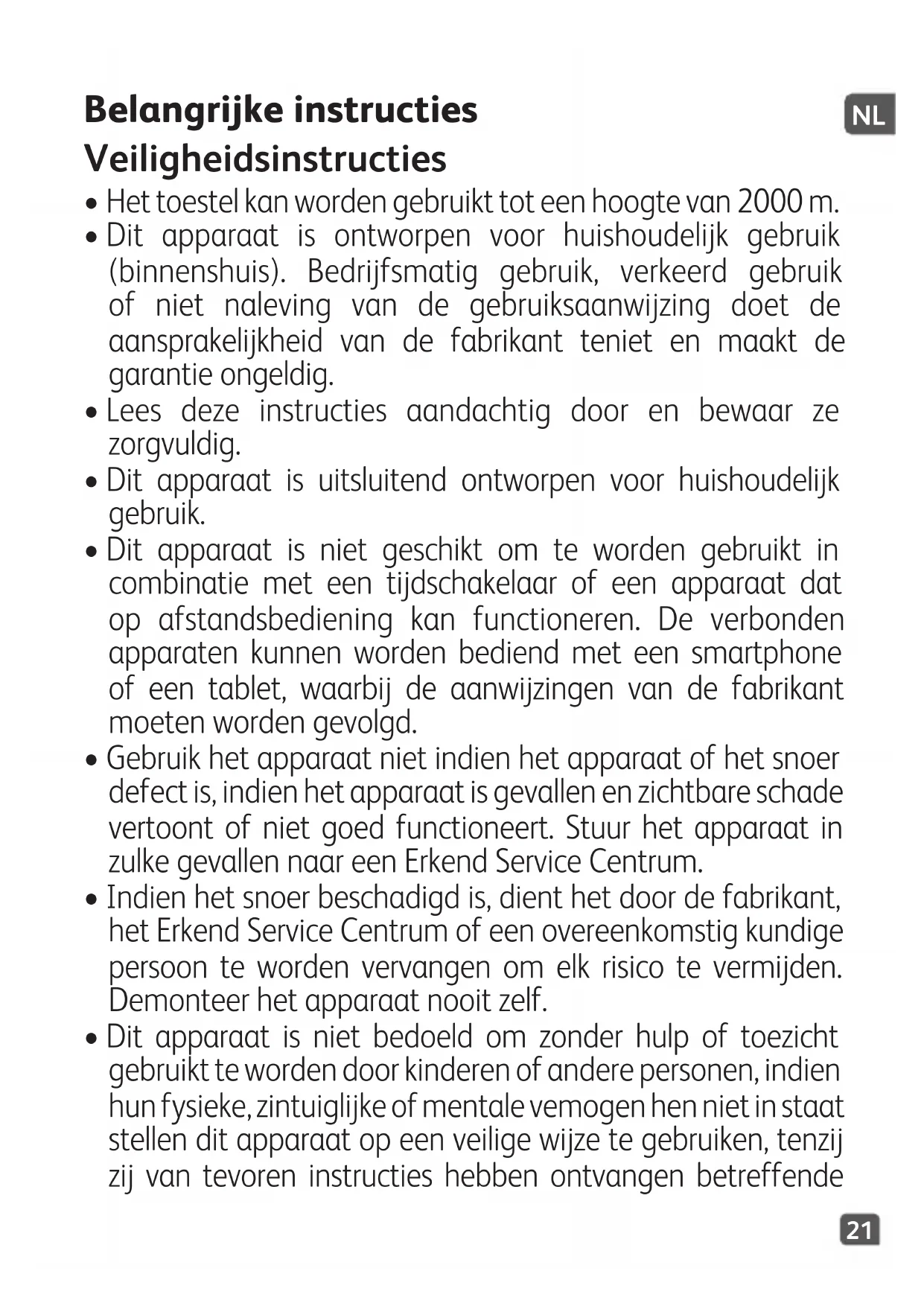 - Dit apparaat mag gebruikt worden door kinderen vanaf 8 jaar en door personen met beperkte fysieke, zintuiglijke of mentale capaciteiten of personen zonder ervaring of kennis, indien ze via een persoon die verantwoordelijk is voor hun veiligheid onder toezicht staan of voorafgaand instructies kregen over het gebruik van het toestel en op de hoogte zijn van de mogelijke risico’s. Kinderen mogen niet met het apparaat spelen. Schoonmaak en onderhoudswerkzaamheden mogen alleen worden verricht door kinderen boven de 8 jaar die onder toezicht staan. Houd het apparaat en diens snoer buiten bereik van kinderen onder de 8 jaar.
