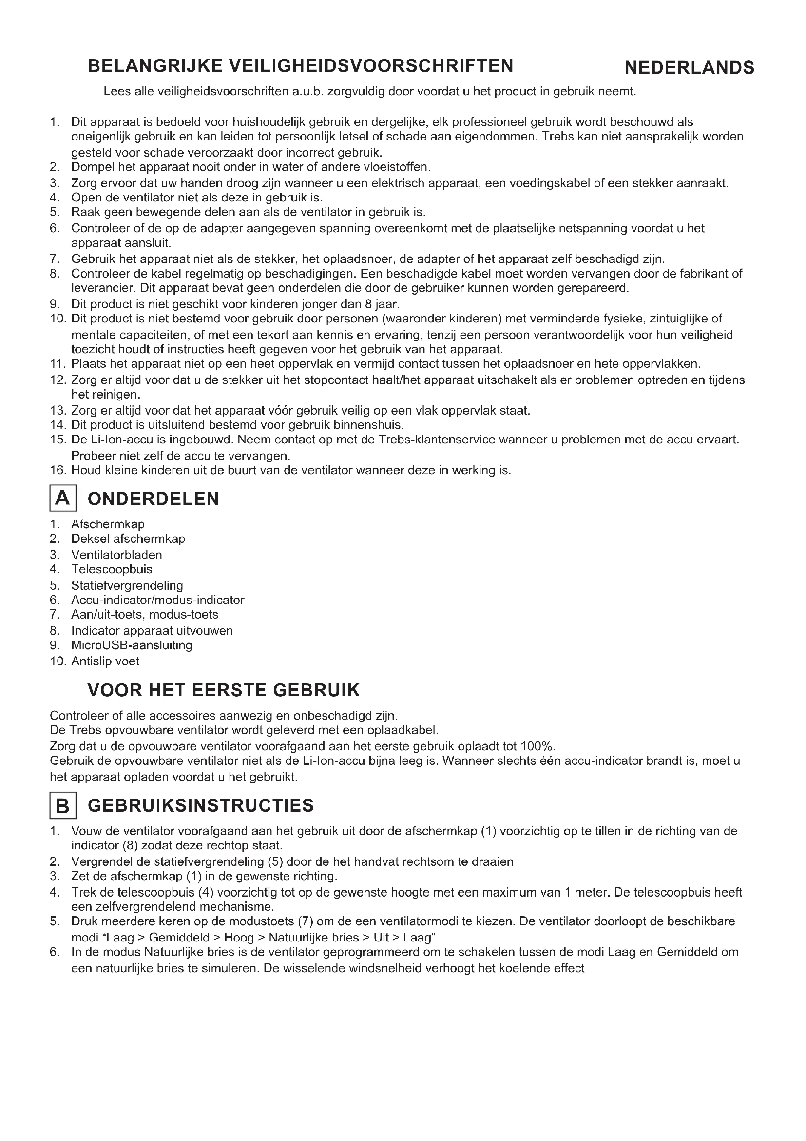 Español: El manual en español está disponible en formato digital en www.trebsshop.com. Italiano: El manual en italiano está disponible en formato digital en www.trebsshop.com Svenska: Den svenska handboken nns digitalt tillgänglig på www.trebsshop.com Türk: Türkçe kılavuz dijital olarak www.trebsshop.com adresinde mevcutturNEDERLANDS Lees alle veiligheidsvoorschriften a.u.b. zorgvuldig door voordat u het product in gebruik neemt. Dit apparaat is bedoeld voor huishoudelijk gebruik en dergelijke, elk professioneel gebruik wordt beschouwd als oneigenlijk gebruik en kan leiden tot persoonlijk letsel of schade aan eigendommen. Trebs kan niet aansprakelijk worden gesteld voor schade veroorzaakt door incorrect gebruik. Dompel het apparaat nooit onder in water of andere vloeistoffen. Zorg ervoor dat uw handen droog zijn wanneer u een elektrisch apparaat, een voedingskabel of een stekker aanraakt. Open de ventilator niet als deze in gebruik is. Raak geen bewegende delen aan als de ventilator in gebruik is. Controleer of de op de adapter aangegeven spanning overeenkomt met de plaatselijke netspanning voordat u het apparaat aansluit. Gebruik het apparaat niet als de stekker, het oplaadsnoer, de adapter of het apparaat zelf beschadigd zijn. Controleer de kabel regelmatig op beschadigingen. Een beschadigde kabel moet worden vervangen door de fabrikant of leverancier. Dit apparaat bevat geen onderdelen die door de gebruiker kunnen worden gerepareerd. Dit product is niet geschikt voor kinderen jonger dan 8 jaar. Dit product is niet bestemd voor gebruik door personen (waaronder kinderen) met verminderde fysieke, zintuiglijke of mentale capaciteiten, of met een tekort aan kennis en ervaring, tenzij een persoon verantwoordelijk voor hun veiligheid toezicht houdt of instructies heeft gegeven voor het gebruik van het apparaat. Plaats het apparaat niet op een heet oppervlak en vermijd contact tussen het oplaadsnoer en hete oppervlakken. Zorg er altijd voor dat u de stekker uit het stopcontact haalt/het apparaat uitschakelt als er problemen optreden en tijdens het reinigen. Zorg er altijd voor dat het apparaat vóór gebruik veilig op een vlak oppervlak staat. Dit product is uitsluitend bestemd voor gebruik binnenshuis. De Li-Ion-accu is ingebouwd. Neem contact op met de Trebs-klantenservice wanneer u problemen met de accu ervaart. Probeer niet zelf de accu te vervangen. Houd kleine kinderen uit de buurt van de ventilator wanneer deze in werking is. BELANGRIJKE VEILIGHEIDSVOORSCHRIFTEN