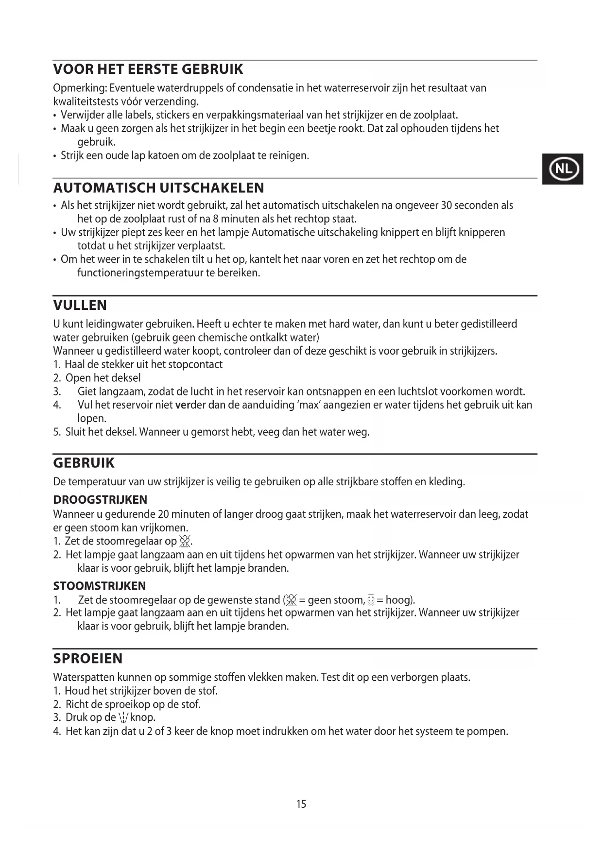 klaar is voor gebruik, blijft het lampje branden. SPROEIEN Waterspatten kunnen op sommige stoffen vlekken maken. Test dit op een verborgen plaats.
