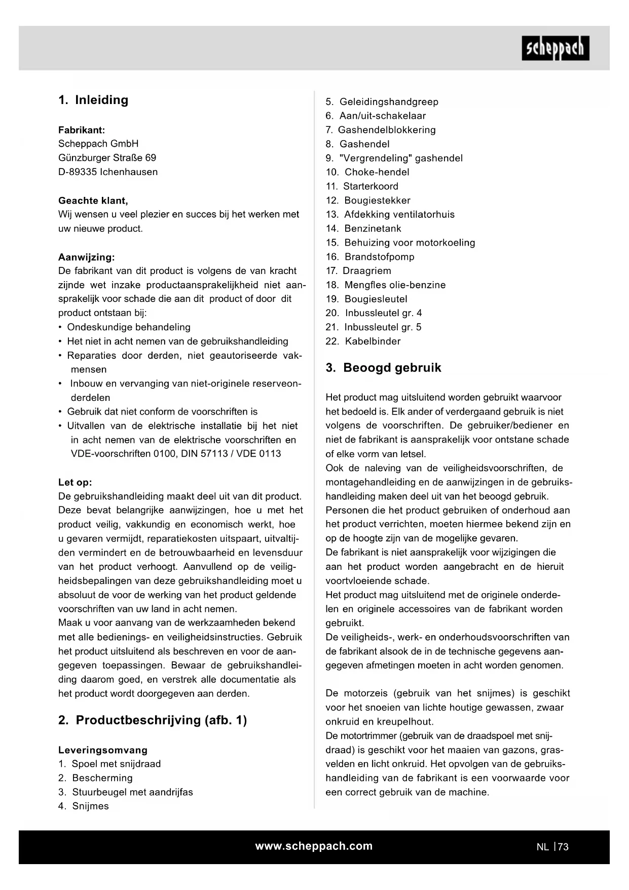 m WAARSCHUWING Lees alle veiligheidsvoor- schriften en aanwijzingen, afbeeldingen en techni- sche gegevens, waar dit product van is voorzien. Nalatigheden bij het niet naleven van de onderstaande aanwijzingen kunnen elektrische schok, brand en/of ernstige verwondingen veroorzaken. Bewaar alle veiligheidsvoorschriften en -aanwijzingen voor toekomstig gebruik. Veiligheidsinstructies Dit apparaat is niet bestemd voor gebruik door per- sonen (inclusief kinderen) met fysieke, sensorische of verstandelijke beperkingen of met een gebrek aan ervaring en kennis, tenzij zij onder toezicht staan van een voor hun veiligheid verantwoordelijke persoon, of zijn geïnstrueerd over het gebruik van het apparaat. Kinderen moeten onder toezicht staan, zodat ze niet met het apparaat kunnen gaan spelen. Elk ander gebruik, dat in deze handleiding niet uitdruk- kelijk toegelaten wordt, kan tot schade aan het appa- raat leiden en een ernstig gevaar voor de gebruiker vormen. Let met name ook op de beperkingen in de veiligheidsvoorschriften. Let op! Vanwege het risico op lichamelijk letsel bij de gebruiker, mag de benzinemotorzeis niet worden gebruikt voor de volgende werkzaamheden: voor het reinigen van looppaden en als hakselaar voor het verkleinen van boom- en hegsnijafval. Verder mag de benzinemotorzeis niet worden gebruikt voor het egali- seren van bodemoneenheden, zoals molshopen. Om veiligheidsredenen mag de zeis met benzinemotor niet als aandrijfaggregaat voor andere gereedschapssets van welk type dan ook worden gebruikt. De machine mag uitsluitend voor het voorgeschreven doel worden gebruikt. Elk ander of verdergaand ge- bruik is niet volgens de voorschriften. De gebruiker/ bediener en niet de fabrikant is aansprakelijk voor ont- stane schade of elke vorm van letsel. Wie mogen het apparaat niet gebruiken: Personen die niet bekend zijn met de gebruikshand- leiding, kinderen onder de 16 jaar en personen die onder invloed van alcohol, drugs of medicijnen staan. Gebruiksuren van de zeis met benzinemotor Ook al mag een motorzeis op elk moment worden ge- bruikt, toch moet de gebruiker rekening houden met de mensen in zijn omgeving. Let erop dat onze producten volgens het beoogd ge- bruik niet voor bedrijfsmatige, ambachtelijke of indus- triële toepassingen zijn ontworpen. Wij aanvaarden geen aansprakelijkheid wanneer het product in be- drijfsmatige, ambachtelijke of industriële ondernemin- gen of bij soortgelijke werkzaamheden worden ingezet. De fabrikant is niet aansprakelijk voor schade die het gevolg is van oneigenlijk gebruik of onjuiste bediening.www.scheppach.com