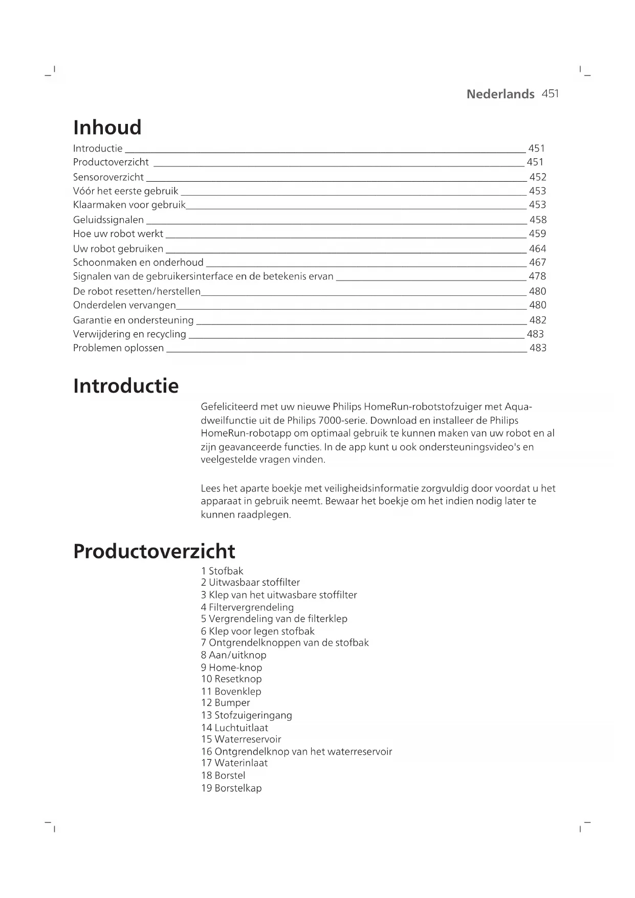 Nederlands Inhoud Introductie ________________________________________________________________________________ 451 Productoverzicht __________________________________________________________________________ 451 Sensoroverzicht ____________________________________________________________________________ 452 Vóór het eerste gebruik _____________________________________________________________________ 453 Klaarmaken voor gebruik____________________________________________________________________ 453 Geluidssignalen ____________________________________________________________________________ 458 Hoe uw robot werkt ________________________________________________________________________ 459 Uw robot gebruiken ________________________________________________________________________ 464 Schoonmaken en onderhoud ________________________________________________________________ 467 Signalen van de gebruikersinterface en de betekenis ervan ______________________________________ 478 De robot resetten/herstellen_________________________________________________________________ 480 Onderdelen vervangen______________________________________________________________________ 480 Garantie en ondersteuning __________________________________________________________________ 482 Verwijdering en recycling ___________________________________________________________________ 483 Problemen oplossen ________________________________________________________________________ 483 Introductie Gefeliciteerd met uw nieuwe Philips HomeRun-robotstofzuiger met Aqua- dweilfunctie uit de Philips 7000-serie. Download en installeer de Philips HomeRun-robotapp om optimaal gebruik te kunnen maken van uw robot en al zijn geavanceerde functies. In de app kunt u ook ondersteuningsvideo's en veelgestelde vragen vinden. Lees het aparte boekje met veiligheidsinformatie zorgvuldig door voordat u het apparaat in gebruik neemt. Bewaar het boekje om het indien nodig later te kunnen raadplegen. Productoverzicht 1 Stofbak 2 Uitwasbaar stoffilter 3 Klep van het uitwasbare stoffilter 4 Filtervergrendeling 5 Vergrendeling van de filterklep 6 Klep voor legen stofbak 7 Ontgrendelknoppen van de stofbak 8 Aan/uitknop 9 Home-knop 10 Resetknop 11 Bovenklep 12 Bumper 13 Stofzuigeringang 14 Luchtuitlaat 15 Waterreservoir 16 Ontgrendelknop van het waterreservoir 17 Waterinlaat 18 Borstel 19 Borstelkap452 Nederlands 20 Ontgrendelknoppen van de borstelkap 21 Hoofdwielen 22 Zwenkwiel 23 Contactpunten voor opladen (robot) 24 Zijborstel 25 Dweildoekjehouder 26 Wasbaar dweildoekje (2x) 27 Netsnoer (XU7000) 28 (Oplaad)station (XU7000) 29 IR-signaalvenster (XU7000) 30 Contactpunten voor opladen (station) 31 Netsnoeraansluiting 32 Placemat (XU7000) 33 Stofzuigerzak (2x) (XU7100) 34 Deksel van stofbak 35 Stofzuigerzakruimte 36 (Automatisch) leegstation (XU7100) 37 Indicatielampje 38 IR-signaalvenster 39 Drempelhulp 40 Vuilafvoeropening 41 Luchtuitlaat vuilafvoer 42 Contactpunten voor opladen (station) 43 Uitblaasopening 44 Reinigingshulpstuk voor borstel 45 Netsnoeraansluiting 46 Netsnoer (XU7100) Sensoroverzicht