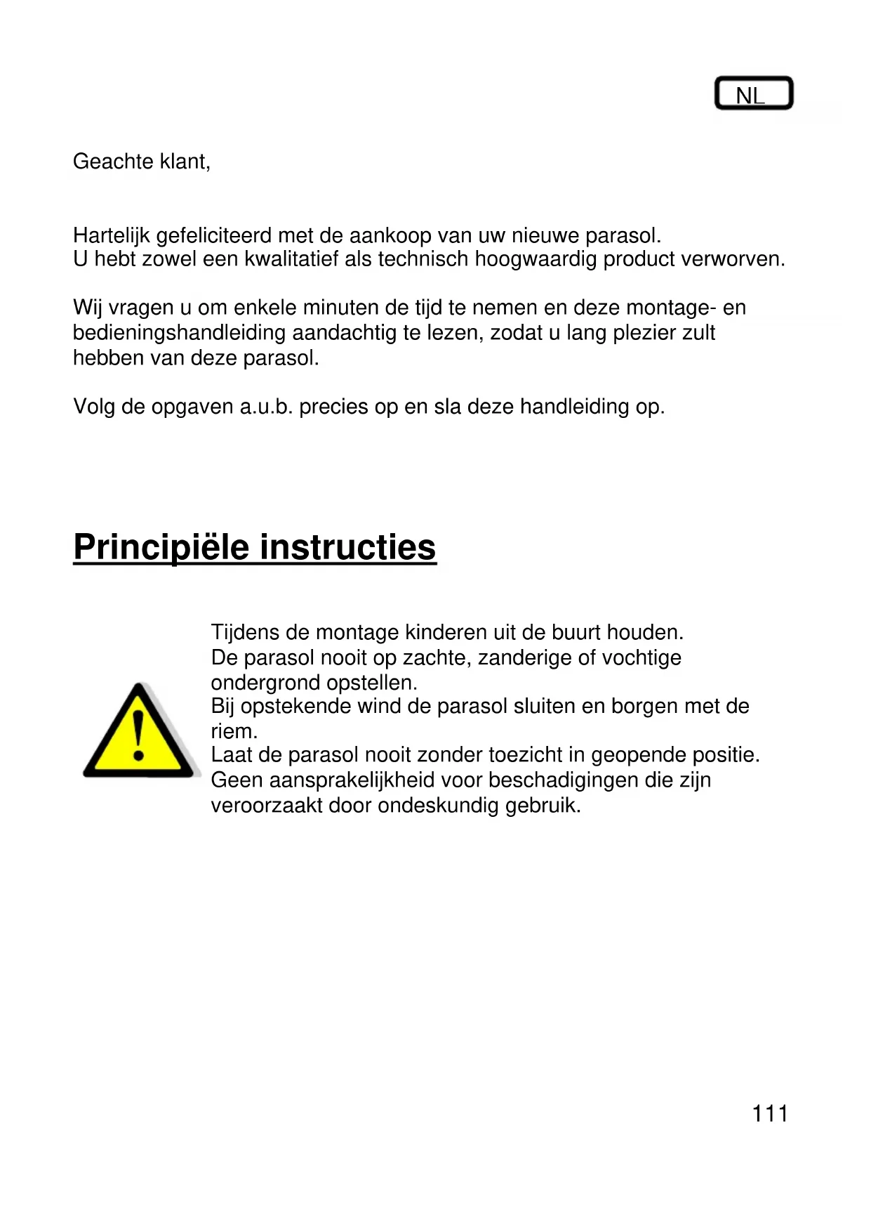Wij vragen u om enkele minuten deijd te nemen en deze montage- en bedieningshandleiding aandachtig te lezen, zodate u lang plezier zult hebben van"These parasol.