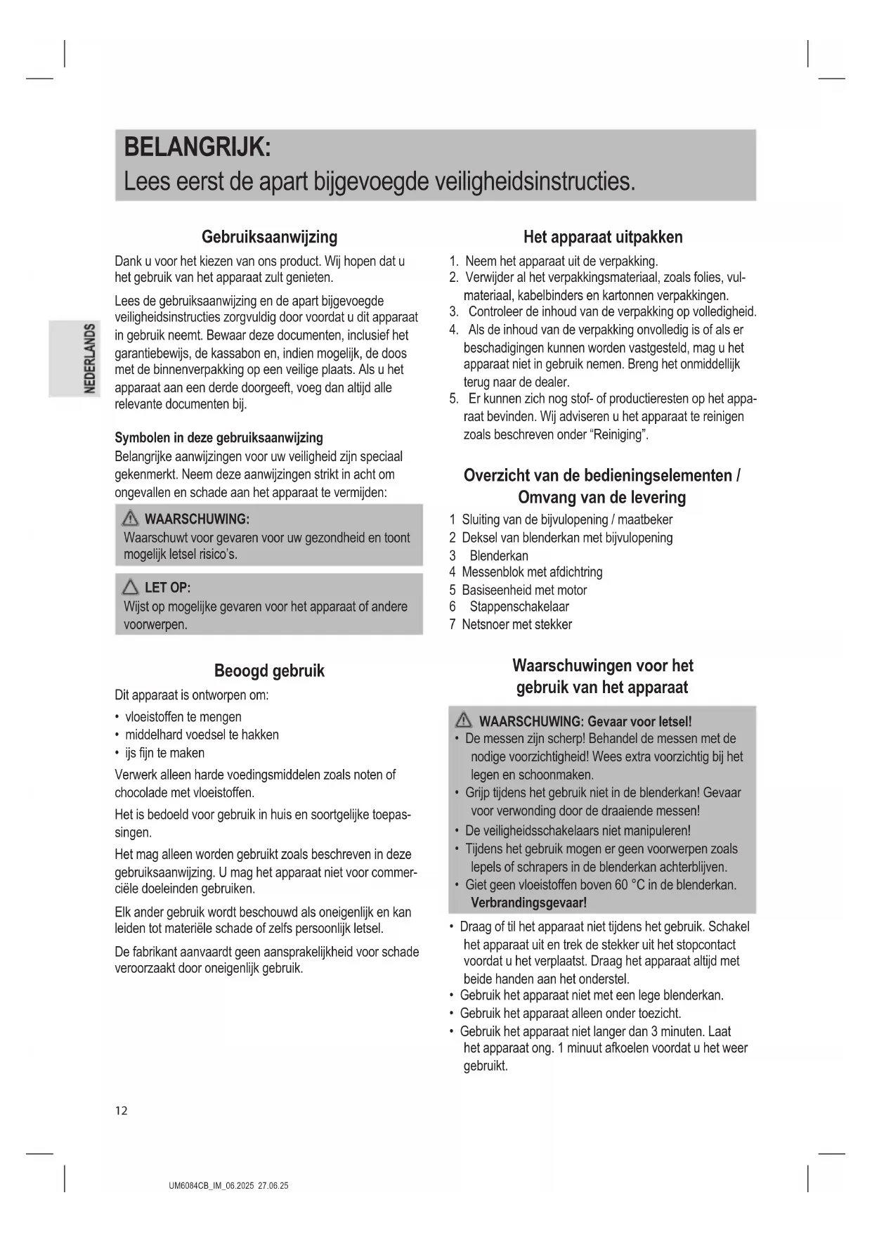 Problemen oplossen Probleem Mogelijke oorzaak Remedie Het apparaat werkt niet. Het apparaat heeft geen stroomvoor- ziening. Controleer het stopcontact met een ander apparaat. Steek de netstekker er goed in. Controleer de huiszekering. Verkeerde positie van de schakelaar. Controleer de positie van de trapschakelaar. Uw apparaat is voorzien van een veilig- heidsschakelaar. Deze voorkomt dat de motor onbedoeld aanloopt. Controleer of de blenderkan en het deksel van de blenderkan goed op hun plaats zitten. Het apparaat is defect. Neem contact op met onze service of een speci- alist. Technische gegevens Model:.................................................................UM 6084 CB Stroomvoorziening: .............................220 – 240 V~, 50 / 60 Hz Stroomverbruik: .............................................................700 W Aangegeven vermogen in stand-by modus: ...............< 0,3 W Beschermingsklasse: ........................................................... Vulhoeveelheid: ..................................................max. 1,5 liter Nettogewicht: ........................................................ ong. 2,8 kg Het recht om technische en ontwerpaanpassingen te ma- ken in de loop van voortdurende productontwikkeling blijft voorbehouden. Dit apparaat is getest volgens alle van toepassing zijnde, huidige CE-richtlijnen en gebouwd volgens de meest recente veiligheidsvoorschriften. Verwijdering Betekenis van het symbool “vuilnisemmer” Bescherm ons milieu, elektrische apparaten ho- ren niet in het huisafval. Maak voor het afvoeren van elektrische appara- ten gebruik van de voorgeschreven verzamel- punten en geef daar de elektrische apparaten af die u niet meer gebruikt. Daardoor helpt u de potentiële effecten te voorkomen die een verkeerde afvoer op het milieu en de menselijke gezondheid kunnen hebben. Op deze wijze levert u uw bijdrage aan het hergebruik, de recycling en andere verwerkingsvormen voor oude elektro- nische en elektrische apparaten. Voor informatie over verzamelpunten voor uw apparaten kunt u contact opnemen met uw gemeente of gemeen- teadministratie. Uw dealer en contractpartner is bovendien verplicht het oude apparaat gratis terug te nemen.UM6084CB_IM_06.2025 27.06.25