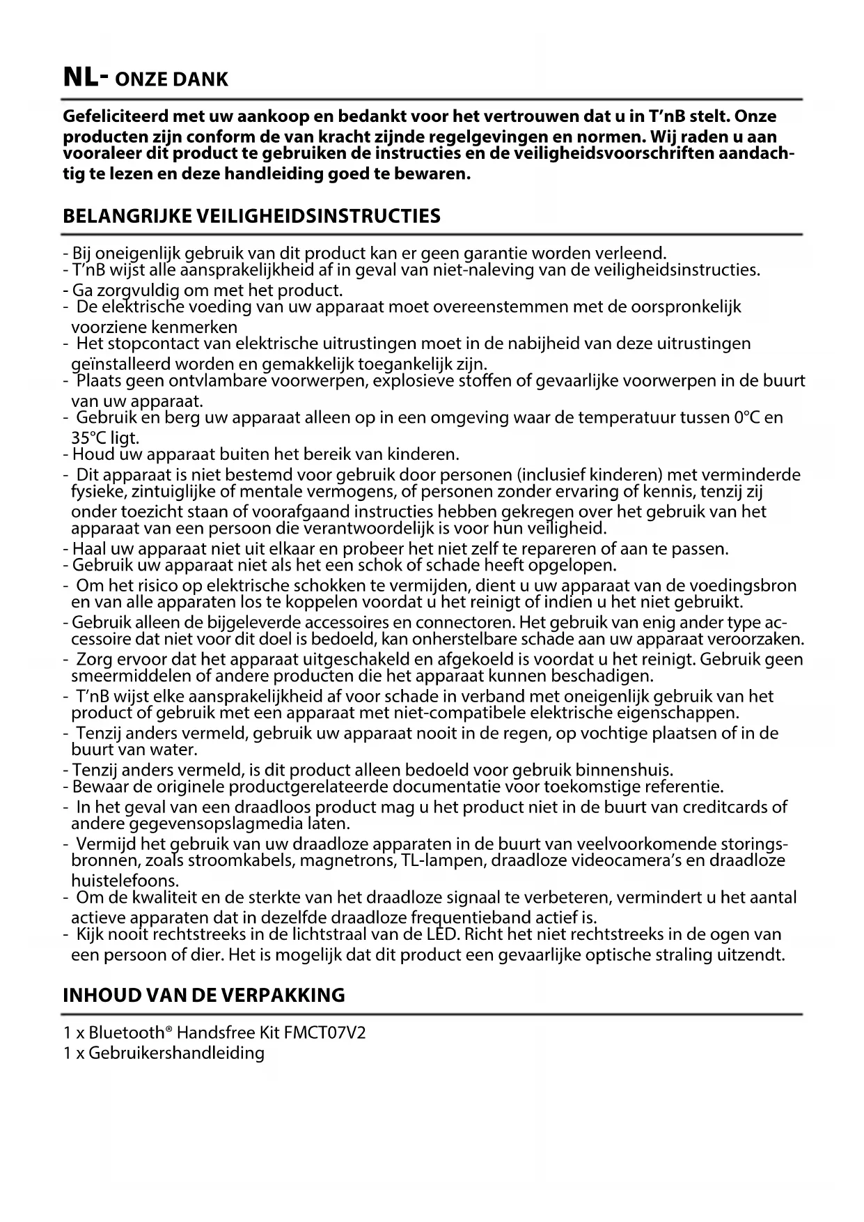 Musikformat MP3/WMA USB-Stick (Max) 64GBVerwendung der Bluetooth®-Funktion a) Aktivieren Sie die Bluetooth®-Funktion Ihres Geräts und koppeln Sie es mit „FMCT07“ (einige Geräte benötigen möglicherweise einen PIN-Code: 0000). b) Nach dem Koppeln wird die Musik Ihres Geräts an Ihr Autoradio übertragen. c) Im Musikmodus wechselt der Transmitter bei einem eingehenden Anruf automatisch in den Anrufmodus. d) Drücken Sie einmal die Taste (1), um den Anruf anzunehmen, und drücken Sie erneut die Taste (1), um aufzulegen. e) Drücken Sie die Taste (1) zweimal, um einen eingehenden Anruf abzulehnen. f) Um die zuletzt gewählte Nummer erneut zu wählen, drücken Sie die Taste (1) zweimal. BETRIEB BENÖTIGEN SIE HILFE? Uns liegt die Zufriedenheit unserer Kunden am Herzen und Sie haben Sie die Möglichkeit, uns unter info@t-nb.com zu kontaktieren. Für Wartung, Störungsbehebung, diverse Informationen über diese Produkt besuchen Sie bitte unsere Website: www.t-nb.com. Gleichstrom Weist auf dem Typenschild darauf hin, dass das Gerät nur mit Gleichstrom betrieben werden darf und kennzeichnet die betreenden Klemmen. Operation FM-Transmitter Ein-/Ausschalten Stecken Sie den FM-Transmitter in die Zigarettenanzün- derbuchse des Fahrzeugs. Ihr FMCT07V2 schaltet sich automatisch ein. Wiedergabe/Pause Drücken Sie im Musikmodus einmal die Taste (1). Annehmen/Auegen/Ablehnen/ Wahlwiederholung Drücken Sie einmal die Taste (1), um einen Anruf anzunehmen, und erneut, um aufzulegen. Drücken Sie zweimal die Taste (1), um einen Anruf abzulehnen. Wenn Sie nicht telefonieren, drücken Sie zweimal die Taste (1), um die letzte gewählte Nummer erneut zu wählen. Lautstärke einstellen Halten Sie die Taste (4) gedrückt, um die Lautstärke zu erhöhen, und die Taste (7), um die Lautstärke zu verringern. Titel wechseln Drücken Sie die Taste (7), um den vorherigen Titel abzuspielen, und die Taste (4), um den nächsten Titel abzuspielen. Bass-Eekt ändern Drücken Sie die Taste (9), um die Bassfrequenzen zu erhöhen. USB/Bluetooth-Modus Halten Sie die Tasten (4) und (7) gedrückt, um zwischen USB- und Bluetooth®-Modus zu wechseln.NL- ONZE DANK Gefeliciteerd met uw aankoop en bedankt voor het vertrouwen dat u in T’nB stelt. Onze producten zijn conform de van kracht zijnde regelgevingen en normen. Wij raden u aan vooraleer dit product te gebruiken de instructies en de veiligheidsvoorschriften aandach- tig te lezen en deze handleiding goed te bewaren. BELANGRIJKE VEILIGHEIDSINSTRUCTIES - Bij oneigenlijk gebruik van dit product kan er geen garantie worden verleend. - T’nB wijst alle aansprakelijkheid af in geval van niet-naleving van de veiligheidsinstructies. - Ga zorgvuldig om met het product. - De elektrische voeding van uw apparaat moet overeenstemmen met de oorspronkelijk voorziene kenmerken - Het stopcontact van elektrische uitrustingen moet in de nabijheid van deze uitrustingen geïnstalleerd worden en gemakkelijk toegankelijk zijn. - Plaats geen ontvlambare voorwerpen, explosieve stoen of gevaarlijke voorwerpen in de buurt van uw apparaat. - Gebruik en berg uw apparaat alleen op in een omgeving waar de temperatuur tussen 0°C en 35°C ligt. - Houd uw apparaat buiten het bereik van kinderen. - Dit apparaat is niet bestemd voor gebruik door personen (inclusief kinderen) met verminderde fysieke, zintuiglijke of mentale vermogens, of personen zonder ervaring of kennis, tenzij zij onder toezicht staan of voorafgaand instructies hebben gekregen over het gebruik van het apparaat van een persoon die verantwoordelijk is voor hun veiligheid. - Haal uw apparaat niet uit elkaar en probeer het niet zelf te repareren of aan te passen. - Gebruik uw apparaat niet als het een schok of schade heeft opgelopen. - Om het risico op elektrische schokken te vermijden, dient u uw apparaat van de voedingsbron en van alle apparaten los te koppelen voordat u het reinigt of indien u het niet gebruikt. - Gebruik alleen de bijgeleverde accessoires en connectoren. Het gebruik van enig ander type ac- cessoire dat niet voor dit doel is bedoeld, kan onherstelbare schade aan uw apparaat veroorzaken. - Zorg ervoor dat het apparaat uitgeschakeld en afgekoeld is voordat u het reinigt. Gebruik geen smeermiddelen of andere producten die het apparaat kunnen beschadigen. - T’nB wijst elke aansprakelijkheid af voor schade in verband met oneigenlijk gebruik van het product of gebruik met een apparaat met niet-compatibele elektrische eigenschappen. - Tenzij anders vermeld, gebruik uw apparaat nooit in de regen, op vochtige plaatsen of in de buurt van water. - Tenzij anders vermeld, is dit product alleen bedoeld voor gebruik binnenshuis. - Bewaar de originele productgerelateerde documentatie voor toekomstige referentie. - In het geval van een draadloos product mag u het product niet in de buurt van creditcards of andere gegevensopslagmedia laten. - Vermijd het gebruik van uw draadloze apparaten in de buurt van veelvoorkomende storings- bronnen, zoals stroomkabels, magnetrons, TL-lampen, draadloze videocamera’s en draadloze huistelefoons. - Om de kwaliteit en de sterkte van het draadloze signaal te verbeteren, vermindert u het aantal actieve apparaten dat in dezelfde draadloze frequentieband actief is. - Kijk nooit rechtstreeks in de lichtstraal van de LED. Richt het niet rechtstreeks in de ogen van een persoon of dier. Het is mogelijk dat dit product een gevaarlijke optische straling uitzendt.