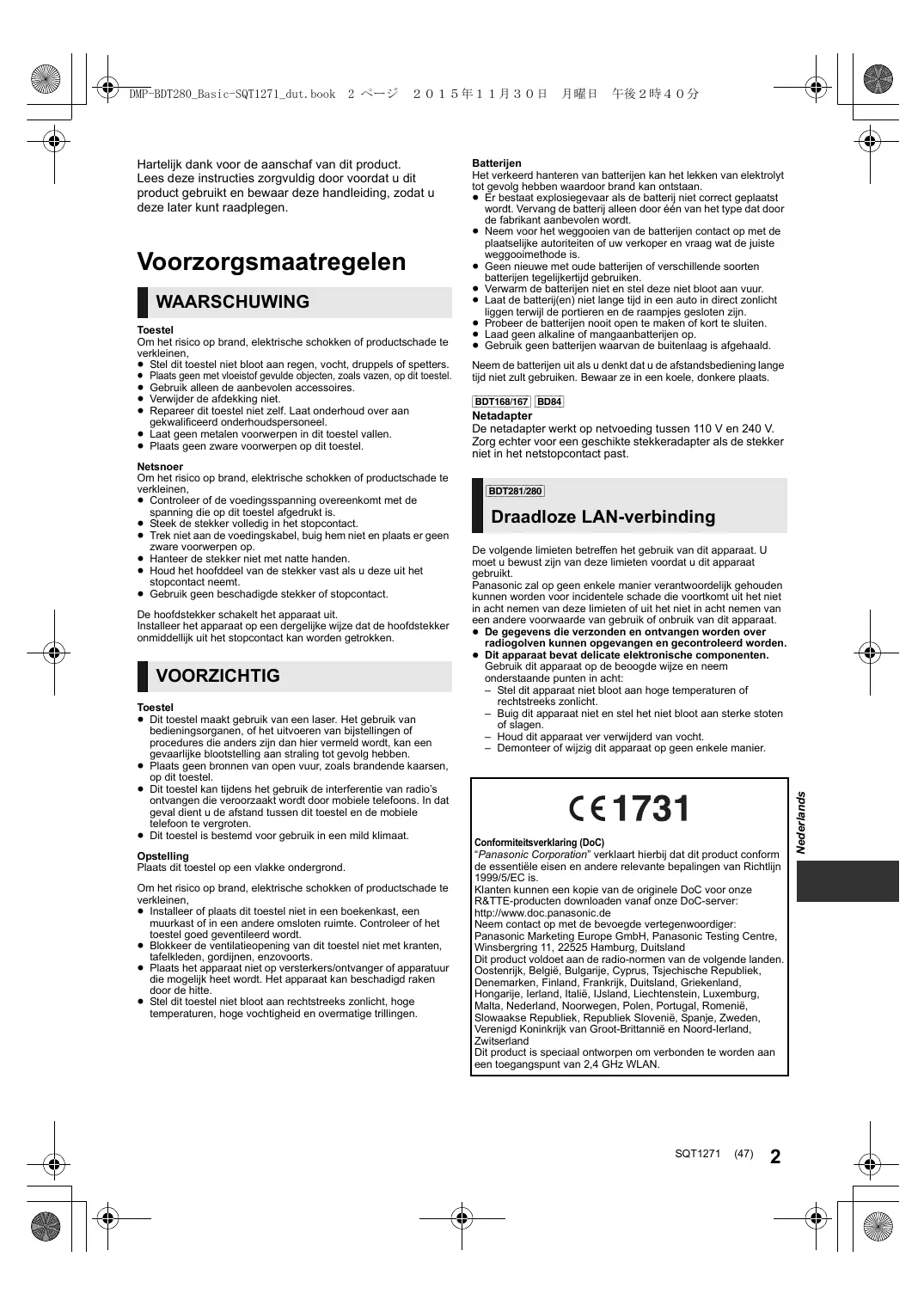 Batterijen Het verkeerd hanteren van batterijen kan het lekken van elektrolyt tot gevolg hebben waardoor brand kan ontstaan. ≥ Er bestaat explosiegevaar als de batterij niet correct geplaatst wordt. Vervang de batterij alleen door één van het type dat door de fabrikant aanbevolen wordt. ≥ Neem voor het weggooien van de batterijen contact op met de plaatselijke autoriteiten of uw verkoper en vraag wat de juiste weggooimethode is. ≥ Geen nieuwe met oude batterijen of verschillende soorten batterijen tegelijkertijd gebruiken. ≥ Verwarm de batterijen niet en stel deze niet bloot aan vuur. ≥ Laat de batterij(en) niet lange tijd in een auto in direct zonlicht liggen terwijl de portieren en de raampjes gesloten zijn. ≥ Probeer de batterijen nooit open te maken of kort te sluiten. ≥ Laad geen alkaline of mangaanbatterijen op. ≥ Gebruik geen batterijen waarvan de buitenlaag is afgehaald. Neem de batterijen uit als u denkt dat u de afstandsbediening lange tijd niet zult gebruiken. Bewaar ze in een koele, donkere plaats. [BDT168/167] [BD84] Netadapter De netadapter werkt op netvoeding tussen 110 V en 240 V. Zorg echter voor een geschikte stekkeradapter als de stekker niet in het netstopcontact past. [BDT281/280] Draadloze LAN-verbinding De volgende limieten betreffen het gebruik van dit apparaat. U moet u bewust zijn van deze limieten voordat u dit apparaat gebruikt. Panasonic zal op geen enkele manier verantwoordelijk gehouden kunnen worden voor incidentele schade die voortkomt uit het niet in acht nemen van deze limieten of uit het niet in acht nemen van een andere voorwaarde van gebruik of onbruik van dit apparaat. ≥ De gegevens die verzonden en ontvangen worden over radiogolven kunnen opgevangen en gecontroleerd worden. ≥ Dit apparaat bevat delicate elektronische componenten. Gebruik dit apparaat op de beoogde wijze en neem onderstaande punten in acht: – Stel dit apparaat niet bloot aan hoge temperaturen of rechtstreeks zonlicht. – Buig dit apparaat niet en stel het niet bloot aan sterke stoten of slagen. – Houd dit apparaat ver verwijderd van vocht. – Demonteer of wijzig dit apparaat op geen enkele manier. Conformiteitsverklaring (DoC) “Panasonic Corporation” verklaart hierbij dat dit product conform de essentiële eisen en andere relevante bepalingen van Richtlijn 1999/5/EC is. Klanten kunnen een kopie van de originele DoC voor onze R&TTE-producten downloaden vanaf onze DoC-server: http://www.doc.panasonic.de Neem contact op met de bevoegde vertegenwoordiger: Panasonic Marketing Europe GmbH, Panasonic Testing Centre, Winsbergring 11, 22525 Hamburg, Duitsland Dit product voldoet aan de radio-normen van de volgende landen. Oostenrijk, België, Bulgarije, Cyprus, Tsjechische Republiek, Denemarken, Finland, Frankrijk, Duitsland, Griekenland, Hongarije, Ierland, Italië, IJsland, Liechtenstein, Luxemburg, Malta, Nederland, Noorwegen, Polen, Portugal, Romenië, Slowaakse Republiek, Republiek Slovenië, Spanje, Zweden, Verenigd Koninkrijk van Groot-Brittannië en Noord-Ierland, Zwitserland Dit product is speciaal ontworpen om verbonden te worden aan een toegangspunt van 2,4 GHz WLAN. SQT1271 (47)