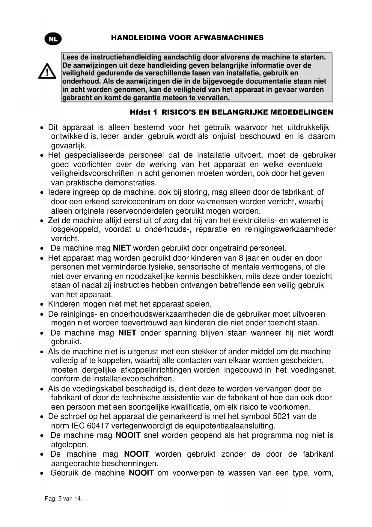 Lees de instructiehandleiding aandachtig door alvorens de machine te starten. De aanwijzingen uit deze handleiding geven belangrijke informatie over de veiligheid gedurende de verschillende fasen van installatie, gebruik en onderhoud. Als de aanwijzingen die in de bijgevoegde documentatie staan niet in acht worden genomen, kan de veiligheid van het apparaat in gevaar worden gebracht en komt de garantie meteen te vervallen. Hfdst 1 RISICO'S EN BELANGRIJKE MEDEDELINGEN Dit apparaat is alleen bestemd voor het gebruik waarvoor het uitdrukkelijk ontwikkeld is. Ieder ander gebruik wordt als onjuist beschouwd en is daarom gevaarlijk. Het gespecialiseerde personeel dat de installatie uitvoert, moet de gebruiker goed voorlichten over de werking van het apparaat en welke eventuele veiligheidsvoorschriften in acht genomen moeten worden, ook door het geven van praktische demonstraties. Iedere ingreep op de machine, ook bij storing, mag alleen door de fabrikant, of door een erkend servicecentrum en door vakmensen worden verricht, waarbij alleen originele reserveonderdelen gebruikt mogen worden. Zet de machine altijd eerst uit of zorg dat hij van het elektriciteits- en waternet is losgekoppeld, voordat u onderhouds-, reparatie en reinigingswerkzaamheden verricht. De machine mag NIET worden gebruikt door ongetraind personeel. Het apparaat mag worden gebruikt door kinderen van 8 jaar en ouder en door personen met verminderde fysieke, sensorische of mentale vermogens, of die niet over ervaring en noodzakelijke kennis beschikken, mits deze onder toezicht staan of nadat zij instructies hebben ontvangen betreffende een veilig gebruik van het apparaat. Kinderen mogen niet met het apparaat spelen. De reinigings- en onderhoudswerkzaamheden die de gebruiker moet uitvoeren mogen niet worden toevertrouwd aan kinderen die niet onder toezicht staan. De machine mag NIET onder spanning blijven staan wanneer hij niet wordt gebruikt. Als de machine niet is uitgerust met een stekker of ander middel om de machine volledig af te koppelen, waarbij alle contacten van elkaar worden gescheiden, moeten dergelijke afkoppelinrichtingen worden ingebouwd in het voedingsnet, conform de installatievoorschriften. Als de voedingskabel beschadigd is, dient deze te worden vervangen door de fabrikant of door de technische assistentie van de fabrikant of hoe dan ook door een persoon met een soortgelijke kwalificatie, om elk risico te voorkomen. De schroef op het apparaat die gemarkeerd is met het symbool 5021 van de norm IEC 60417 vertegenwoordigt de equipotentiaalaansluiting. De machine mag NOOIT snel worden geopend als het programma nog niet is afgelopen. De machine mag NOOIT worden gebruikt zonder de door de fabrikant aangebrachte beschermingen. Gebruik de machine NOOIT om voorwerpen te wassen van een type, vorm,HANDLEIDING VOOR AFWASMACHINES Pag. 3 van 14