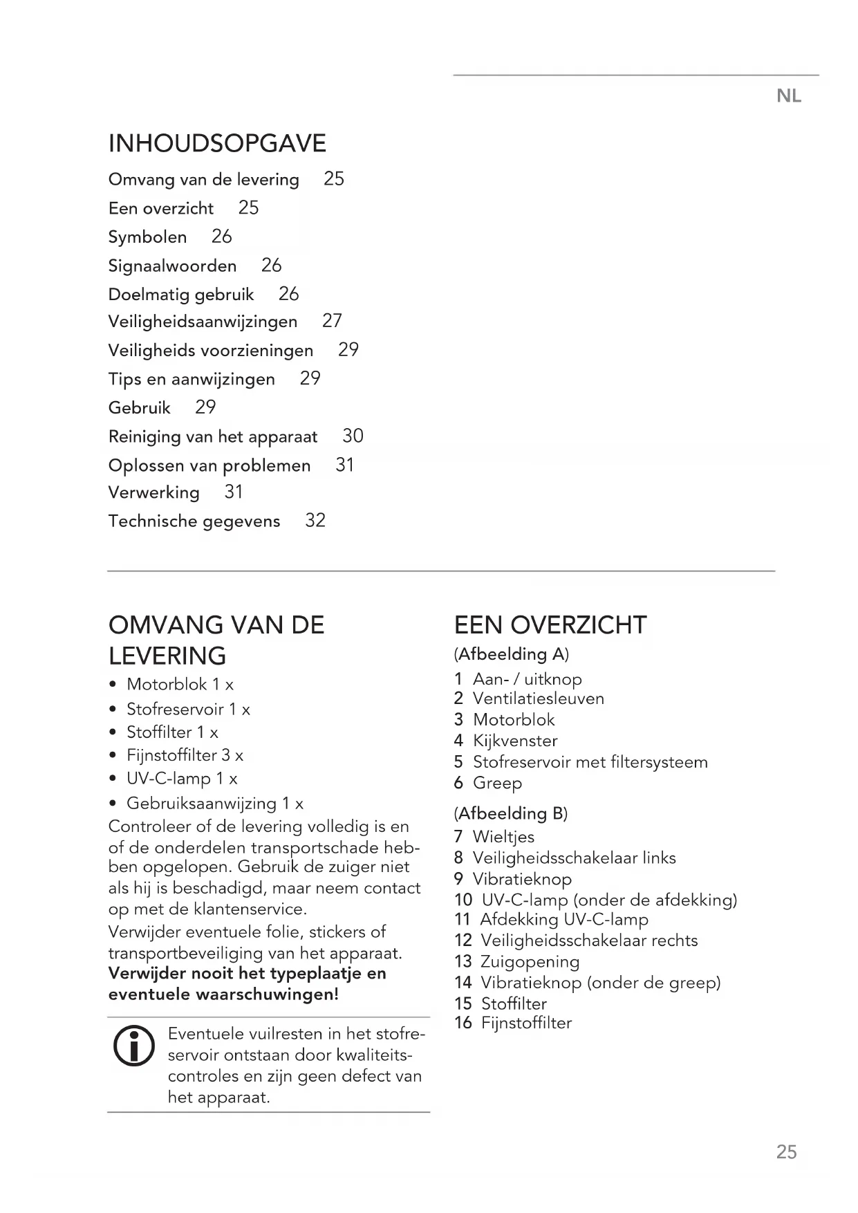 Eventuele vuilresten in het stofre- servoir ontstaan door kwaliteits- controles en zijn geen defect van het apparaat. EEN OVERZICHT (Afbeelding A) 1 Aan- / uitknop 2 Ventilatiesleuven 3 Motorblok 4 Kijkvenster 5 Stofreservoir met filtersysteem 6 Greep (Afbeelding B) 7 Wieltjes 8 Veiligheidsschakelaar links 9 Vibratieknop 10 UV-C-lamp (onder de afdekking) 11 Afdekking UV-C-lamp 12 Veiligheidsschakelaar rechts 13 Zuigopening 14 Vibratieknop (onder de greep) 15 Stoffilter 16 FijnstoffilterNL