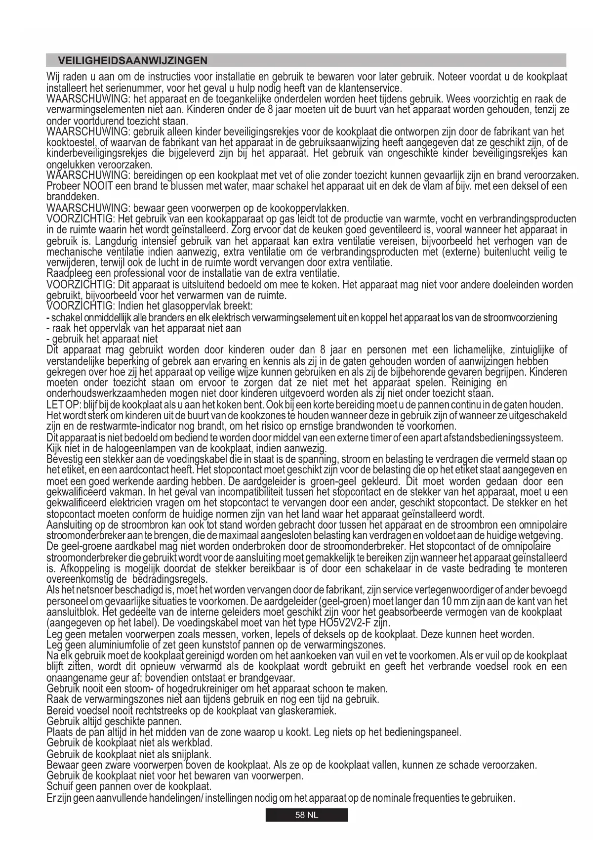 flexibel staal. Belangrijk: controleer nadat u alle installatie handelingen heeft verricht de aansluitpunten op een goede afsluiting. Gebruik hiervoor een zeepsopje. Nooit een vlam. Controleer ook of de flexibele slang niet in aanraking komt met bewegende delen van de keukenmeubelen zoals een lade zodat de slang wordt beschadigd. Let op: als u een gasgeur ruikt die uit het toestel lijkt te komen, schakel dan onmiddellijk de gastoevoer dicht en bel een gekwalificeerde persoon. Ga niet op zoek naar een lek met een vlam. Wanneer die voedingskabel beschadigd is, dient deze vervangen te worden door een erkende reparateur, om onnodige risico's te vermijden. De aarde-draad (groen en geel van kleur) moet ten minste 10 mm langer zijn dan de beide andere draden. De doorsnee van de kabel moet in een goede verhouding staan tot de maximale aansluitwaarde van de kookplaat. Zie voor de netspanningsgegevens het typeplaatje op de kookplaat en controleer of het nieuwe netsnoer van het type H05 V2V2-F is. In het onwaarschijnlijke geval dat een scheur zou verschijnen op het glas, haal onmiddellijk de stekker uit het contact en neem contact op met de klantenservice. Het apparaat is niet bedoeld voor gebruik met een externe timer of afstandsbediening.