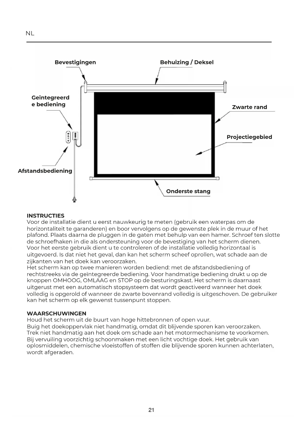 O controlador não responde: Verifique a alimentação. O controlador funciona, mas o controle remoto não: Consulte o passo de emparelhamento para copiar o sinal do controle remoto. Funciona apenas para subir ou descer: Verifique a conexão de acordo com as instruções da tela. A distância de controle é curta ou irregular: Troque a bateria (23A 12V). O motor não funciona: Verifique a conexão dos fios. 20NL INSTRUCTIES Voor de installatie dient u eerst nauwkeurig te meten (gebruik een waterpas om de horizontaliteit te garanderen) en boor vervolgens op de gewenste plek in de muur of het plafond. Plaats daarna de pluggen in de gaten met behulp van een hamer. Schroef ten slotte de schroefhaken in die als ondersteuning voor de bevestiging van het scherm dienen. Voor het eerste gebruik dient u te controleren of de installatie volledig horizontaal is uitgevoerd. Is dat niet het geval, dan kan het scherm scheef oprollen, wat schade aan de zijkanten van het doek kan veroorzaken. Het scherm kan op twee manieren worden bediend: met de afstandsbediening of rechtstreeks via de geïntegreerde bediening. Voor handmatige bediening drukt u op de knoppen OMHOOG, OMLAAG en STOP op de besturingskast. Het scherm is daarnaast uitgerust met een automatisch stopsysteem dat wordt geactiveerd wanneer het doek volledig is opgerold of wanneer de zwarte bovenrand volledig is uitgeschoven. De gebruiker kan het scherm op elk gewenst tussenpunt stoppen. WAARSCHUWINGEN Houd het scherm uit de buurt van hoge hittebronnen of open vuur. Buig het doekoppervlak niet handmatig, omdat dit blijvende sporen kan veroorzaken. Trek niet handmatig aan het doek om schade aan het motormechanisme te voorkomen. Bij vervuiling voorzichtig schoonmaken met een licht vochtige doek. Het gebruik van oplosmiddelen, chemische vloeistoffen of stoffen die blijvende sporen kunnen achterlaten, wordt afgeraden. Bevestigingen Behuizing / Deksel Zwarte rand Projectiegebied Onderste stang Geïntegreerd e bediening Afstandsbediening 21Afstandsbediening voor Elektromotor Installeert het bedradingsschema Bedradingsschema Alternator Kleur van de opwaartse draad: Bruin Kleur van de middelste draad: Blauw Kleur van de neerwaartse draad: Zwart Aardedraadkleur: Geel-Groen) TECHNISCHE GEGEVENS Ingang: 230VAC ±10% (50Hz) of 120VAC ±10% (60Hz) Uitgang: stroom naar motor: ≤3A (230VAC of 120VAC) Maximale effectieve tijd per druk op knop: 120 seconden. Indien overschreden, schakelt de controller de motorstroom uit Werkfrequentie: RF 315MHz of 433,9MHz; IR 38kHz Afstandsbediening bereik: RF ≤20m; IR ≤10m, ±15° horizontaal Maximaal aantal afstandsbedieningen per scherm: ≤40 stuks NORMALE BEDIENING Wanneer het scherm op stroom wordt aangesloten, brandt de aan/uit-LED op de controller. Druk op de "Omhoog"-knop, u hoort “du-” en het scherm gaat omhoog. Druk op de "Omlaag"-knop, u hoort “du-” en het scherm gaat omlaag. Druk op de "Stop"-knop, u hoort “du-” en het scherm stopt. CONTROLLER AFSTANDSBEDIENING 22Garantie beleid Vereenvoudigde EU-conformiteitsverklaring Dit product voldoet aan de in het land van aankoop geldende garantiewetgeving. Als u een probleem hebt dat u niet kunt oplossen, moet u naar www.prixton.com gaan en op de contactoptie klikken om ons uw assistentieformulier toe te sturen. Hierbij verklaart La Trastienda Digital SL, als eigenaar van het handelsmerk Prixton, en gevestigd in het Avenida Cervantes 49, módulo 25, Basauri 48970, Bizkaia, dat de radioapparatuur die hierna wordt beschreven: Strookt met Richtlijn 2014/53/EU van het Europees Parlement en de Raad van 16 april 2014. De volledige tekst van de EU-conformiteitsverklaring is te vinden op de volgende internetsite: www.prixton.com