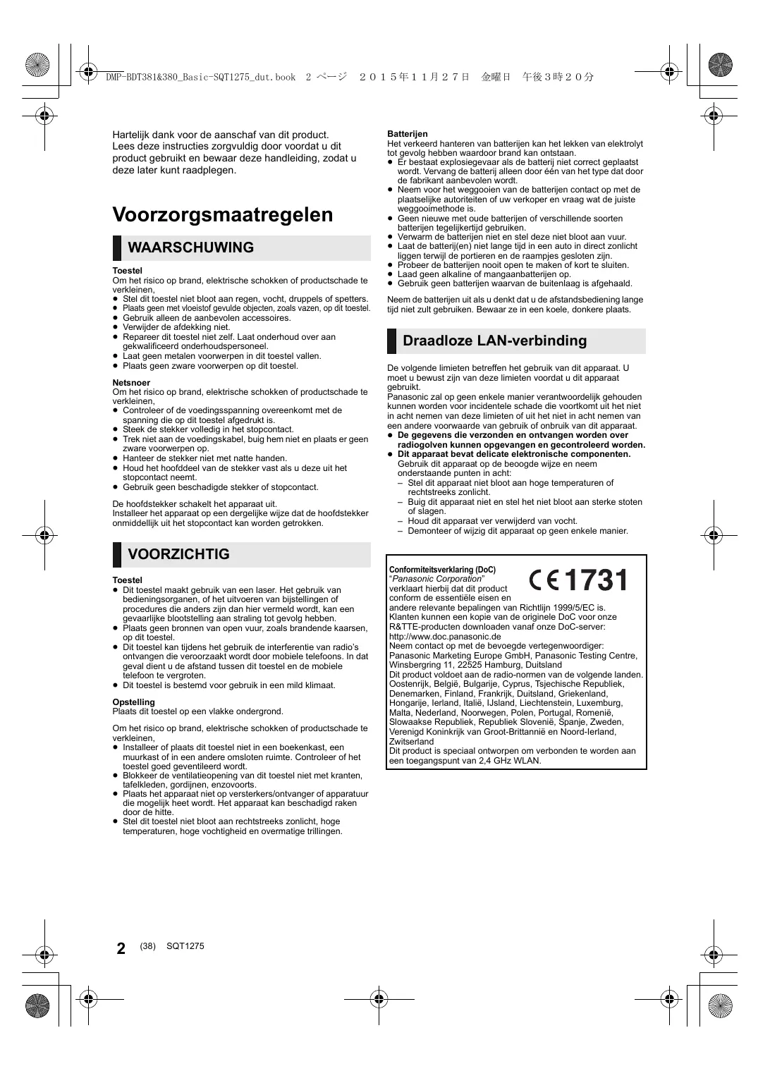Conformiteitsverklaring (DoC) “Panasonic Corporation” verklaart hierbij dat dit product conform de essentiële eisen en andere relevante bepalingen van Richtlijn 1999/5/EC is. Klanten kunnen een kopie van de originele DoC voor onze R&TTE-producten downloaden vanaf onze DoC-server: http://www.doc.panasonic.de Neem contact op met de bevoegde vertegenwoordiger: Panasonic Marketing Europe GmbH, Panasonic Testing Centre, Winsbergring 11, 22525 Hamburg, Duitsland Dit product voldoet aan de radio-normen van de volgende landen. Oostenrijk, België, Bulgarije, Cyprus, Tsjechische Republiek, Denemarken, Finland, Frankrijk, Duitsland, Griekenland, Hongarije, Ierland, Italië, IJsland, Liechtenstein, Luxemburg, Malta, Nederland, Noorwegen, Polen, Portugal, Romenië, Slowaakse Republiek, Republiek Slovenië, Spanje, Zweden, Verenigd Koninkrijk van Groot-Brittannië en Noord-Ierland, Zwitserland Dit product is speciaal ontworpen om verbonden te worden aan een toegangspunt van 2,4 GHz WLAN.
