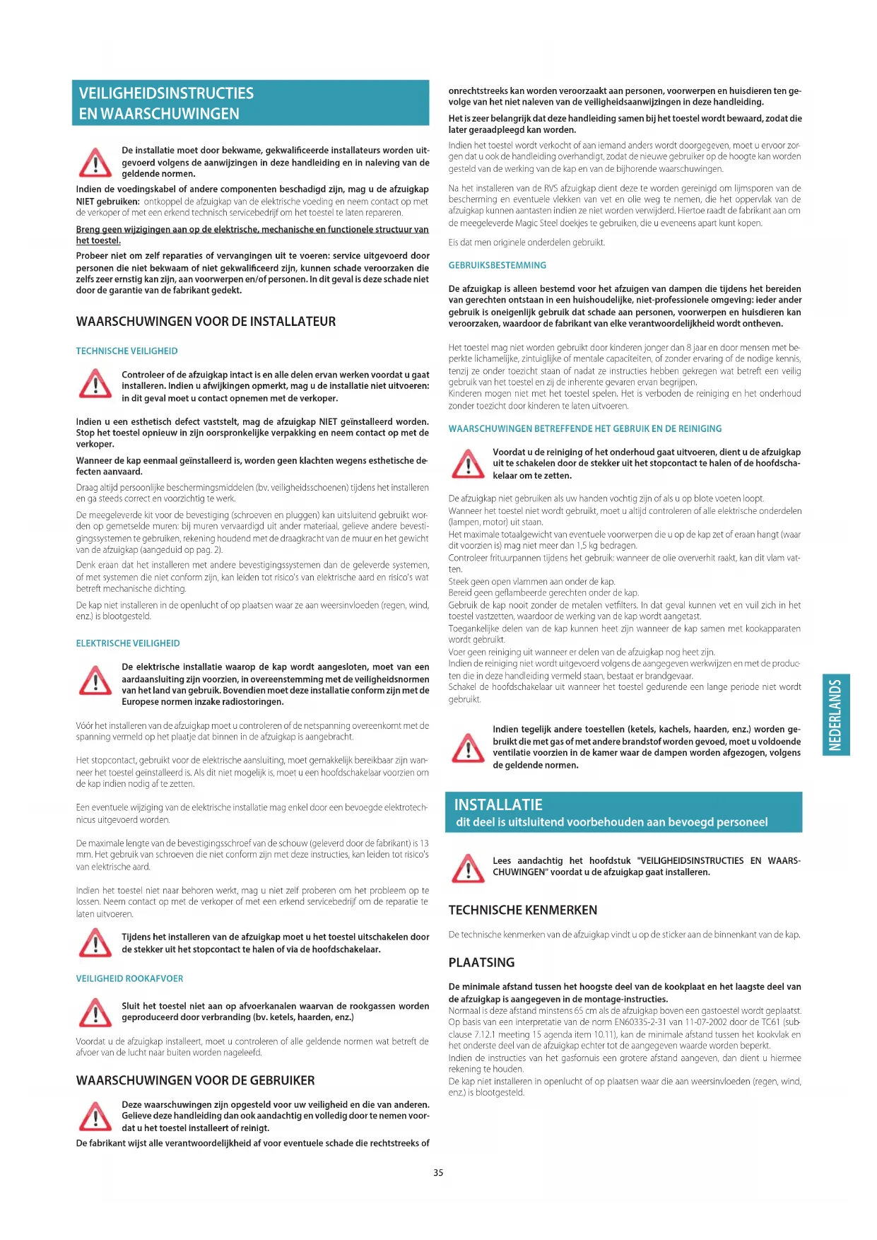 Deze waarschuwingen zijn opgesteld voor uw veiligheid en die van anderen. Gelieve deze handleiding dan ook aandachtig en volledig door te nemen voor- dat u het toestel installeert of reinigt. De fabrikant wijst alle verantwoordelijkheid af voor eventuele schade die rechtstreeks of onrechtstreeks kan worden veroorzaakt aan personen, voorwerpen en huisdieren ten ge- volge van het niet naleven van de veiligheidsaanwijzingen in deze handleiding. Het is zeer belangrijk dat deze handleiding samen bij het toestel wordt bewaard, zodat die later geraadpleegd kan worden. Indien het toestel wordt verkocht of aan iemand anders wordt doorgegeven, moet u ervoor zor