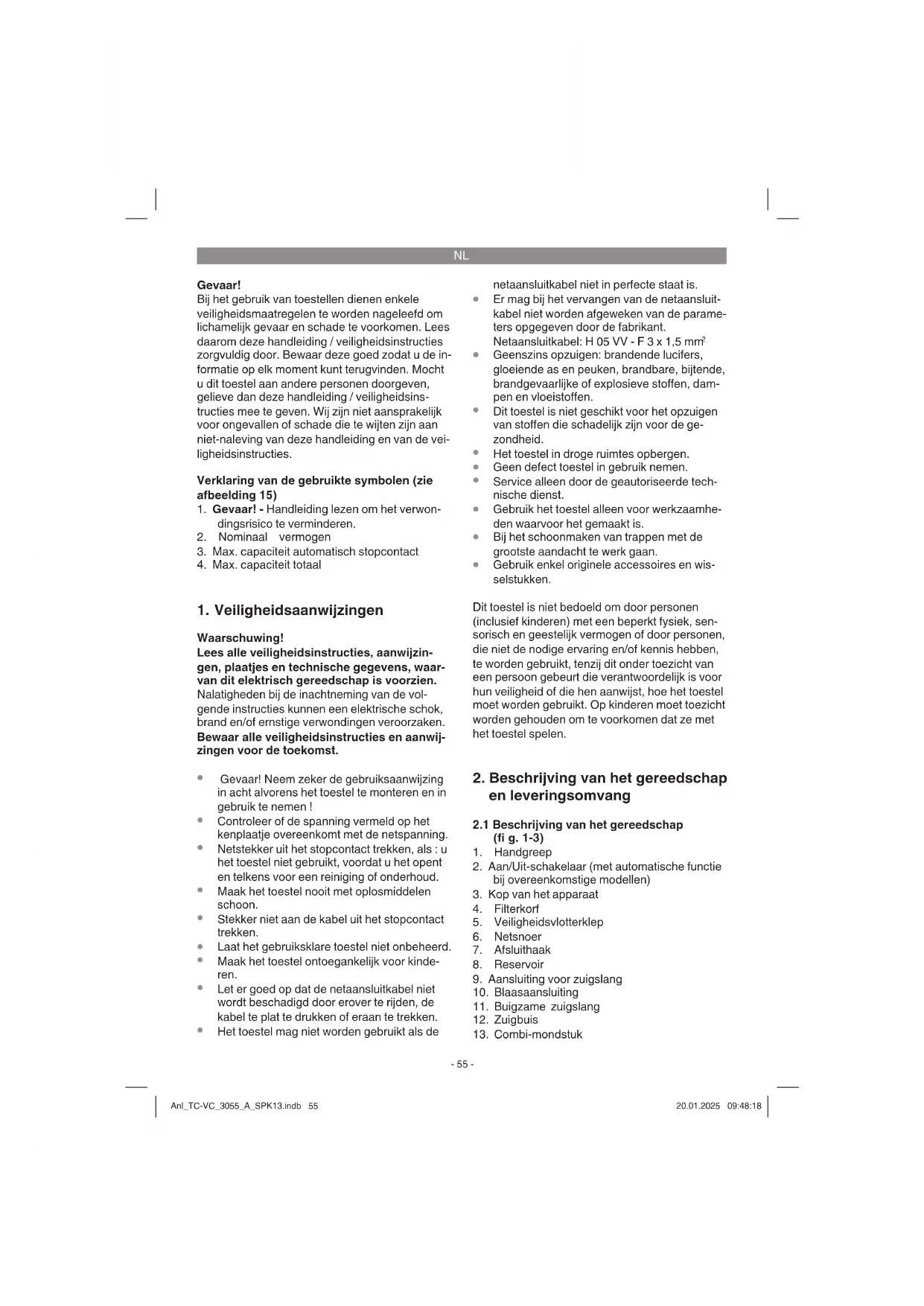 Gebruik voor het natzuigen het schuimstof fi lter (16) (zie punt 5.2). Let er altijd op dat het fi lter goed is bevestigd! Wateraftapplug (afbeelding 1) Om het reservoir (8) bij het natzuigen gemakkeli- jker te kunnen leegmaken is dit voorzien van een wateraftapplug (25). Open de wateraftapplug (25) door hem linksom te draaien en laat de vloeistof eruit lopen. Bij het natzuigen gaat de veiligheidsvlotterklep (5) dicht zodra het maximale vulniveau in het reser- voir is bereikt. Daarbij verandert het aanzuiggelu- id van het apparaat, het wordt luider. Schakel dan het apparaat uit en maak het reservoir leeg. Gevaar! De nat-/droogzuiger is niet geschikt voor het op- zuigen van brandbare vloeistoff en! Gebruik voor het natzuigen alleen het meegeleverde schuim- stof fi lter! Anl_TC-VC_3055_A_SPK13.indb 57Anl_TC-VC_3055_A_SPK13.indb 57 20.01.2025 09:48:1820.01.2025 09:48:18NL